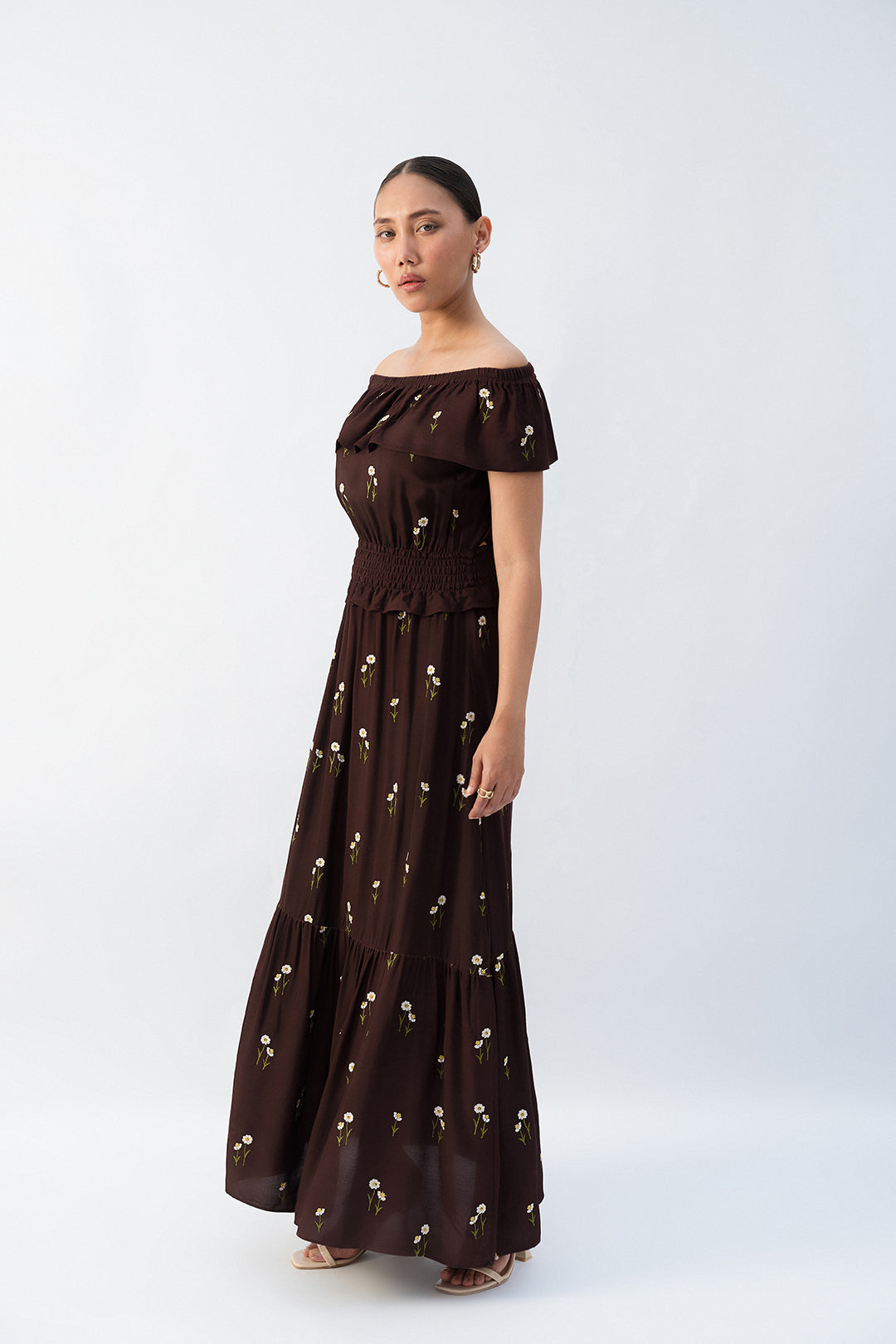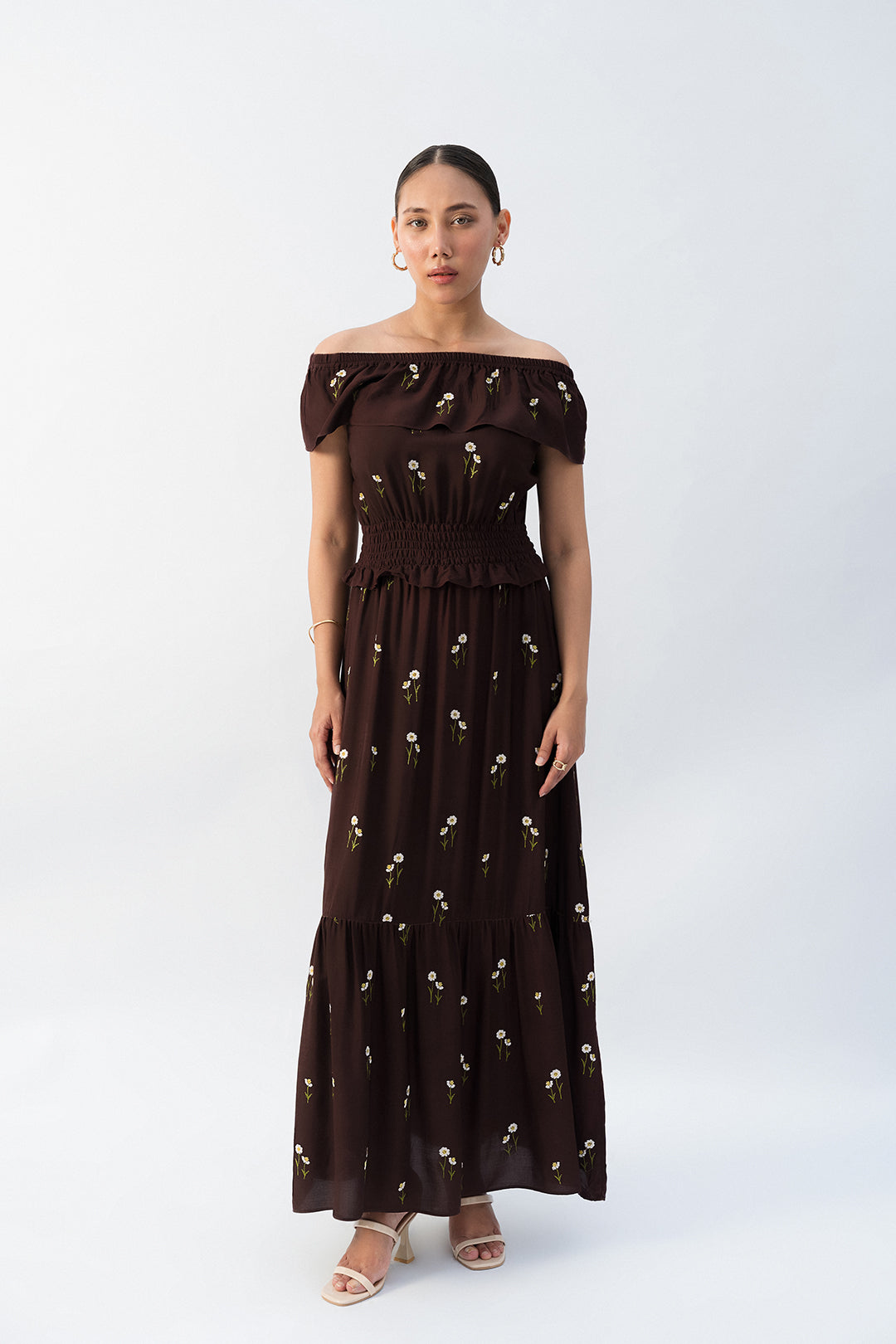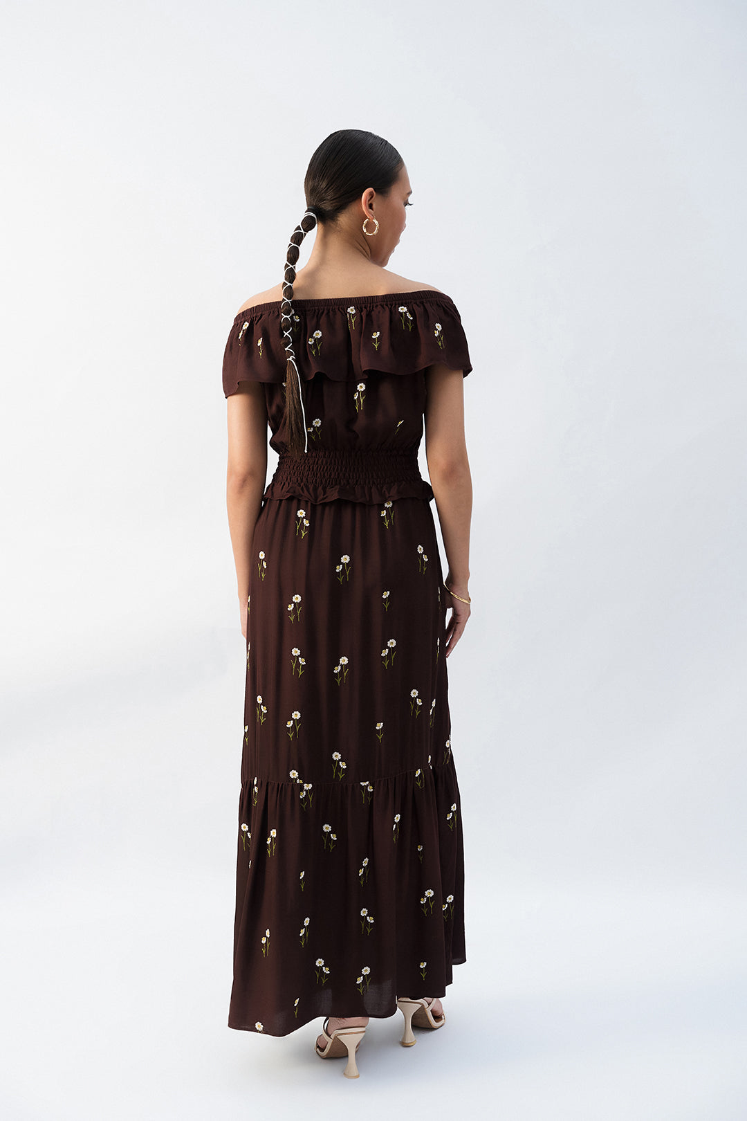 - This embroidered brown tier dress made in soft viscose fabric features cold shoulder elasticated neckline, smocking waist detail and flared bottom.