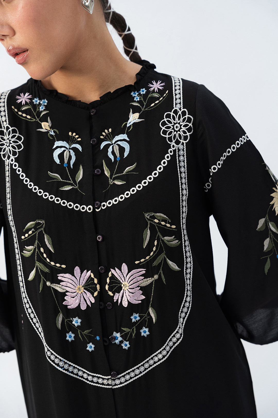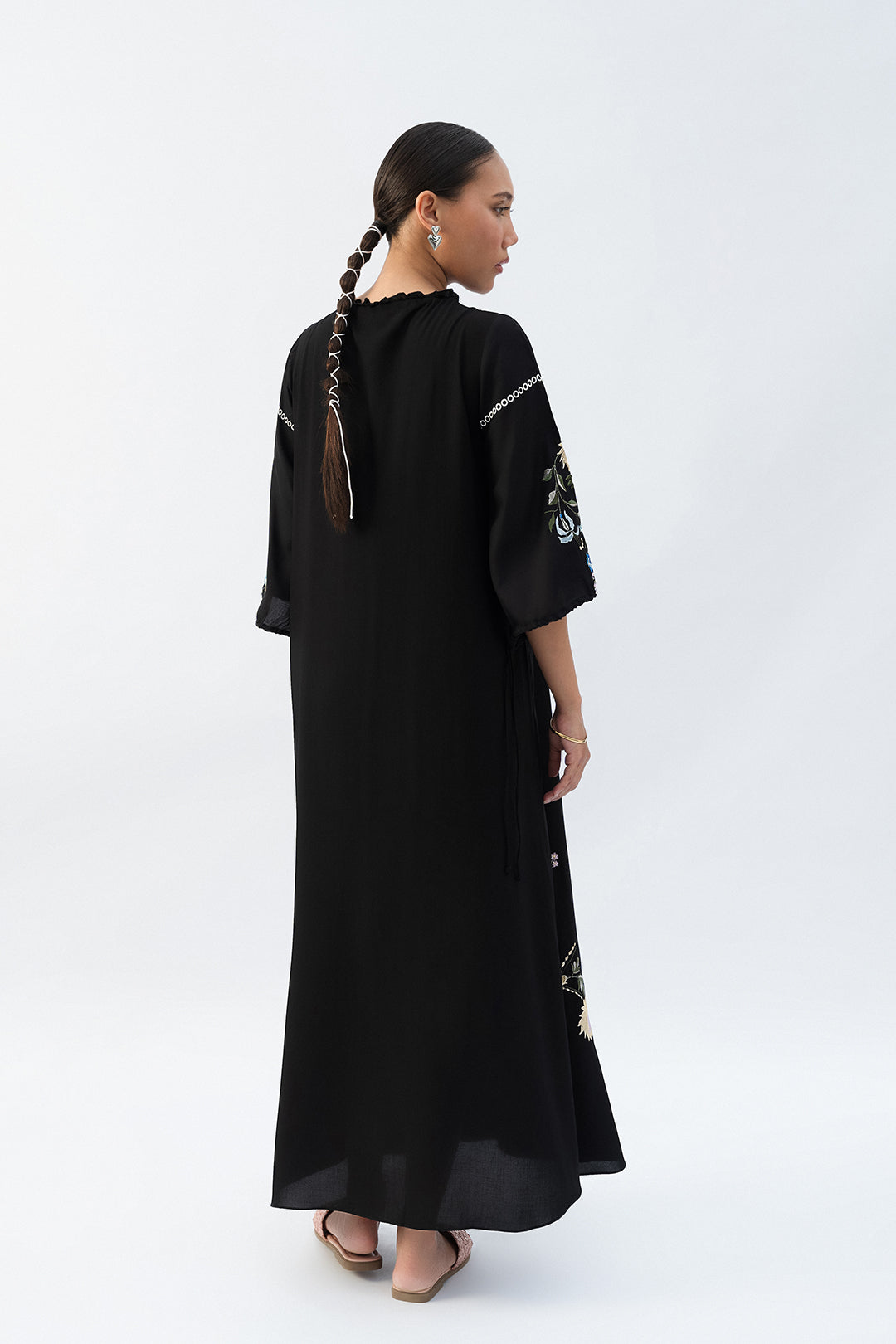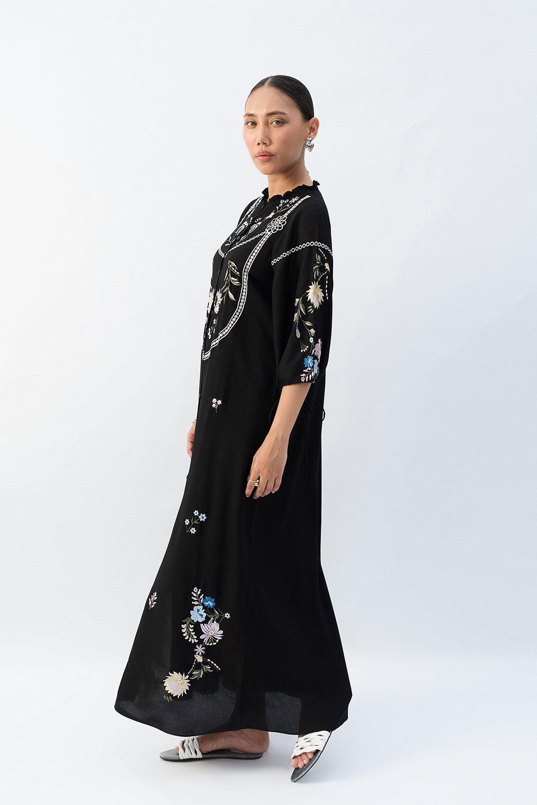 - This black embroidered button down dress made in soft viscose fabric features crew neck with ruffle detail, front button closure with elasticated loops, three quarter sleeves with elasticated hem, side slits and round hem.