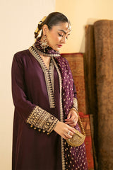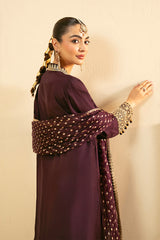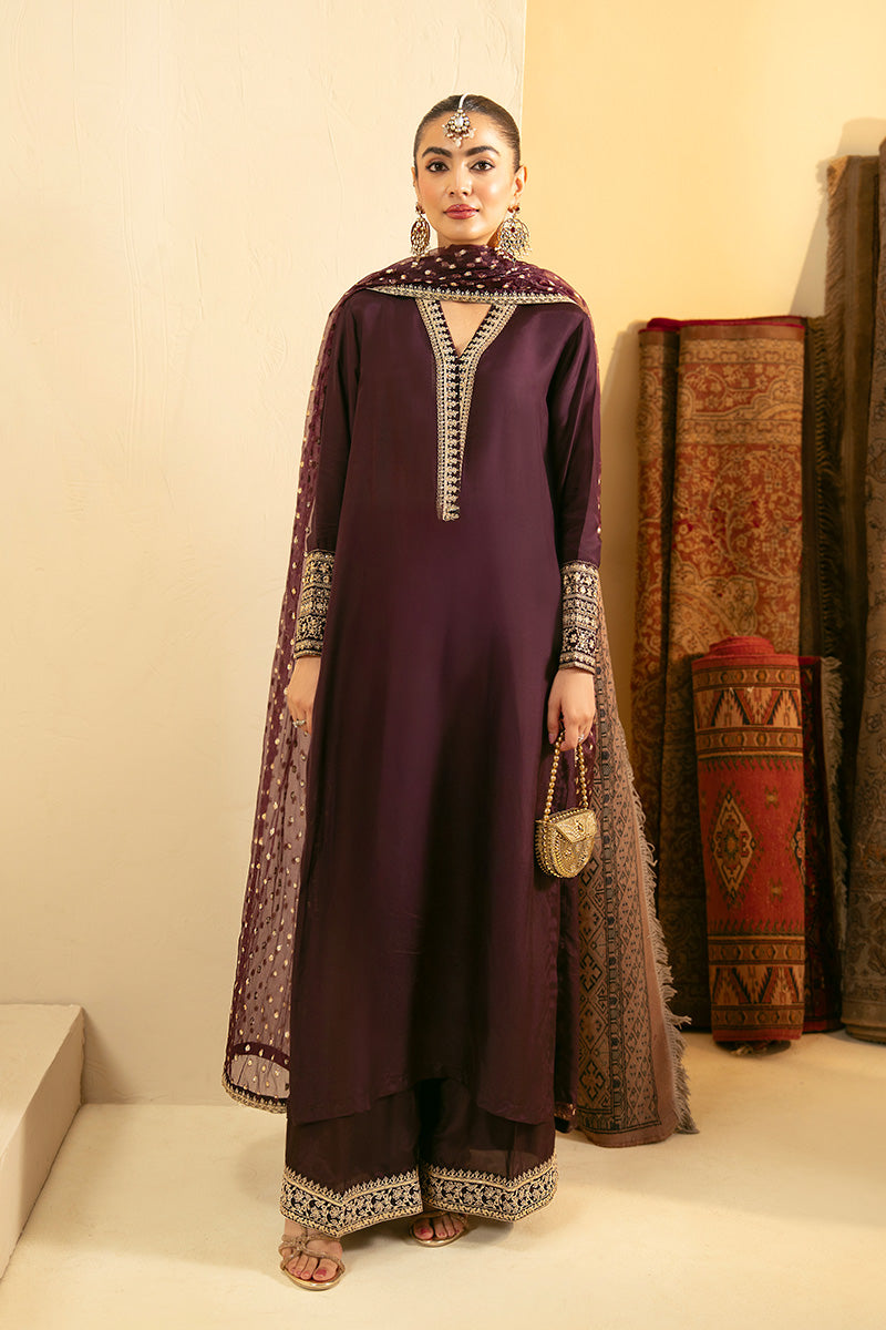 Step into festive charm with this elegant long shirt silhouette. Featuring an Indian V-neckline delicately adorned with tila work and cuff sleeves finished with fine embroidery, it radiates timeless sophistication. Paired with flared trousers featuring a sequin-detailed hem and a jacquard organza dupatta bordered with embroidery, this ensemble completes the look with effortless grace.
