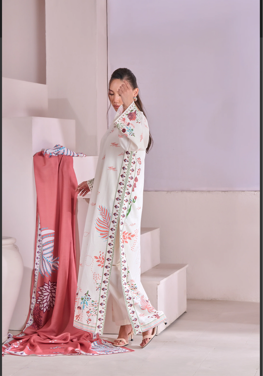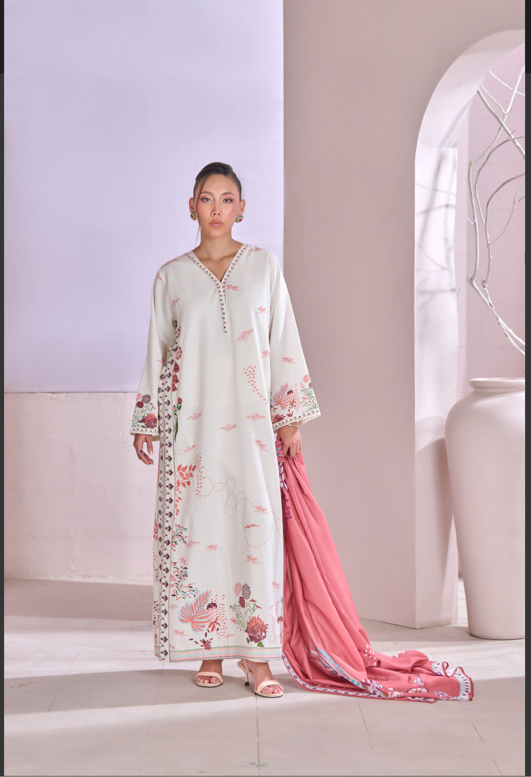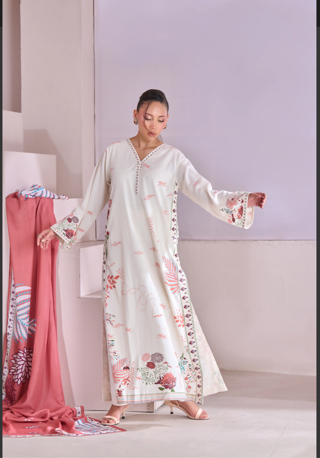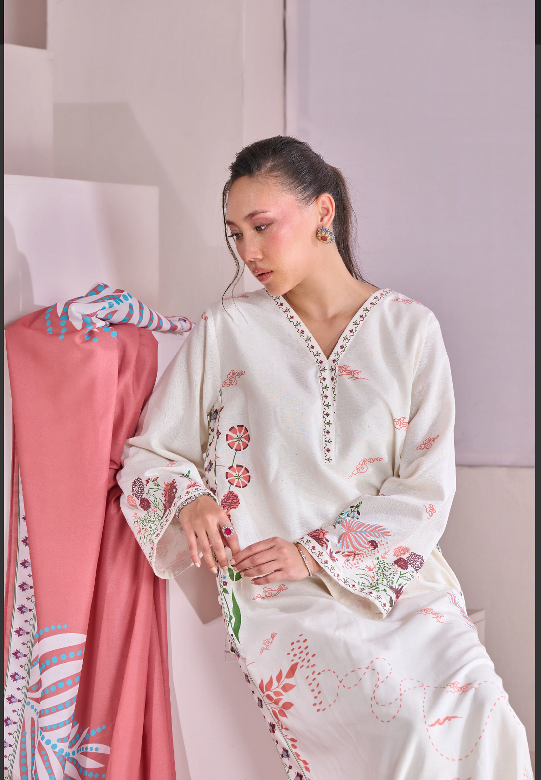 Description: This Off White Kaftaan shirt features a relaxed, comfortable fit with a contemporary floral screen print in soft shades of rust, peach, green, and hints of aqua. The delicate printed trim along the neckline and sides adds subtle definition, enhancing the silhouette while maintaining a flowing, effortless look. It’s a perfect blend of modern style and timeless grace.