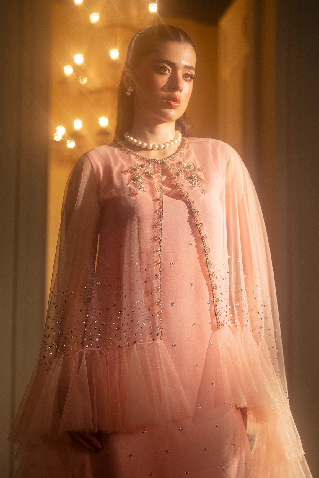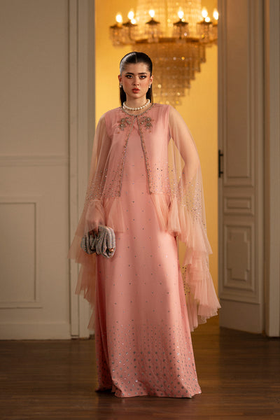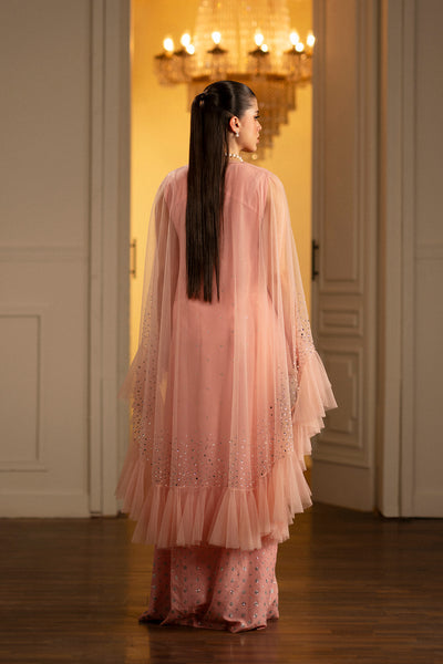 - This jewelled baby pink feminine Cape Set in a soft net fabric features hand embellished floral motives on the neck and a crystal ombre along the ruffled hem for all the fluttery flare. Paired with a sophisticated inner crepe dress with sparkling silver ombre florals, it's a certain head-turner.