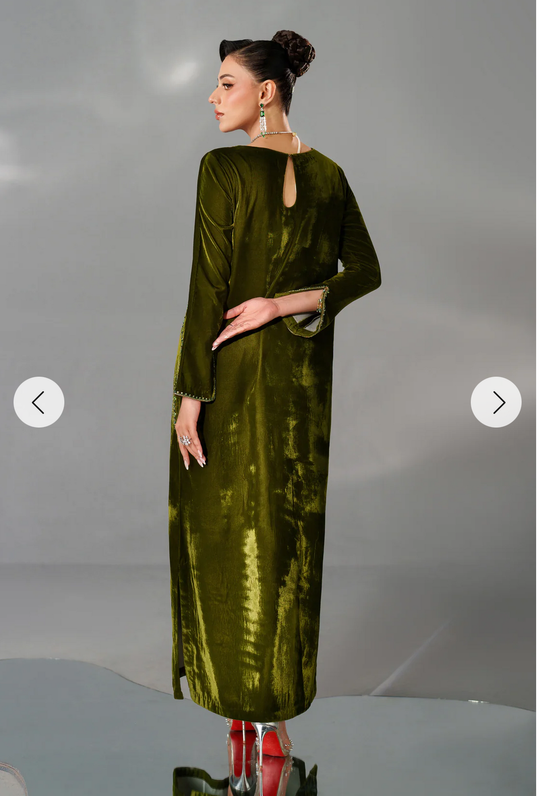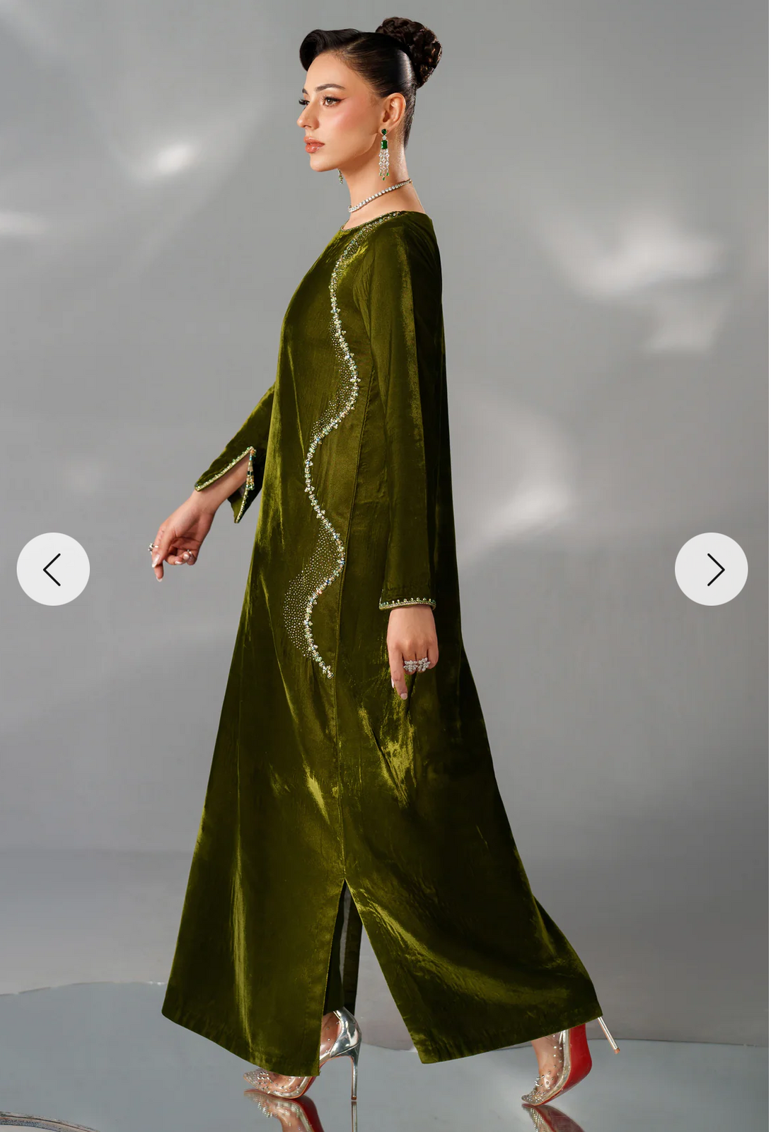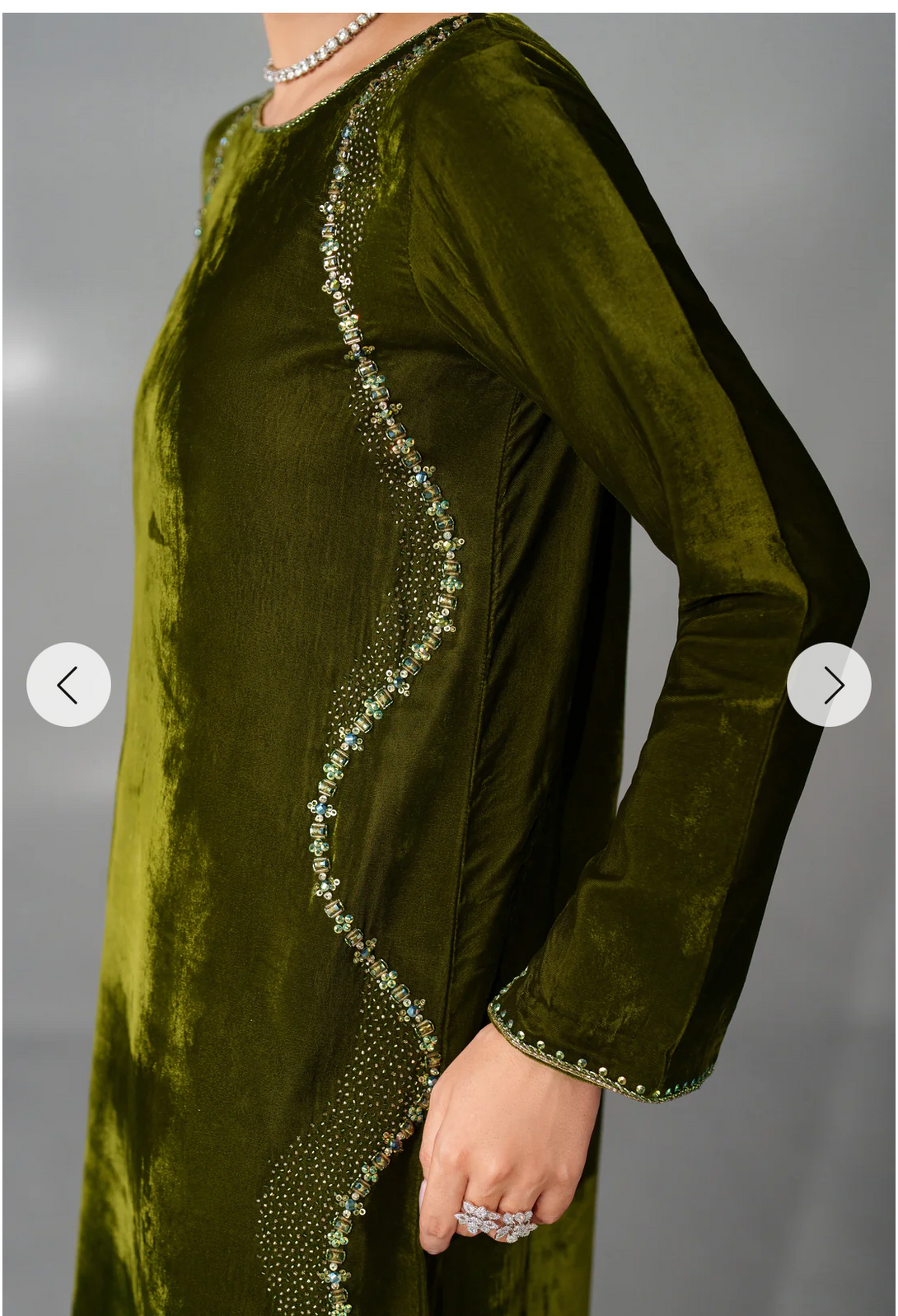 This elegant ensemble is crafted in luxurious China velvet, featuring intricate adda work on the shirt and sleeves for a timeless, refined look. Designed with a stylish neckline accented by a back keyhole, the silhouette offers a graceful balance of modern and classic detailing. The shirt is tailored with a mid seam and enhanced by delicate slits, creating effortless movement and sophistication. Paired with a straight trouser in premium raw silk, this outfit exudes understated luxury, making it a perfect choice for formal gatherings and evening occasions.