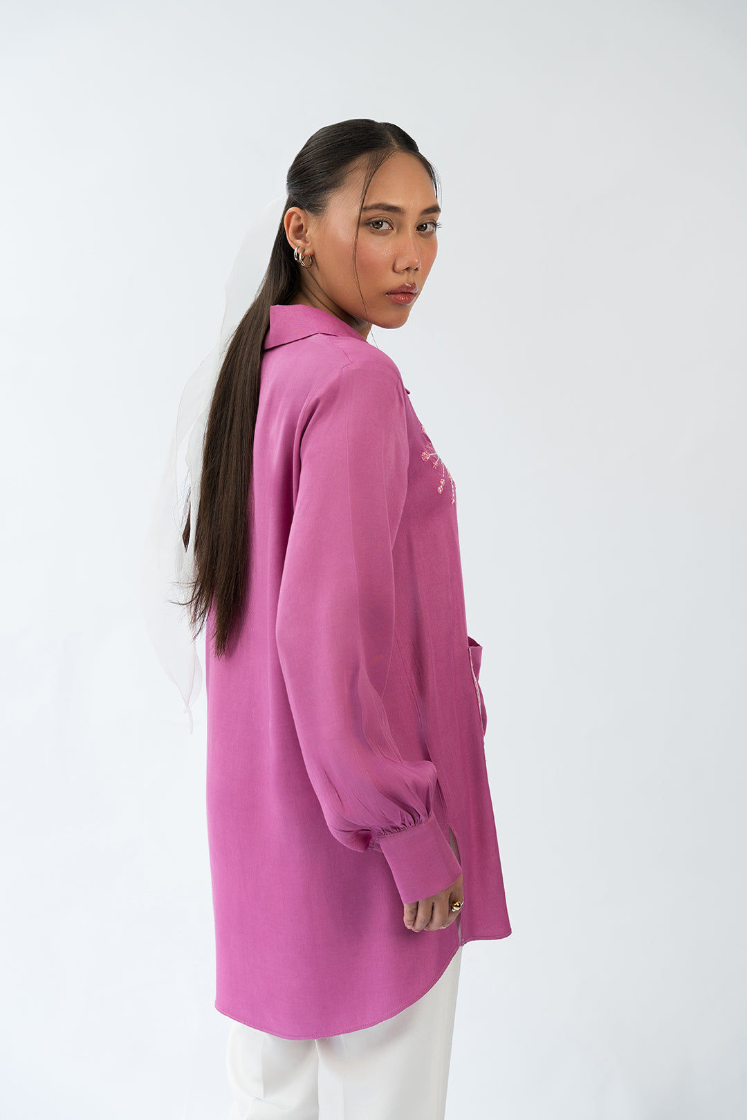 - This hand embroidered pink button down made in soft viscose fabric features one piece collar, front invisible placket with button closure, front pocket detail, full-length sleeves, cuff detail with button closure and hi-lo bottom.