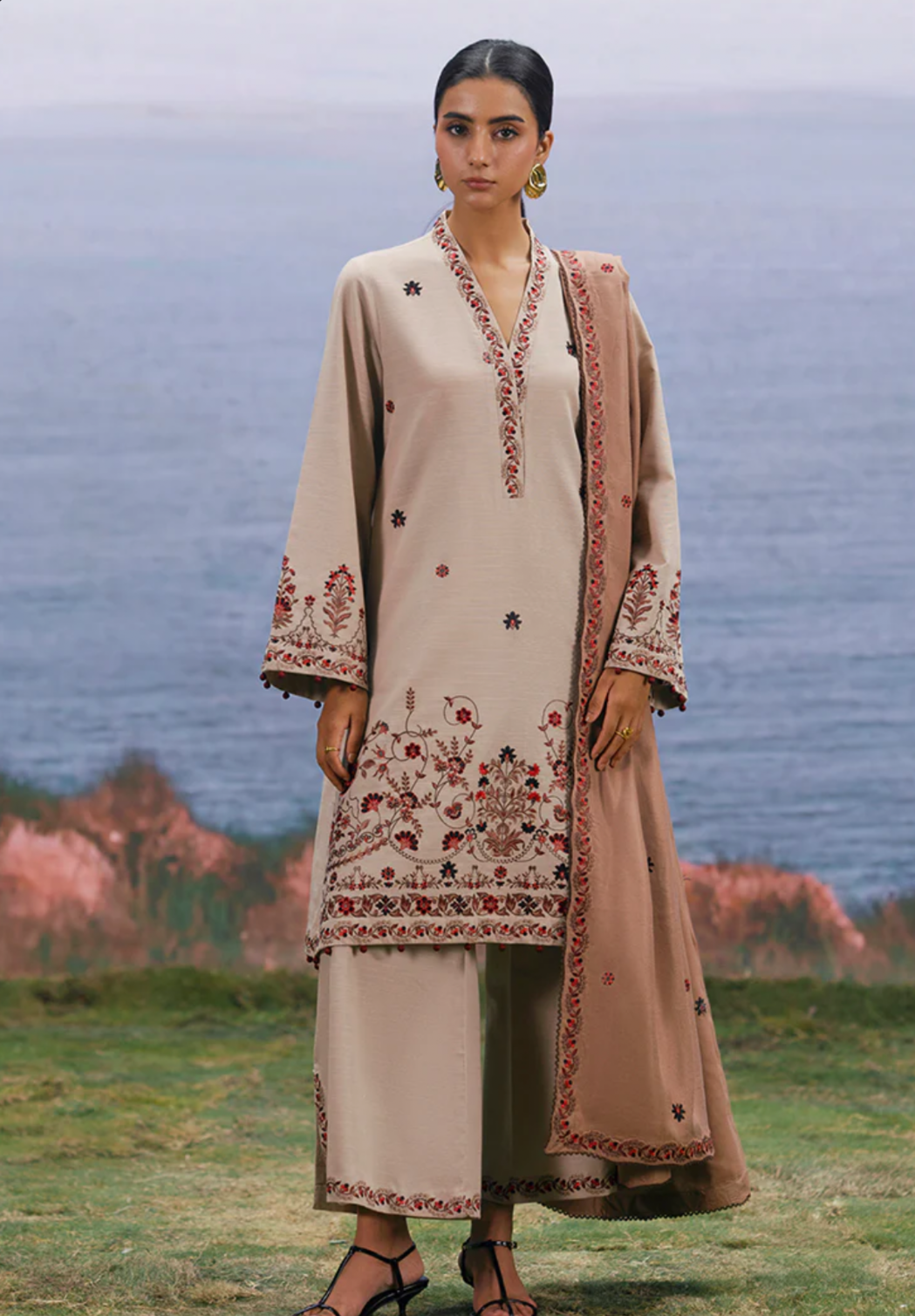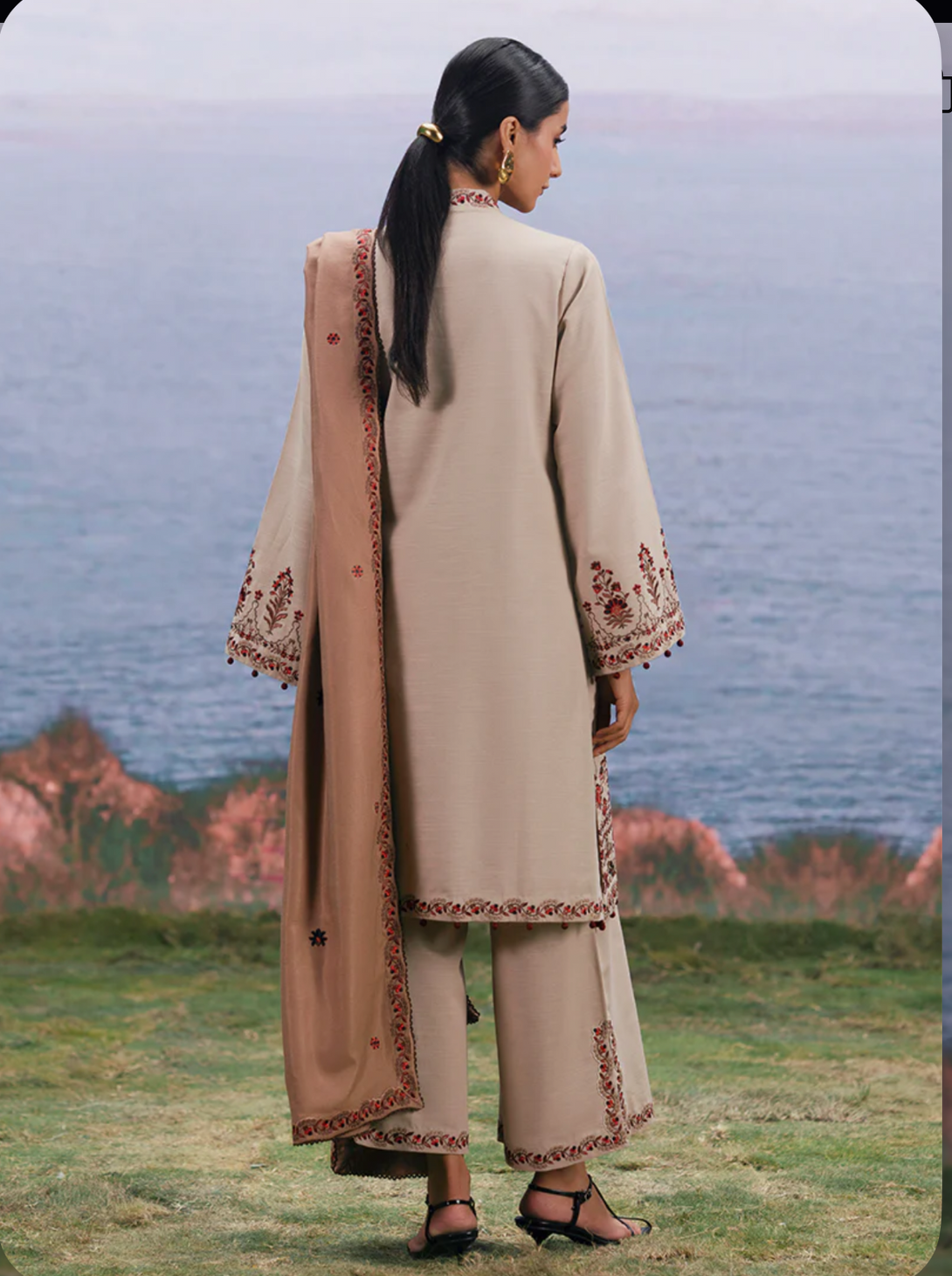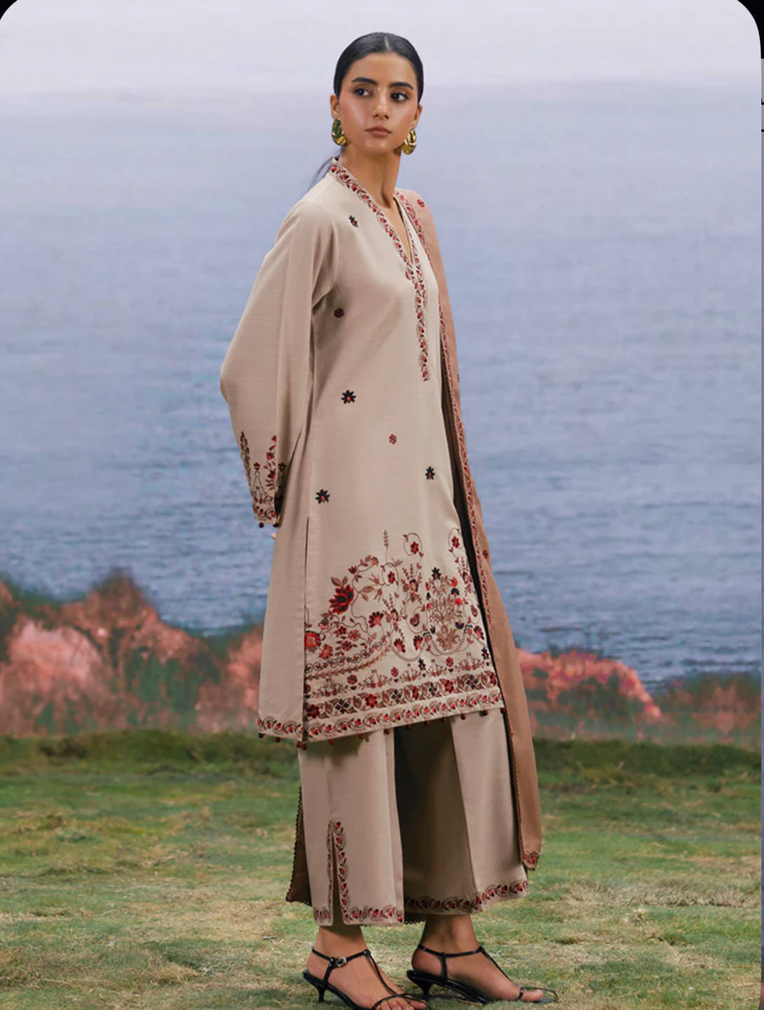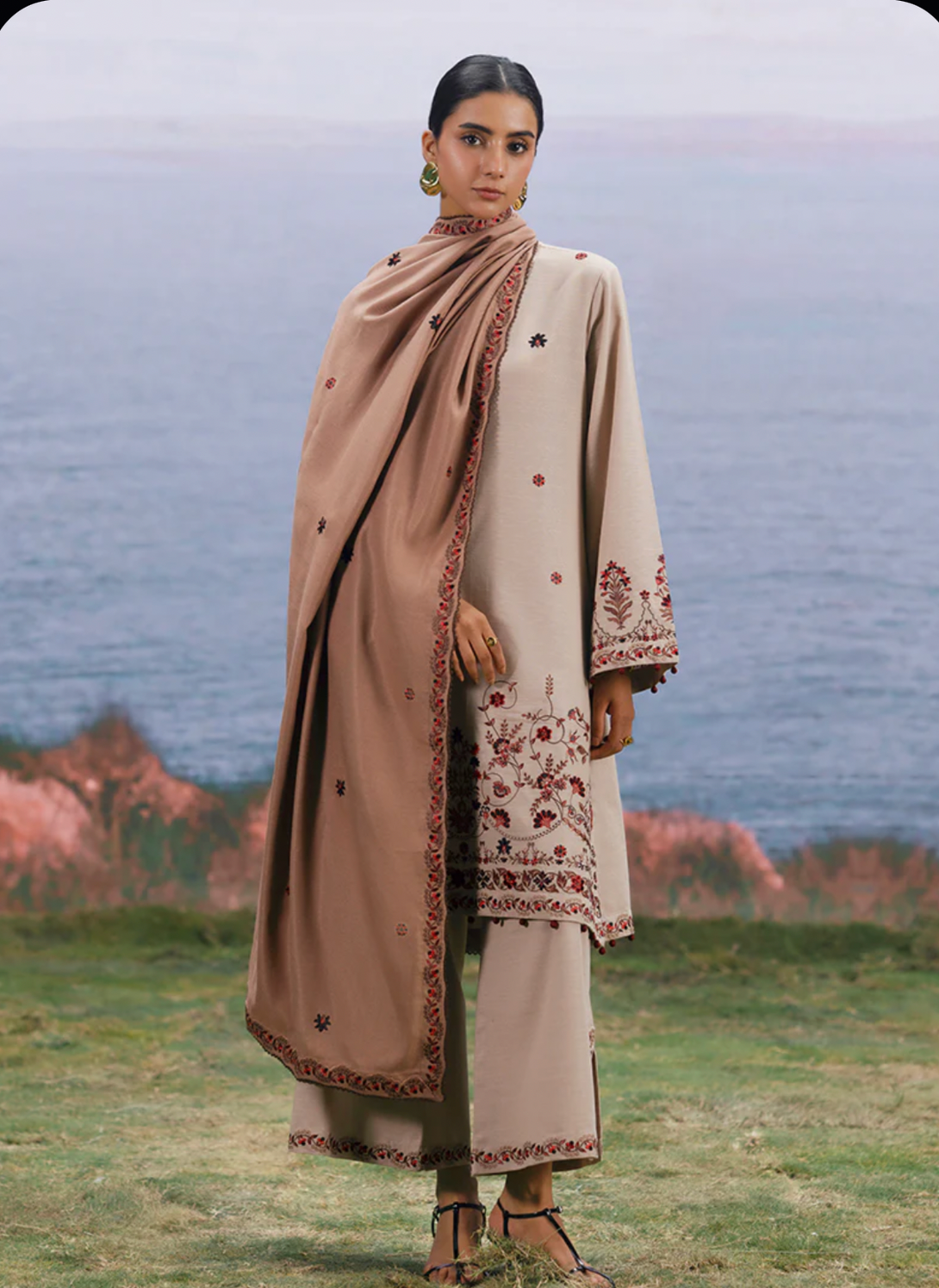 Aylinur in Beige/Brown from our Winterkari '25 Collection. An embroidered khaddar 3pc unstitched outfit paired with khaddar trousers & an acrylic shawl.