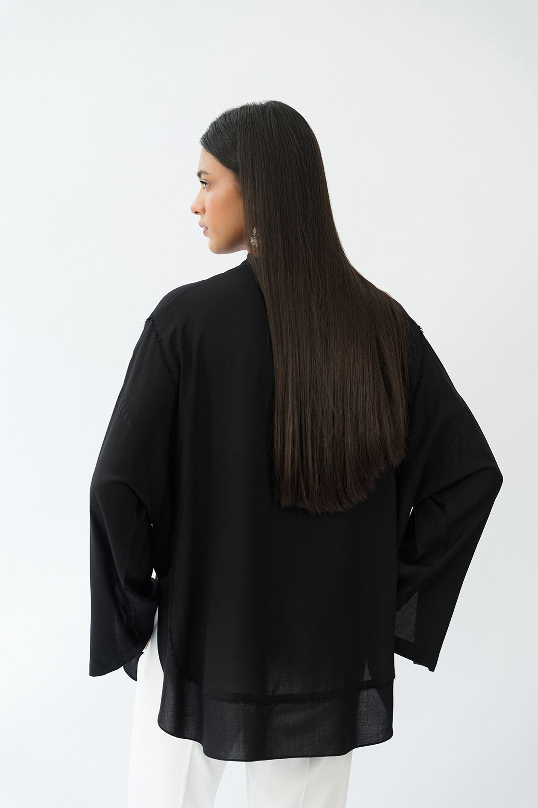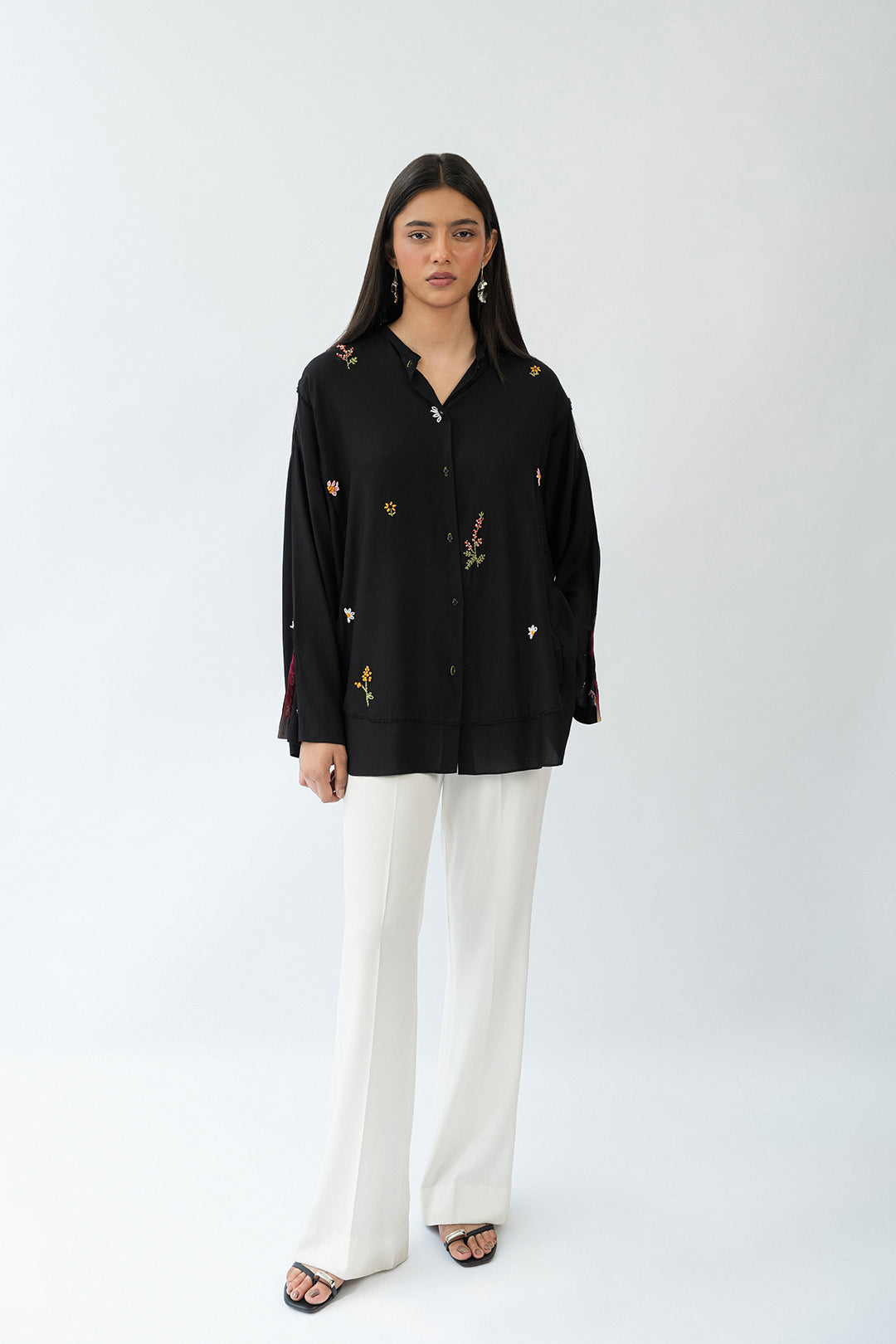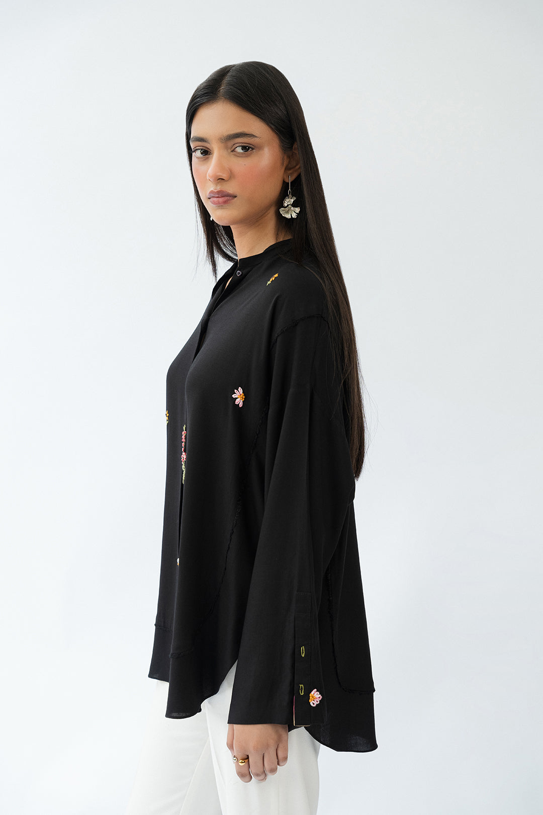 - This hand embroidered black button down made in soft viscose fabric features band collar, front placket with button closure, full-length sleeves with button closure, front bottom panel with frayed edges and round bottom.