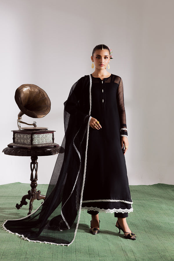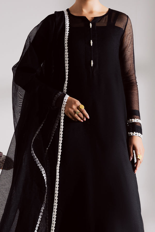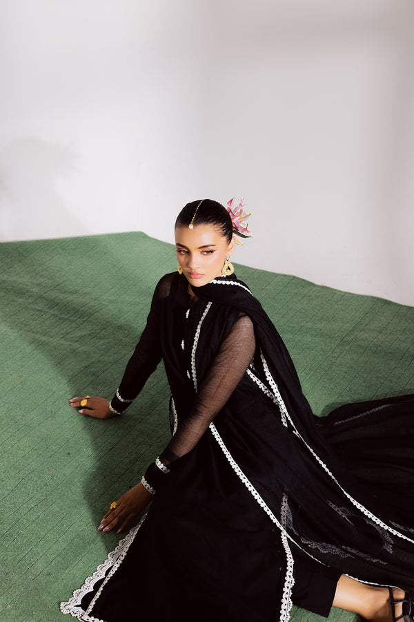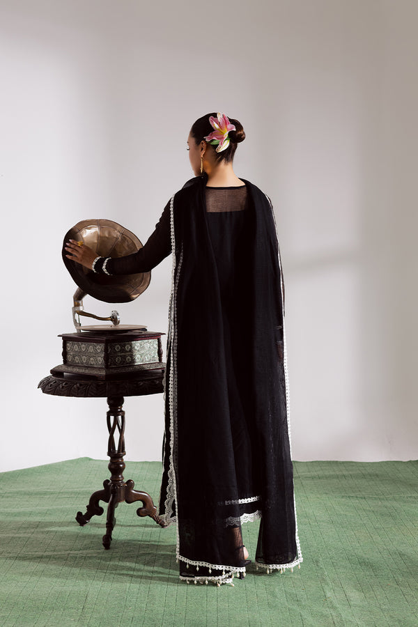 Black cotton net shirt with lace, pearl details, and side tassels. Paired with cotton trousers and a cotton net dupatta featuring four sided lace.