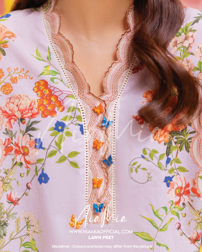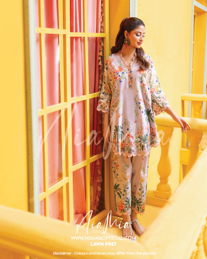 A printed set in soft lilac, brought to life with green botanical motifs. The V-neckline is framed with fine embroidered edging, while airy cutwork detailing accents the sleeves and hem. Paired with a matching printed shalwar for a relaxed yet polished summer look.