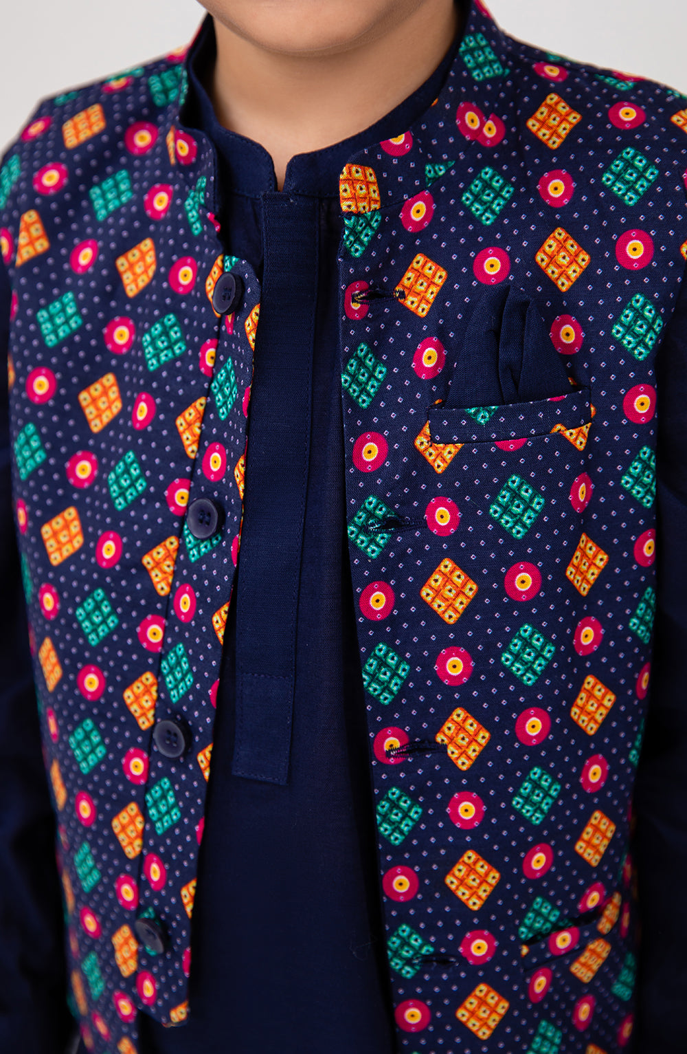 A charming and versatile 3-piece suit for infants, the Shahbaleh Printed Waistcoat Set in navy is designed for both comfort and style. Made from breathable Slub Khaddar 40x30 fabric, it includes a printed waistcoat, kurta, and matching bottoms—perfect for casual or festive occasions. The regular fit ensures freedom of movement for your little one.