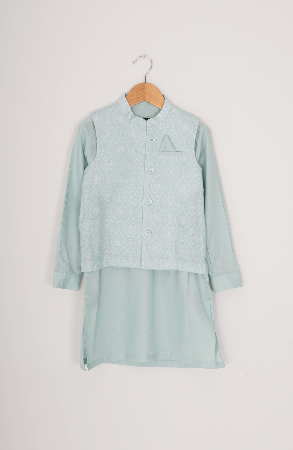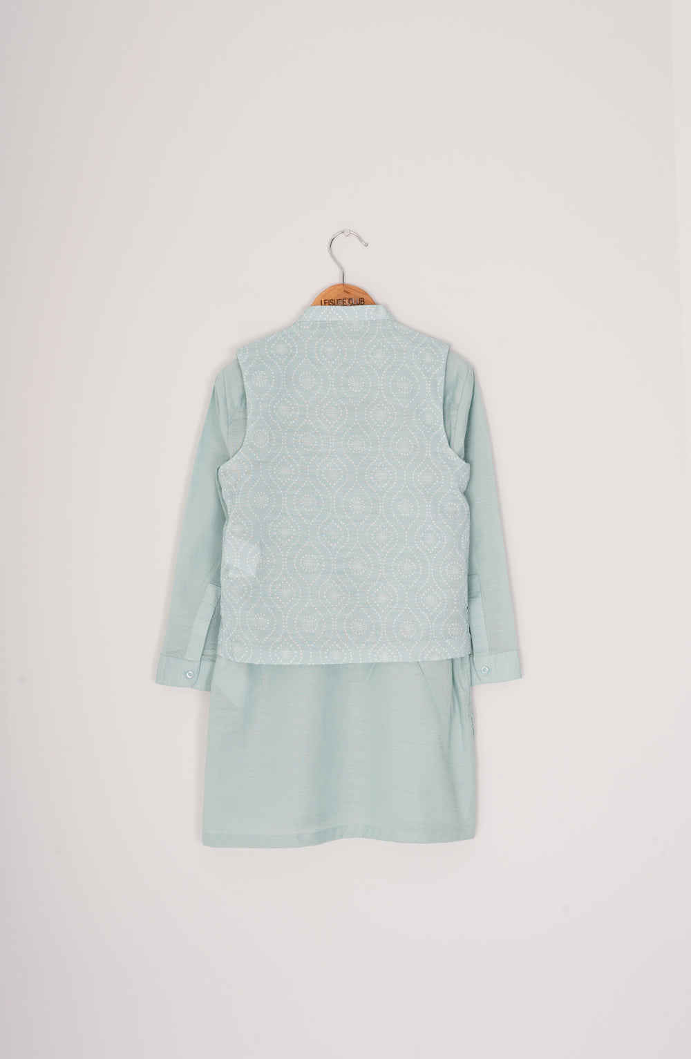 Fresh and festive, the Shahbaleh Printed Waistcoat 3-Piece Suit in aqua offers a graceful blend of comfort and tradition for your little one's special moments. This coordinated set includes a printed waistcoat, kurta, and trousers, all crafted from breathable slub khaddar fabric in a soothing aqua tone.