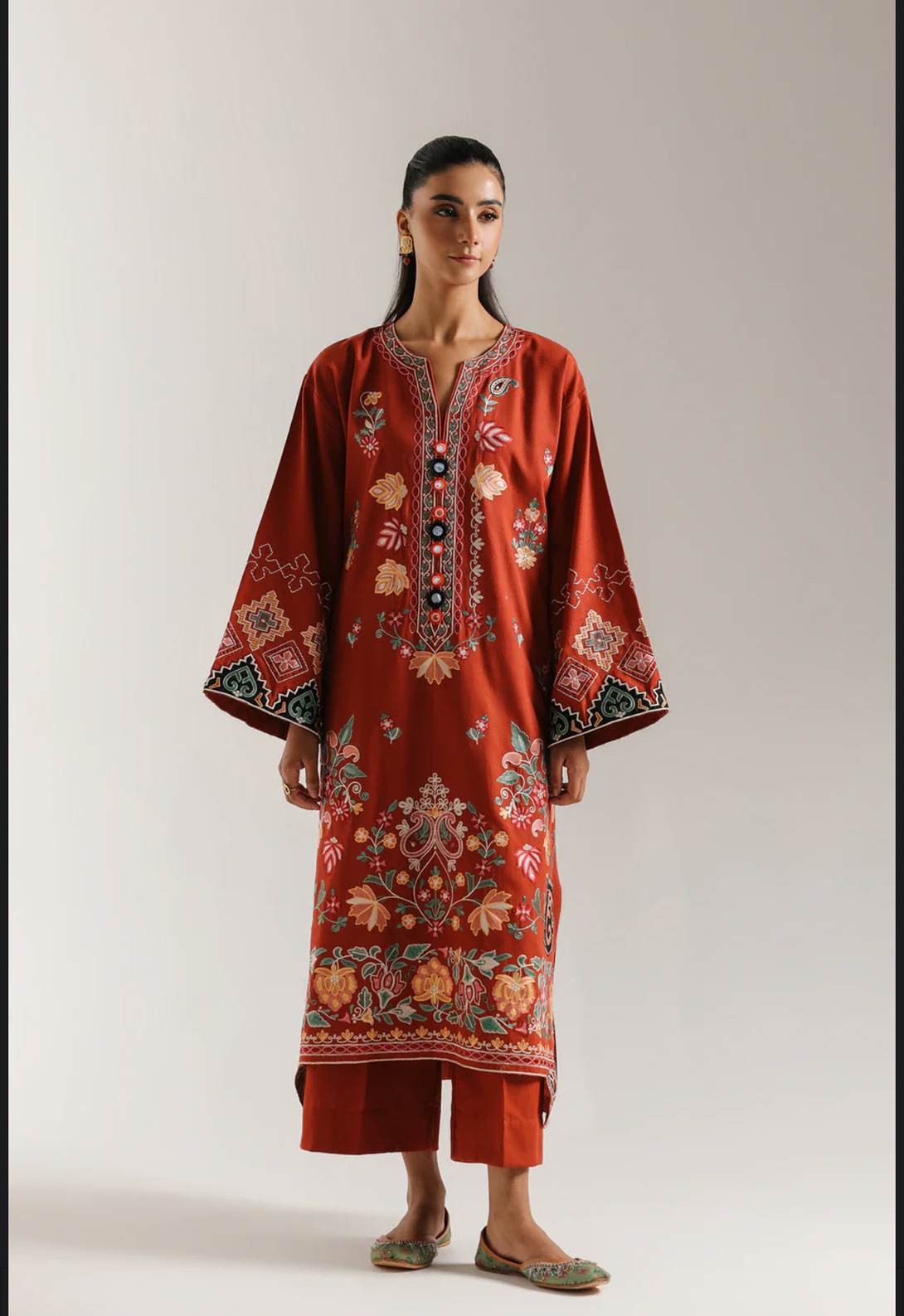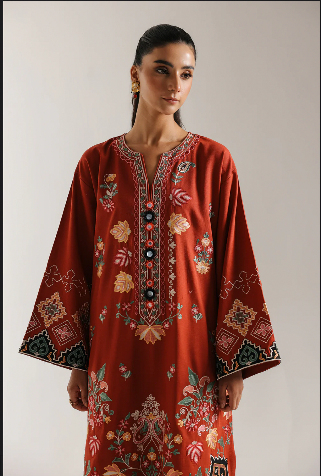 Ignite your festive style with the rich, luxurious tones of this stunning brick red embroidered suit. The long, A line kurta is crafted from a vibrant reddish-maroon fabric that serves as a bold foundation for the elaborate multi-colored thread embroidery. The front panel is completely adorned with rich floral motifs, aesthetic scallop borders at corners, and patch work. The front placket is adorned with croshia mirrors. The ensemble is completed by coordinating solid trousers in the same deep maroon, creating a spectacular and cohesive traditional look.