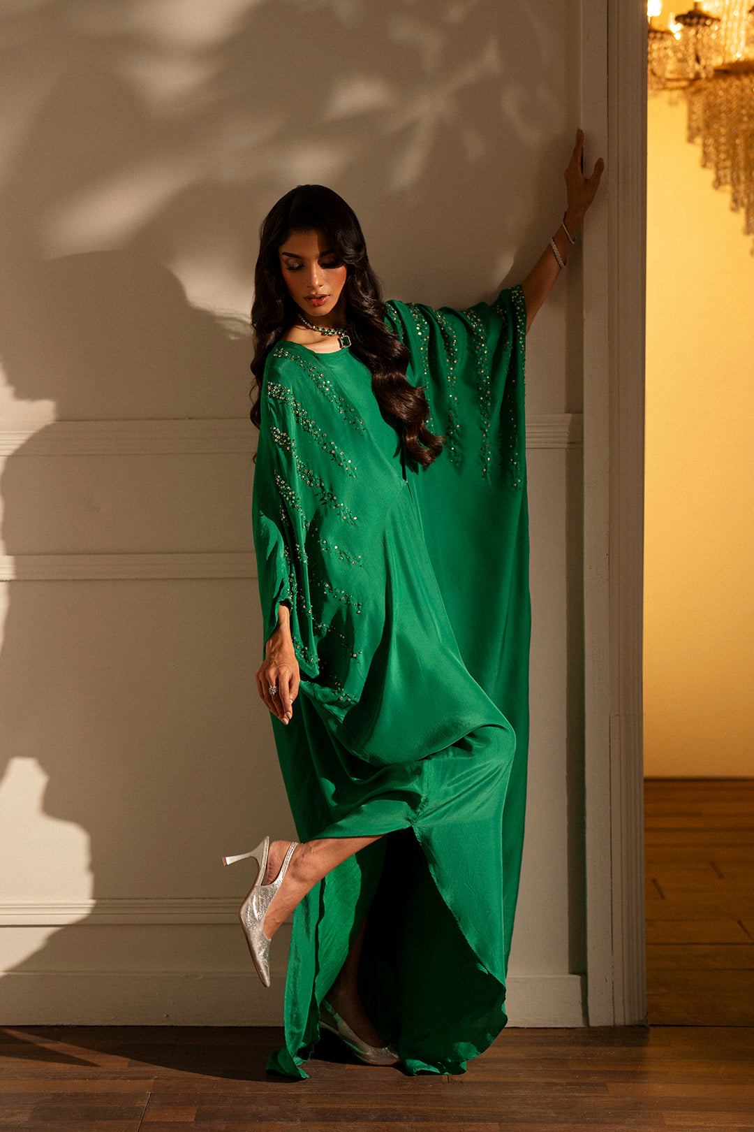 - This emerald green embellished kaftan brings in modernity with elegance.Stylised with a front hook detail to give a more pleated dimensional look or wear it lose. Be the talk of the town with "Daniz Kaftan".