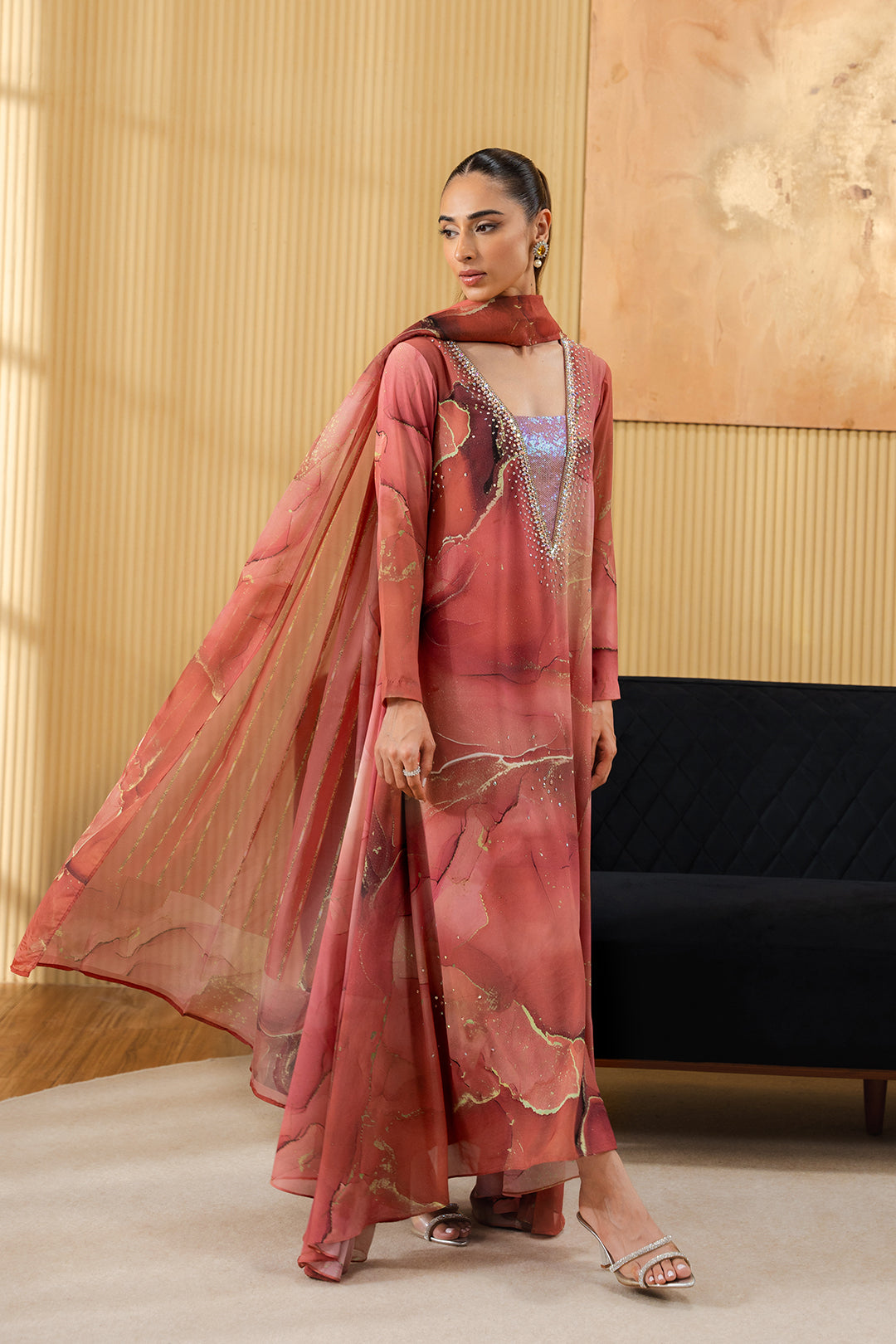 - This printed dress, made in soft georgette chiffon fabric, is adorned with crystal embellishment along the neck and crystal embellished spray along the front.