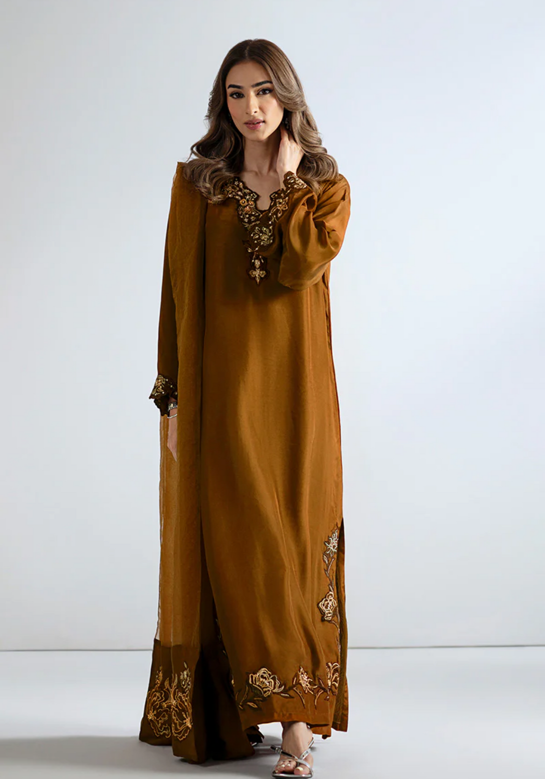 A vision of timeless elegance, this straight-cut kaftan features delicate handwork along the neckline, accentuated with intricately detailed bell sleeves and an opulently embellished hem and side slits. Paired with straight pants and organza dupatta framed with a medium silk border and delicate embellishments, this design radiates refined luxury and effortless sophistication.