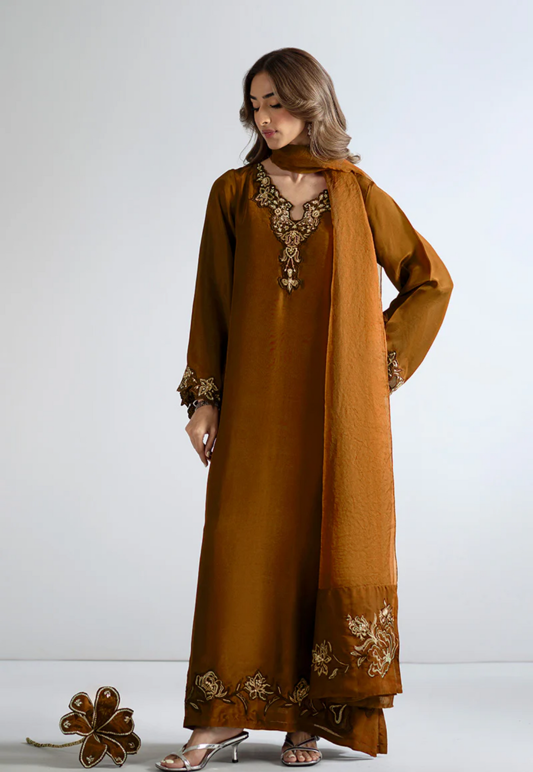 - Heavily embellished hem and side slits adorned with exquisite handwork