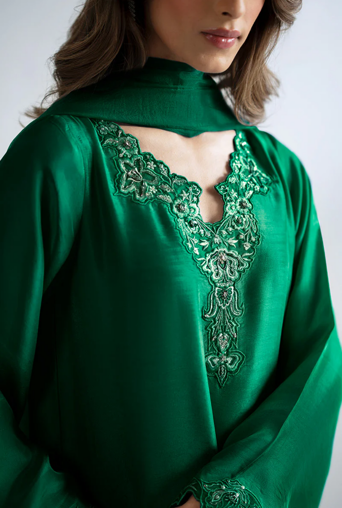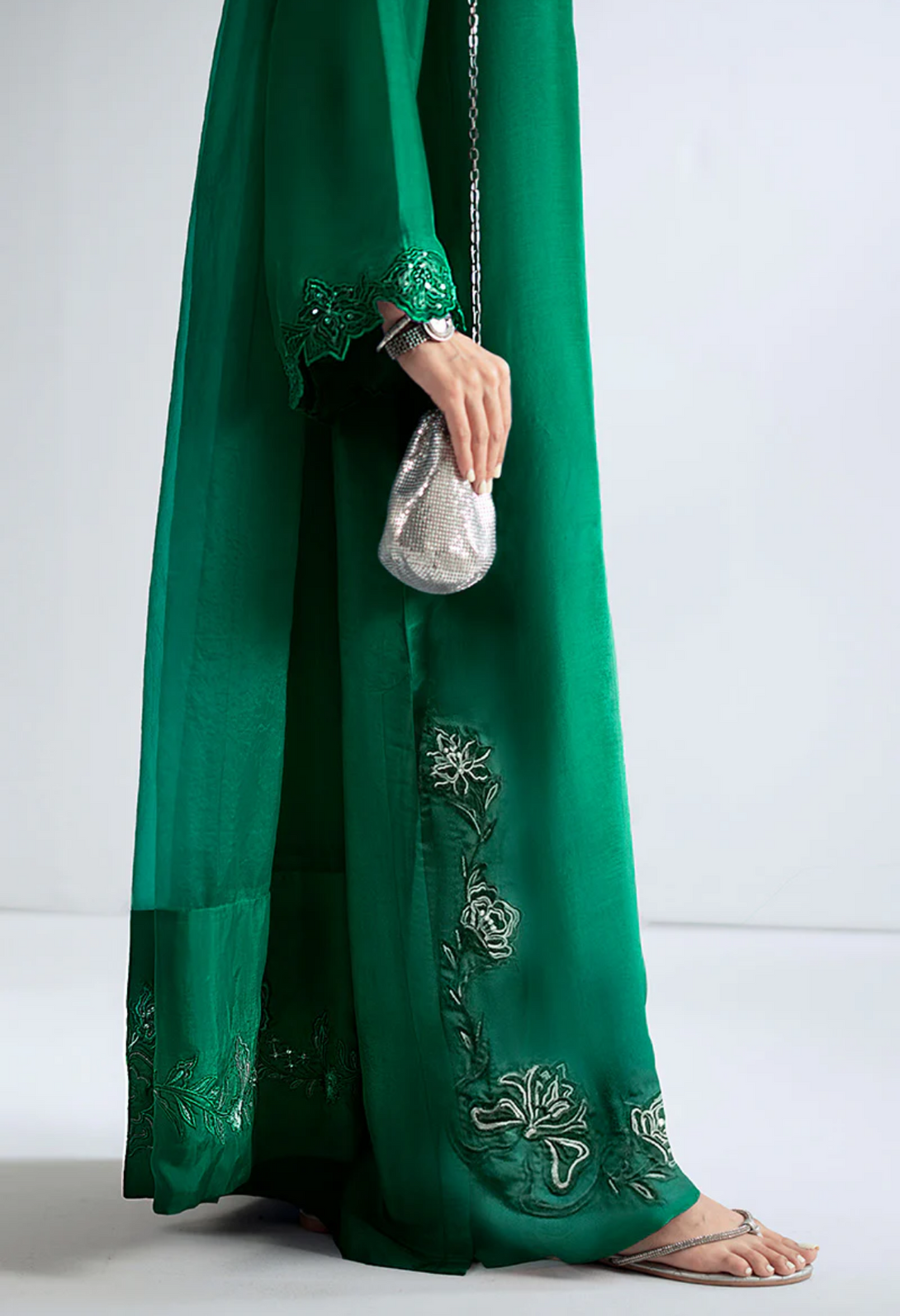 - Heavily embellished hem and side slits adorned with exquisite handwork