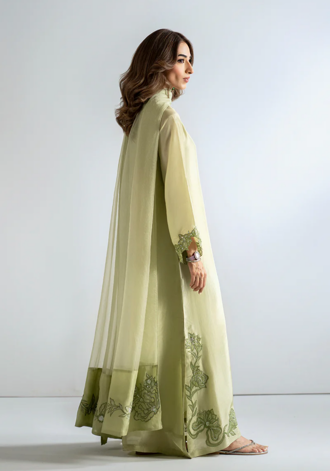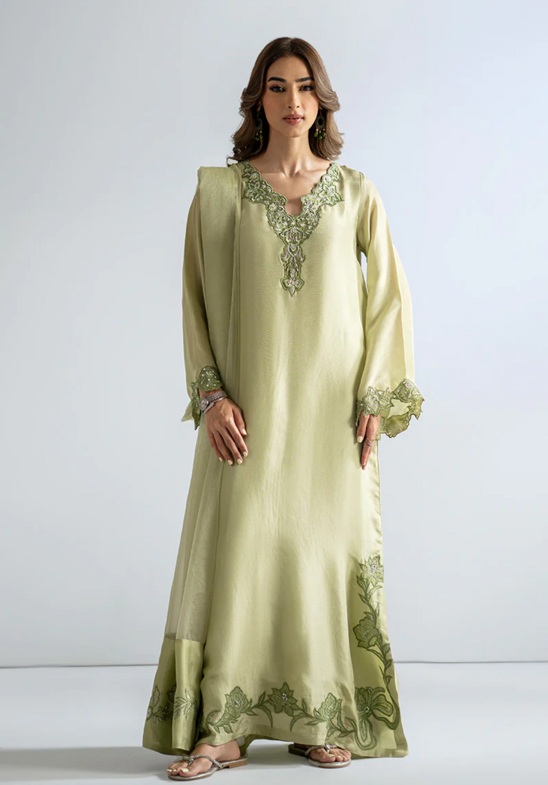 This straight-cut kaftan is a vision of elegance, featuring delicate handwork along the neckline and adda detailing on the bell sleeves. The hem and side slits shimmer with ornate craftsmanship, complemented by straight pants and organza dupatta with medium silk border and heavy embellishments.