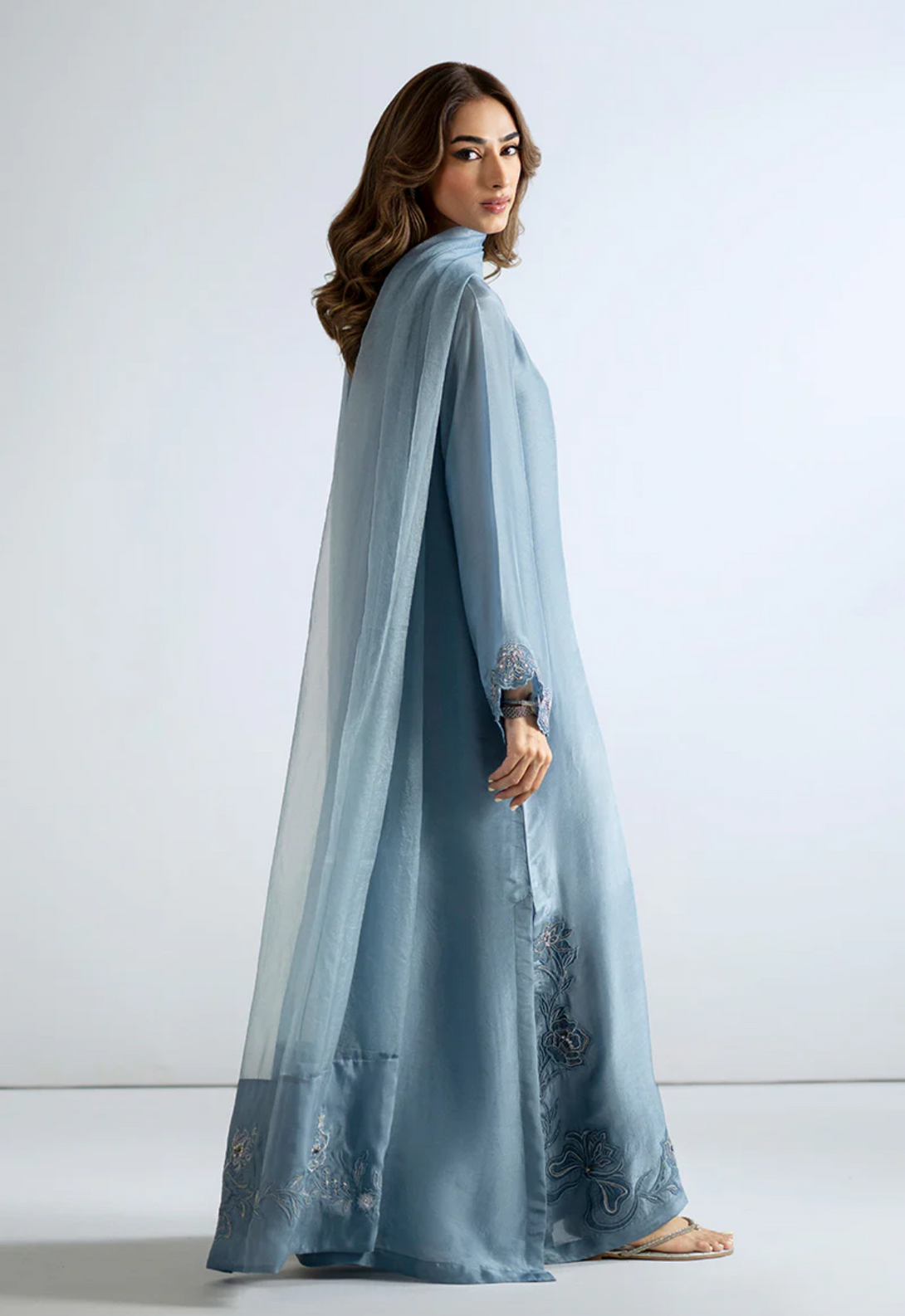 A masterpiece of refined artistry, this straight-cut kaftan is adorned with delicate handwork along the neckline and exquisite adda detailing on the bell sleeves. The opulently embellished hem and side slits shimmer with timeless craftsmanship. Completed with straight pants and organza dupatta featuring medium silk border in heavy embellishments, this design evokes regal grace and couture allure.