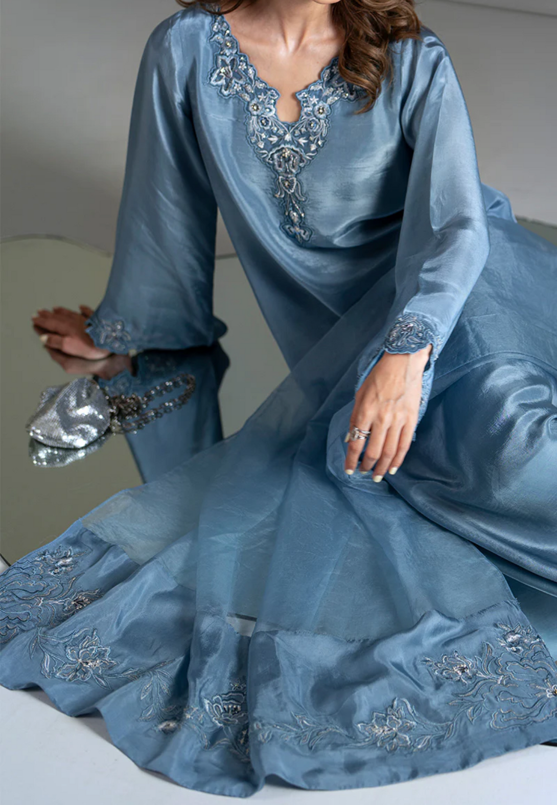 - Heavily embellished hem and side slits adorned with exquisite handwork