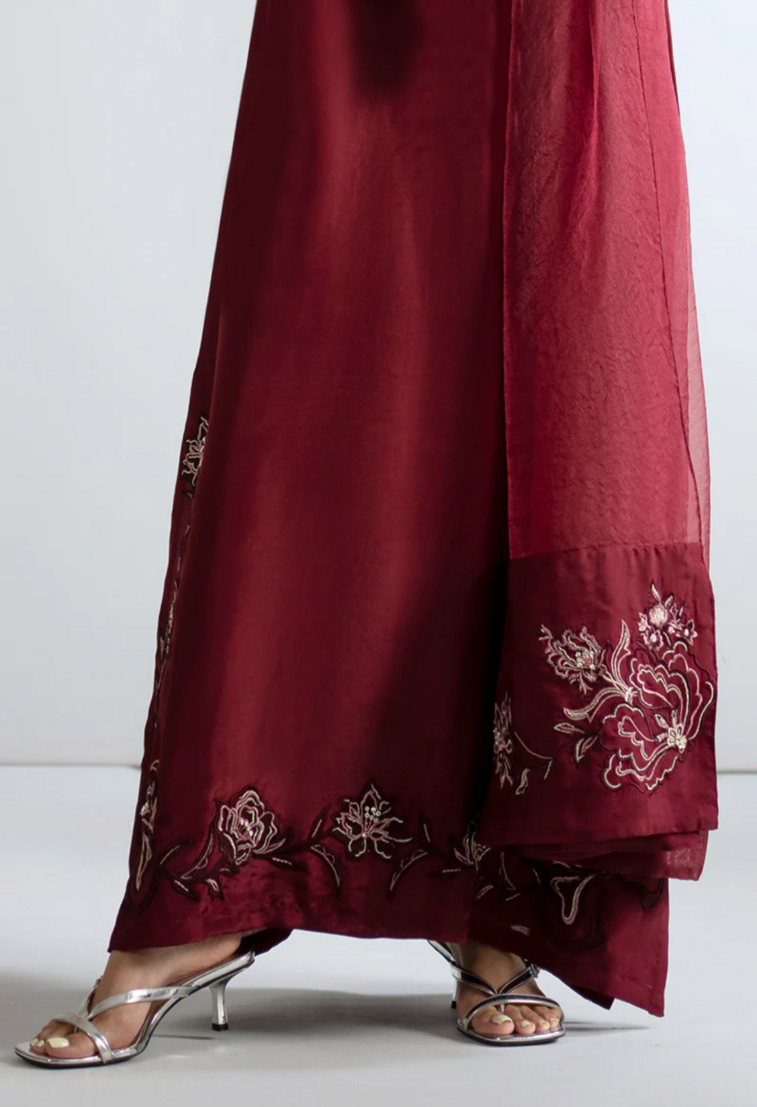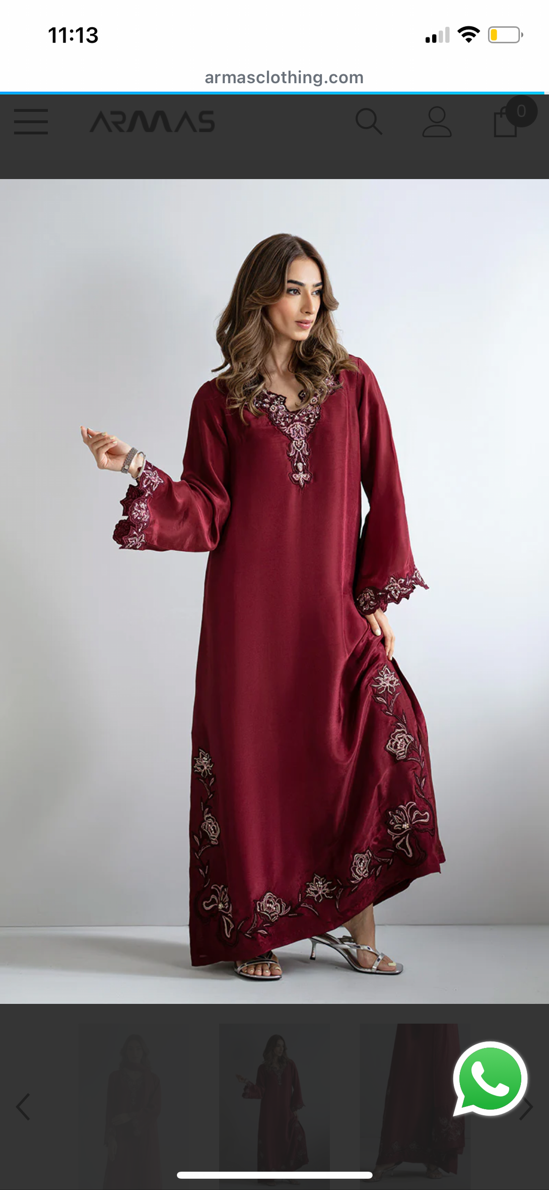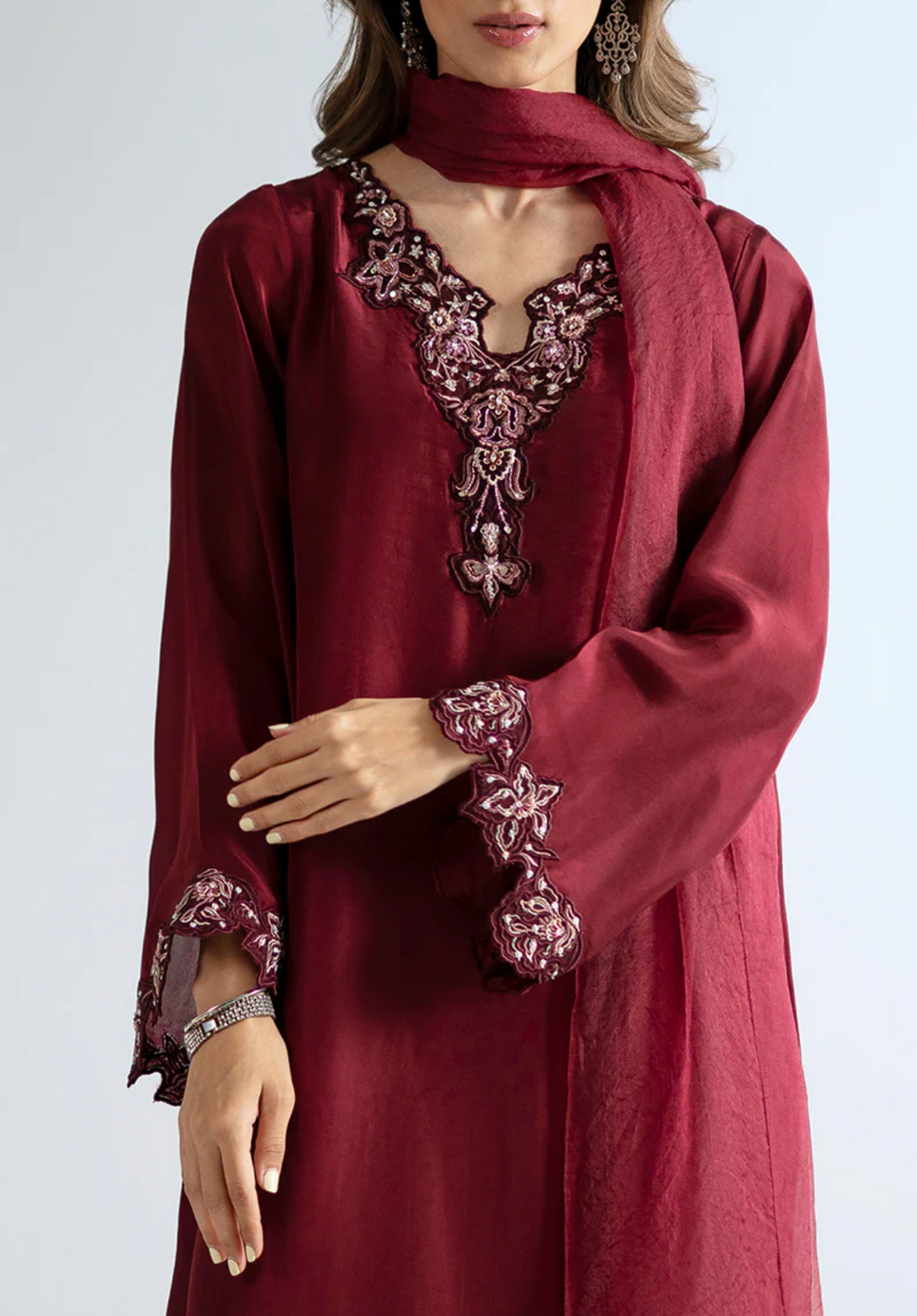 A gracefully elegant straight-cut kaftan, meticulously adorned with delicate handwork along the neckline for a refined, timeless charm. The bell sleeves, finished with intricate adda detailing on the edges, and the heavily embellished hem and side slits enriched with exquisite adda craftsmanship add a luxurious flair. Paired with straight pants and organza dupatta featuring medium silk border beautifully adorned with heavy embellishments.