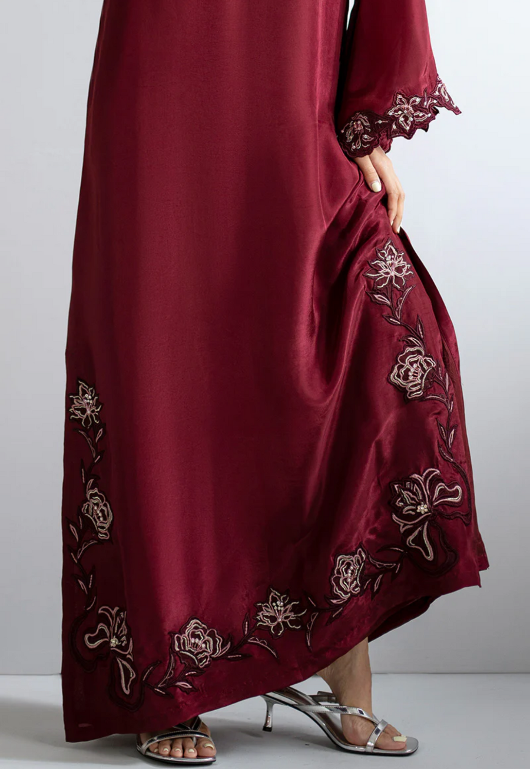 - Straight-cut kaftan with delicate embellishments along the neckline