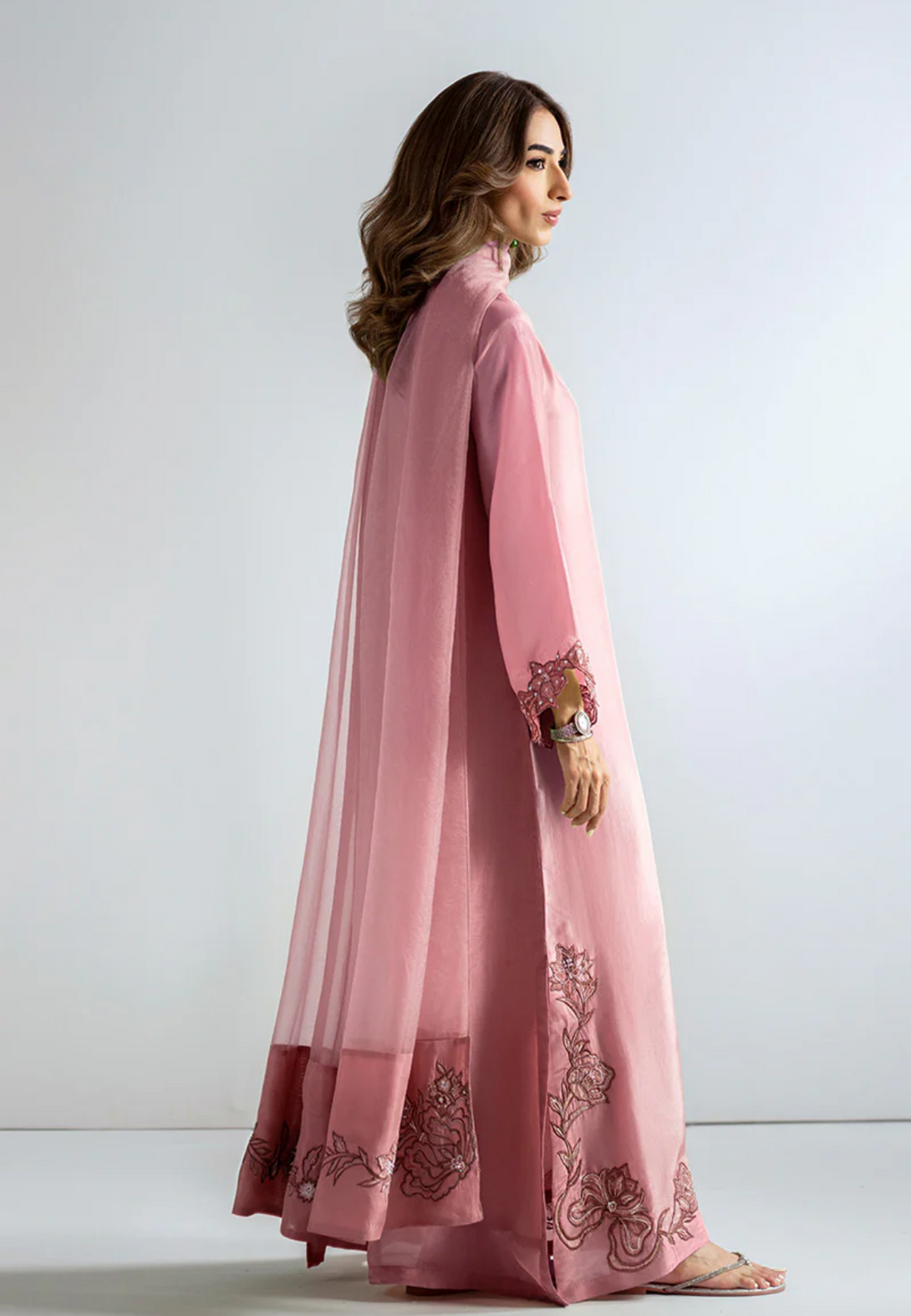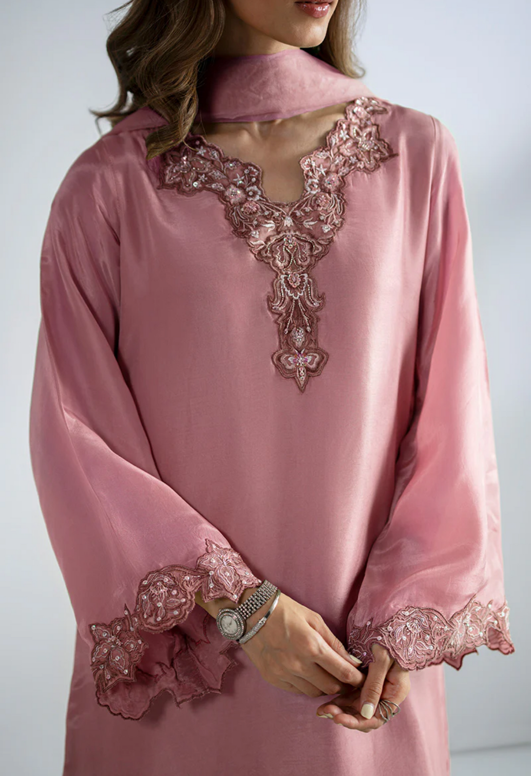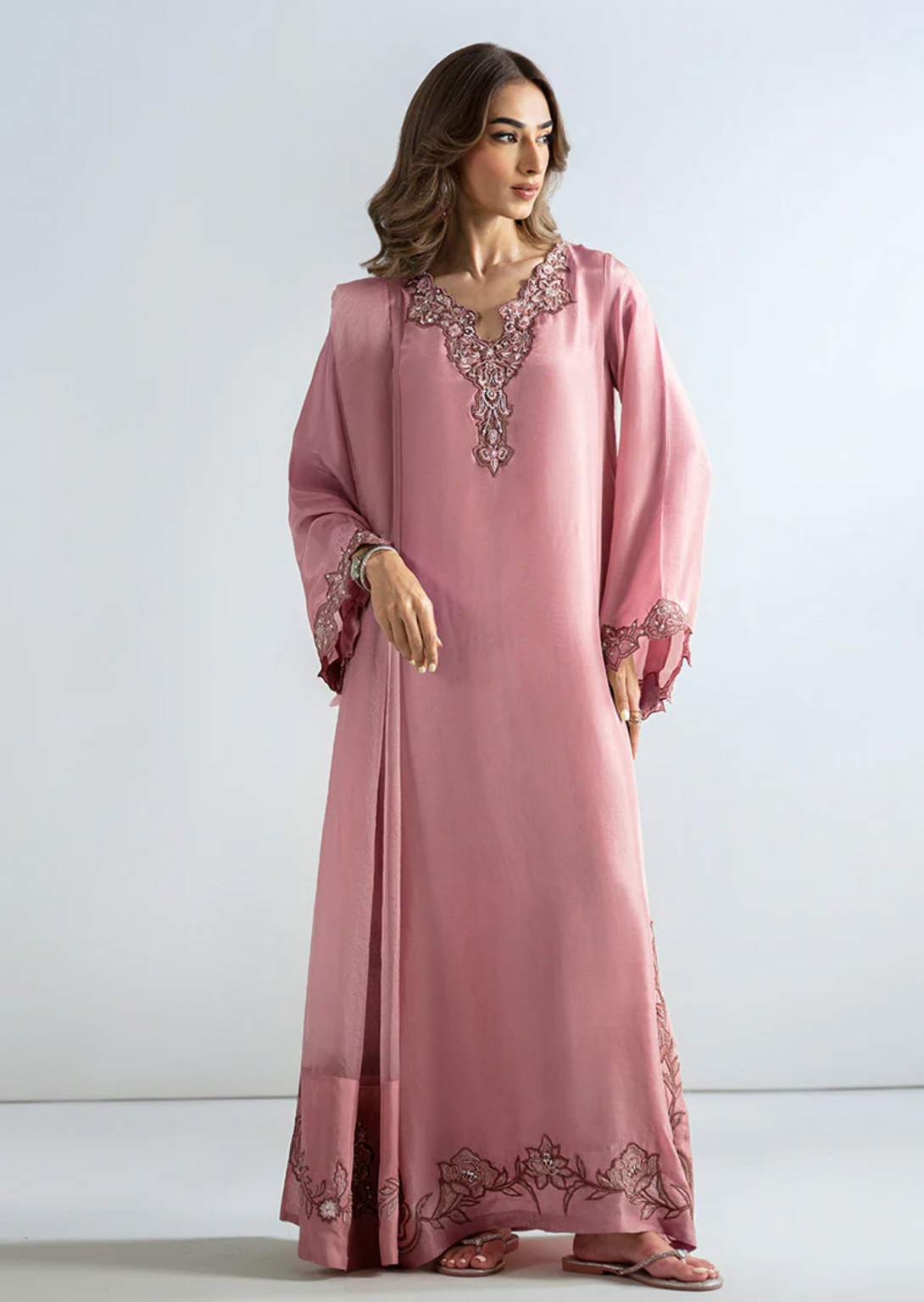 An exquisite straight-cut kaftan, meticulously hand worked along the neckline to perfection. The bell sleeves, adorned with intricate handwork detailing, flow effortlessly, while the richly embellished hem and side slits exude refined opulence. Paired with straight pants and organza dupatta accentuated with a medium silk border, lavishly adorned with heavy embellishments — a timeless ensemble that defines understated luxury.