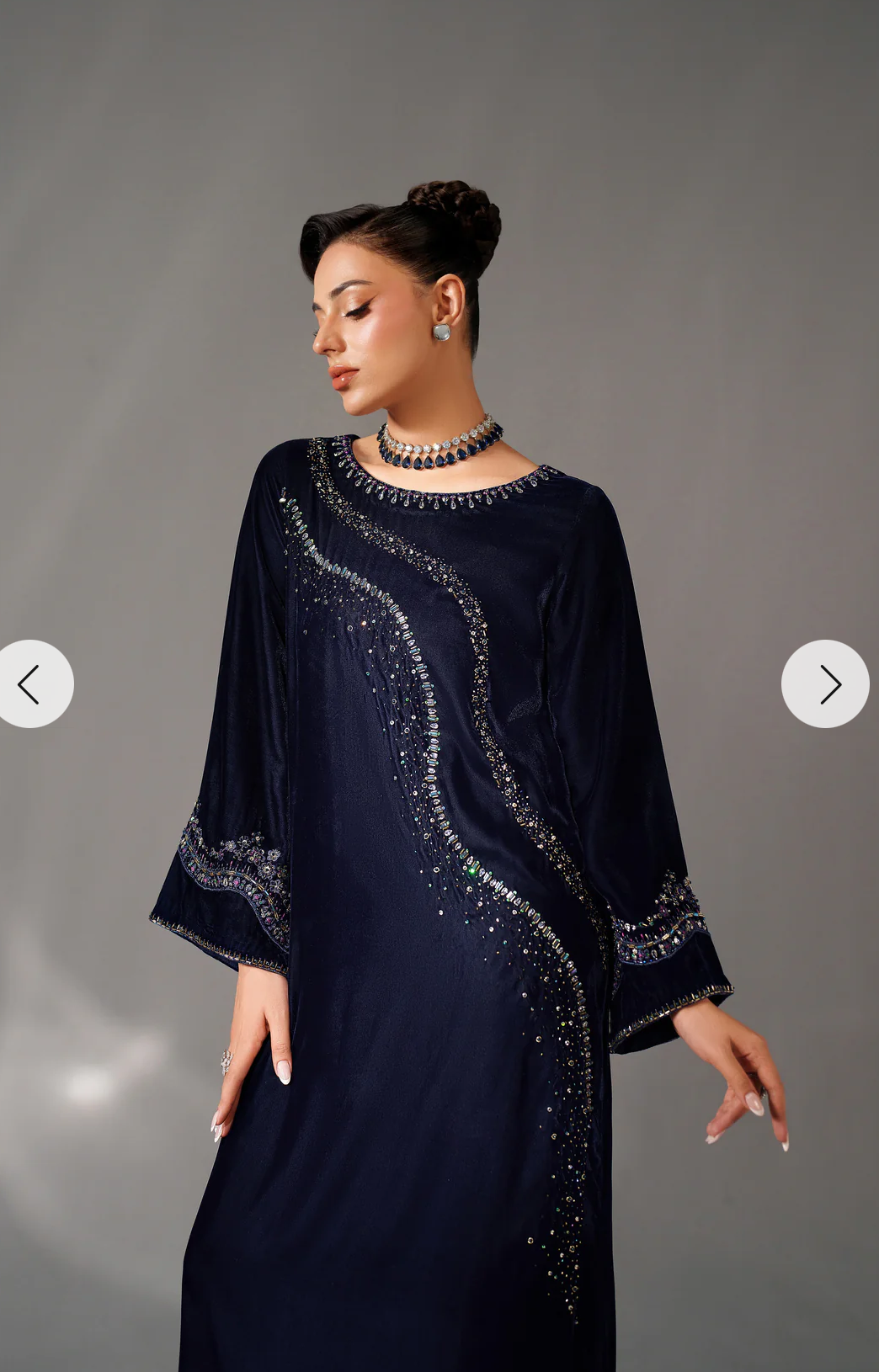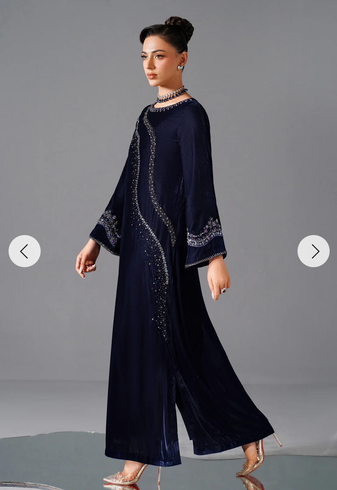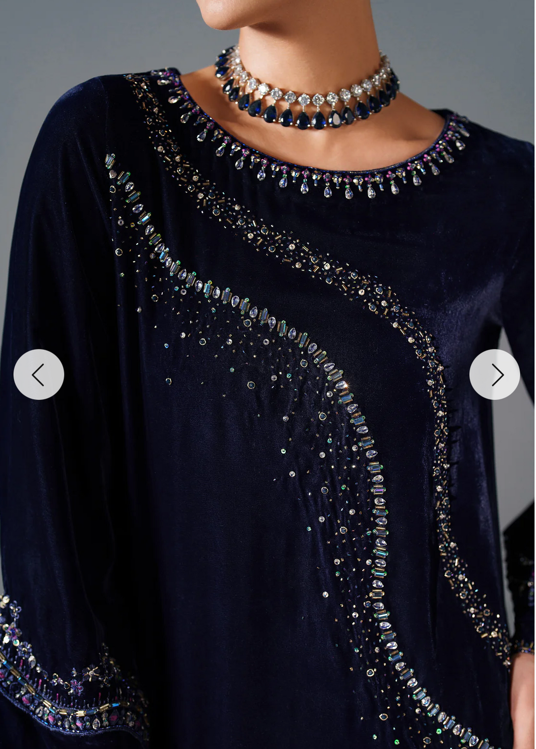 This elegant ensemble is crafted from luxurious China velvet, featuring a refined boat neckline with intricate adda work that enhances its sophistication. The shirt is beautifully adorned with a combination of machine embroidery, sequins, and delicate adda work spread across the fabric, adding a subtle shimmer and timeless charm. Designed with loose sleeves and a graceful short slit, the outfit balances modern style with traditional artistry. The straight trouser is tailored from premium raw silk, completing the look with a sleek and polished finish. A perfect choice for those who appreciate exquisite craftsmanship and classic elegance..