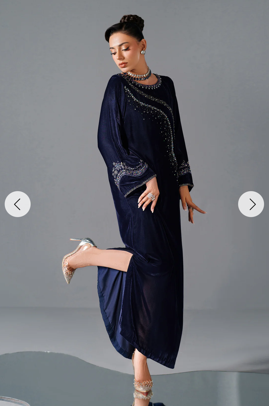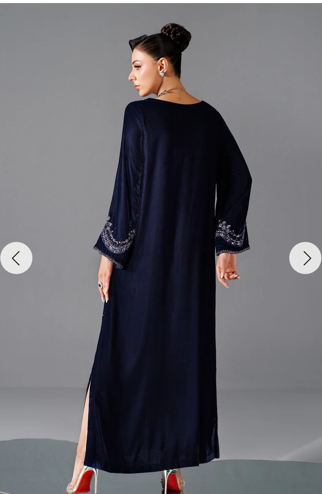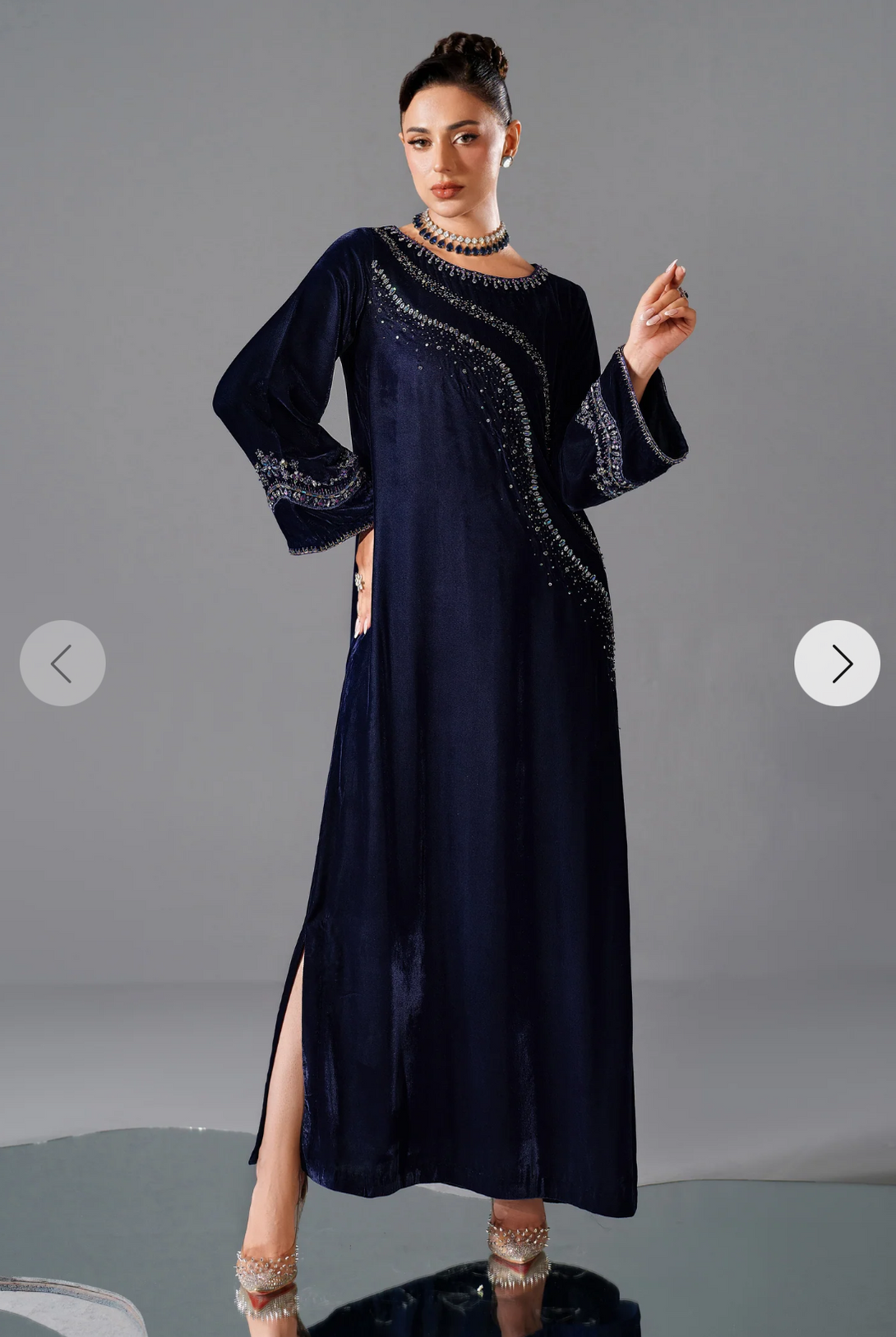 This elegant ensemble is crafted from luxurious China velvet, featuring a refined boat neckline with intricate adda work that enhances its sophistication. The shirt is beautifully adorned with a combination of machine embroidery, sequins, and delicate adda work spread across the fabric, adding a subtle shimmer and timeless charm. Designed with loose sleeves and a graceful short slit, the outfit balances modern style with traditional artistry. The straight trouser is tailored from premium raw silk, completing the look with a sleek and polished finish. A perfect choice for those who appreciate exquisite craftsmanship and classic elegance..