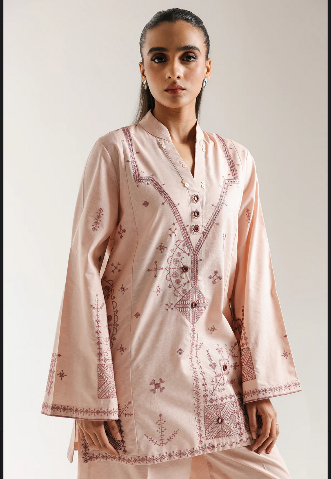SHIRT - STRAIGHT FIT - BAN NECK WITH V SLIT - FLARED SLEEVES - SHORT LENGTH