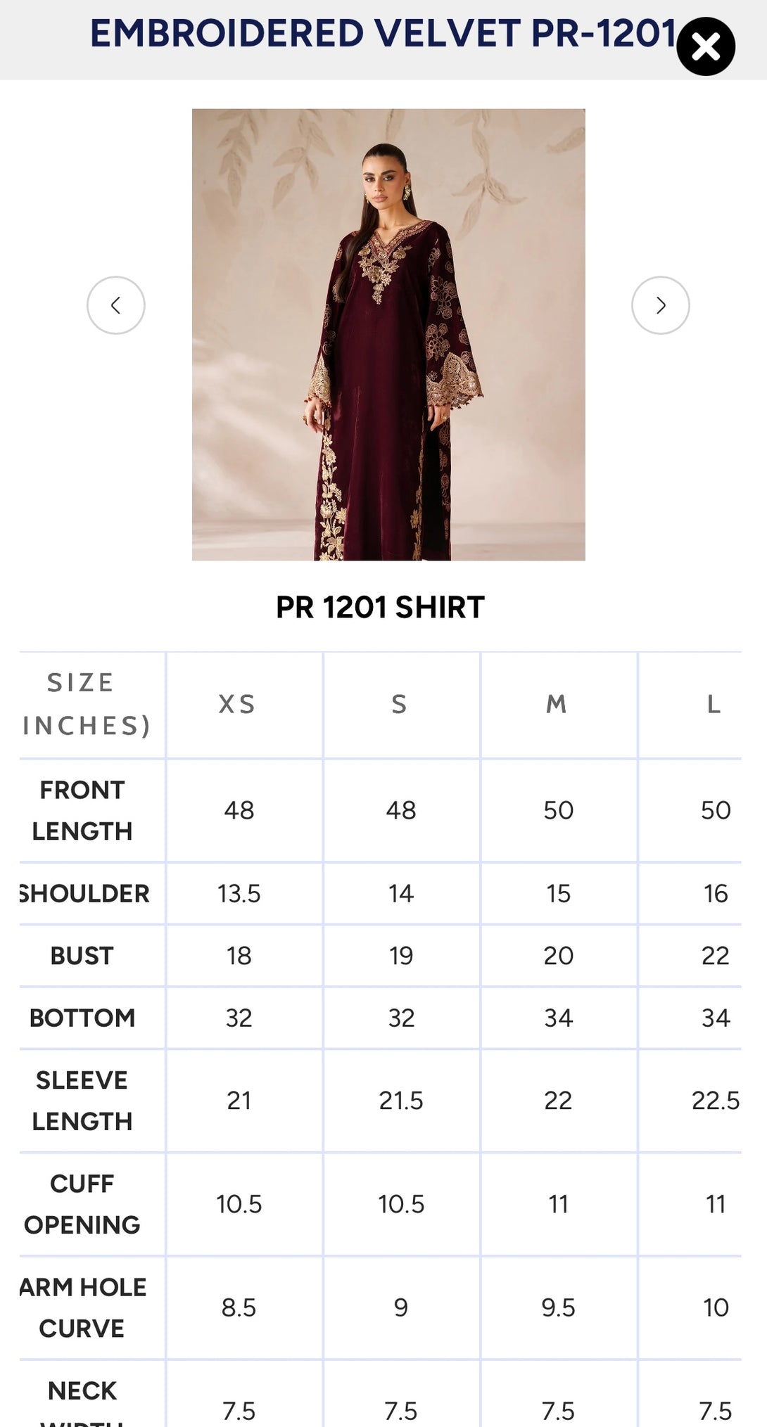 Shirt fabric : embroidered velvetTrouser fabric : gripDupatta fabric : digital printed silk crush dupattaIncludes : shirt ,trouser, dupatta with accessories