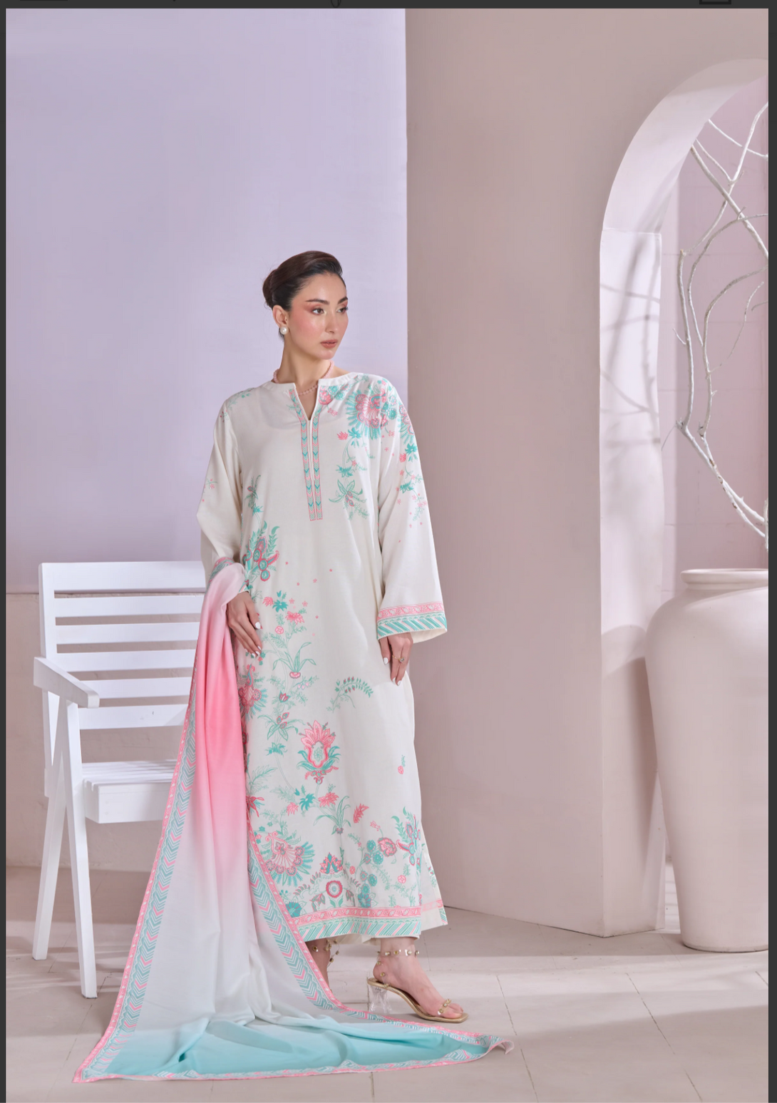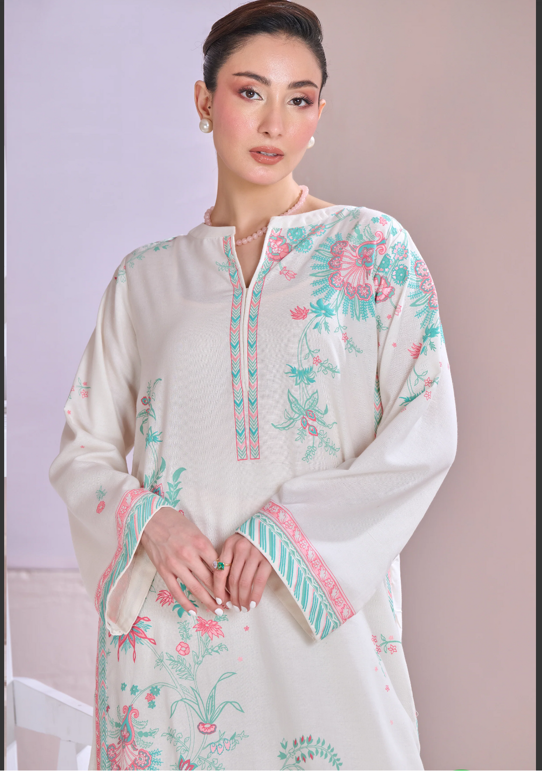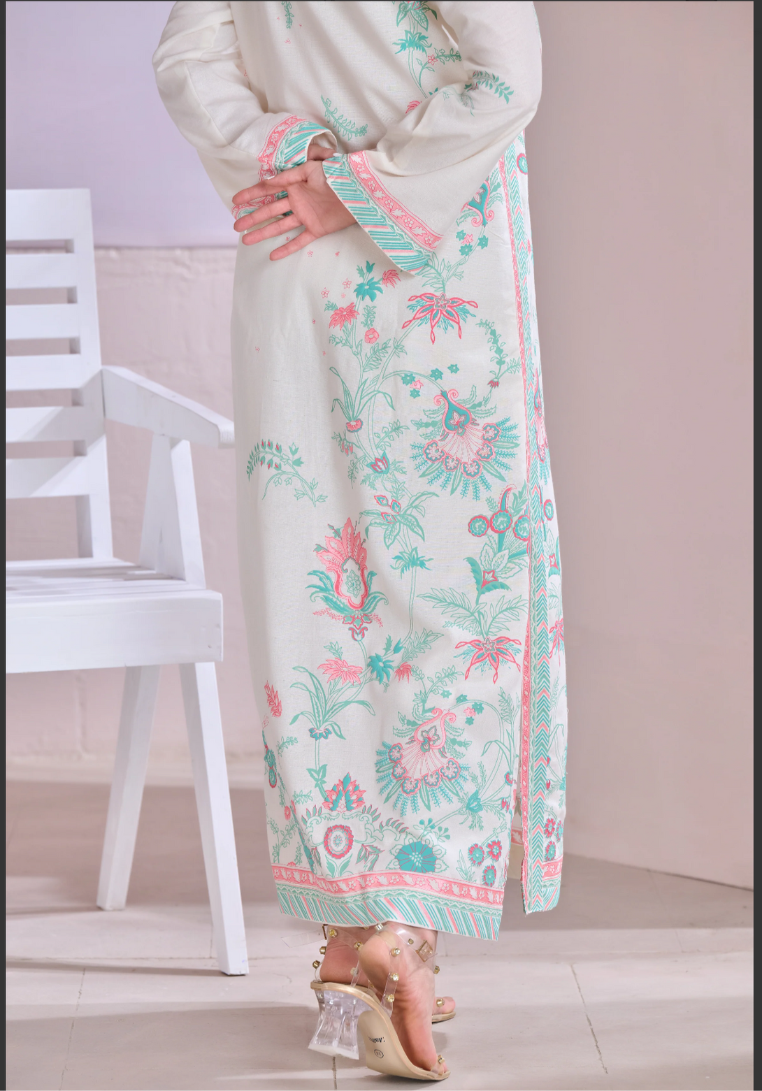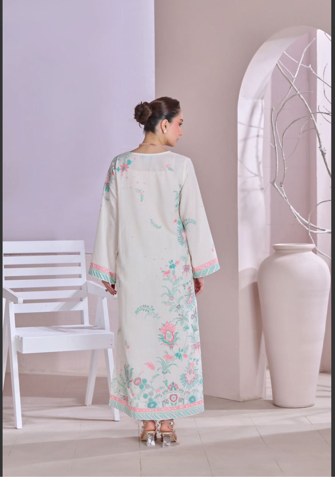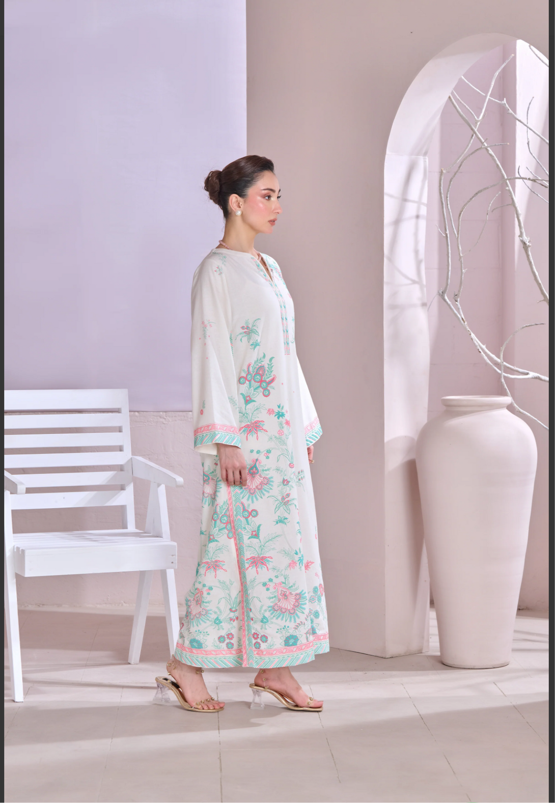 Description: This Off White Kaftaan shirt features a relaxed, comfortable fit with a contemporary floral screen print in soft shades of rust, peach, green, and hints of aqua. The delicate printed trim along the neckline and sides adds subtle definition, enhancing the silhouette while maintaining a flowing, effortless look. It’s a perfect blend of modern style and timeless grace.