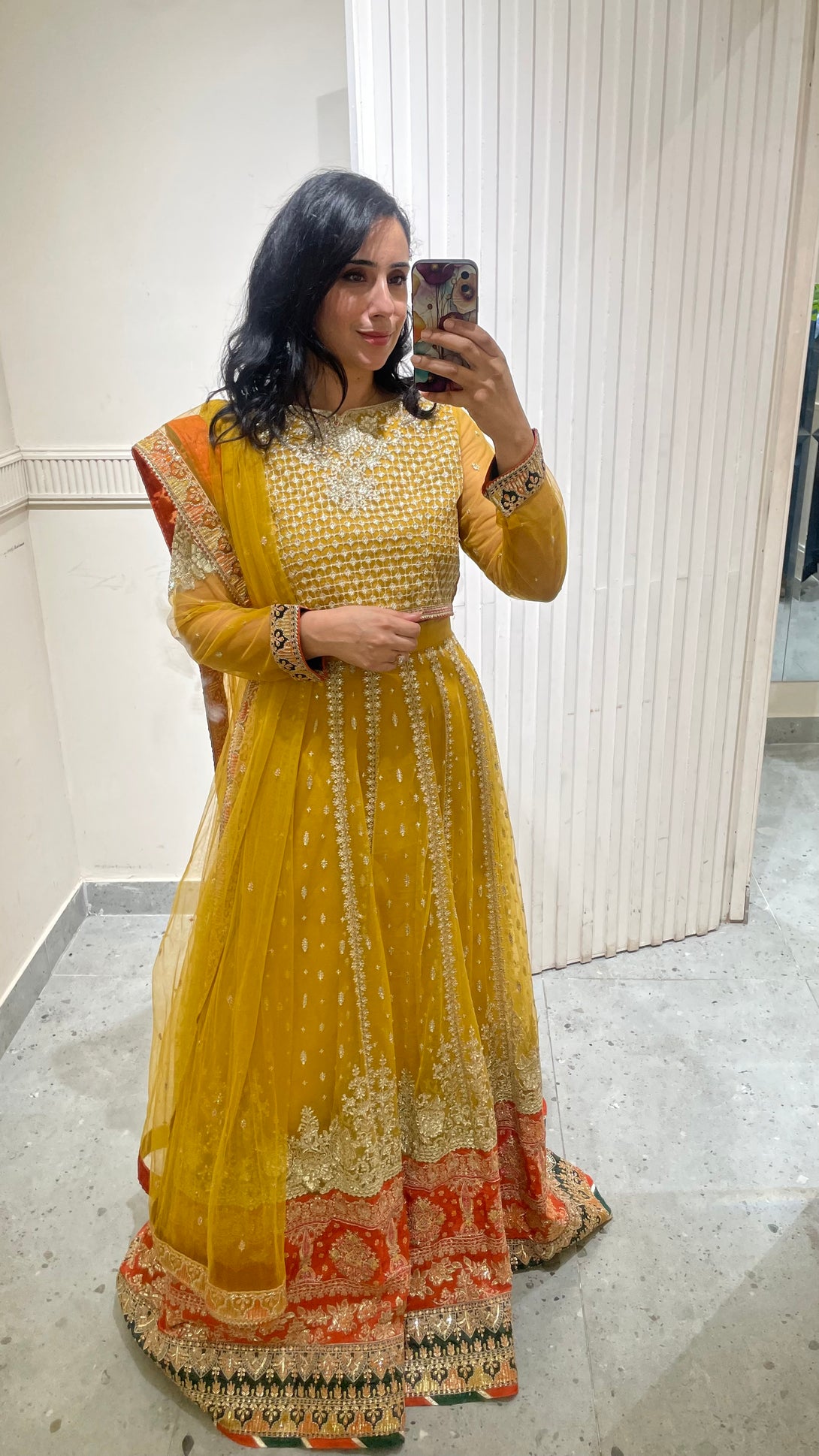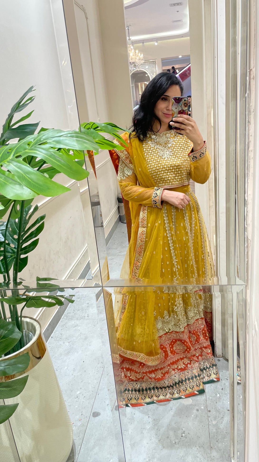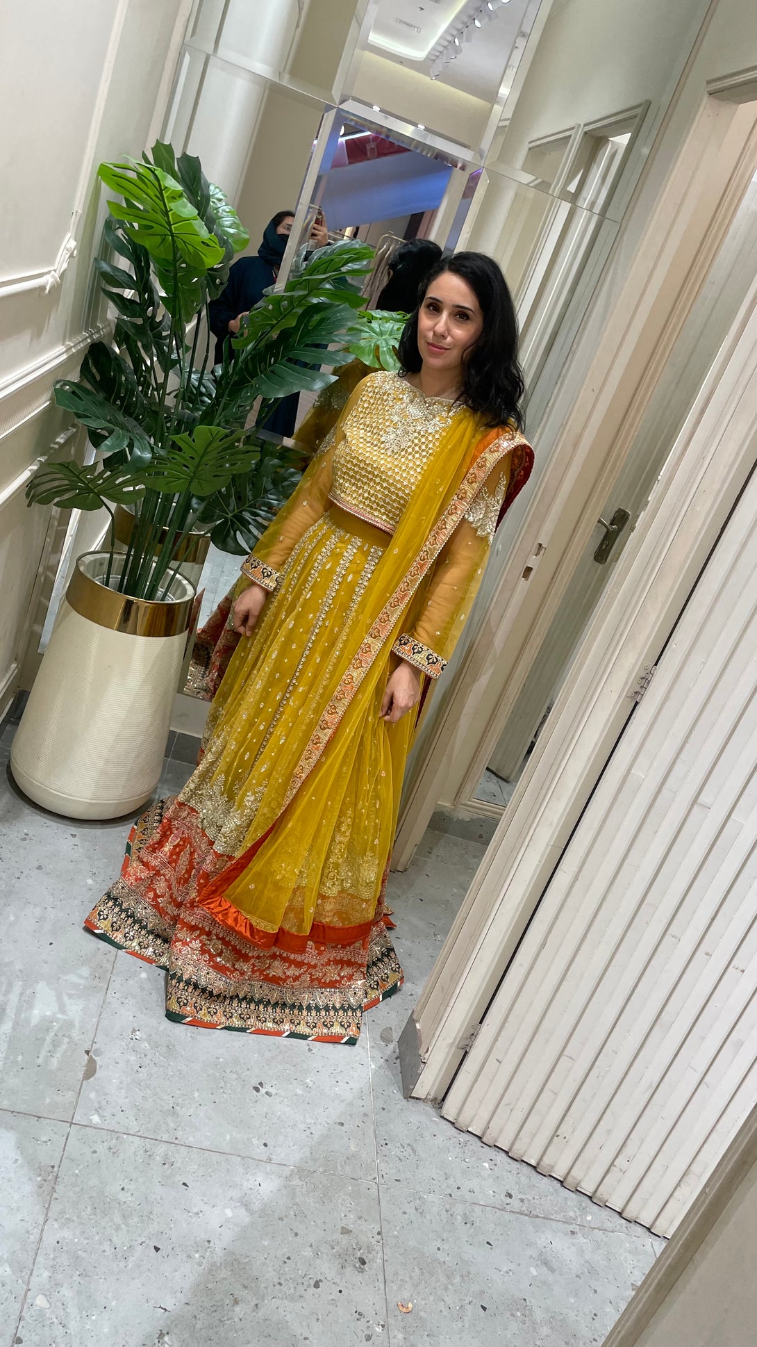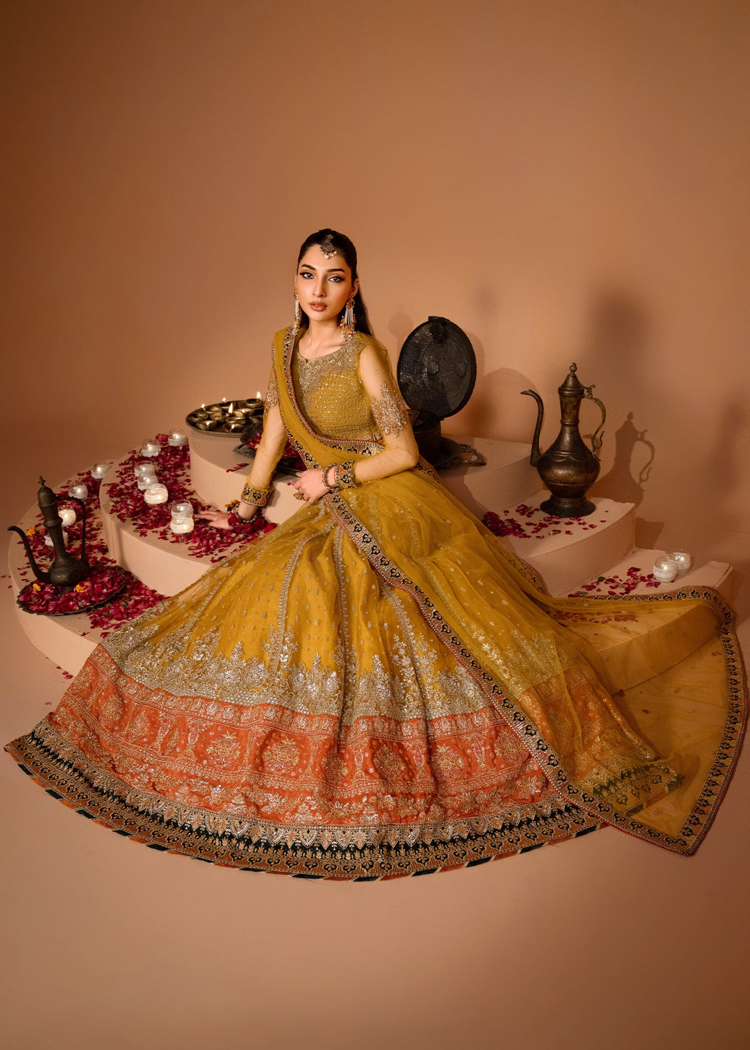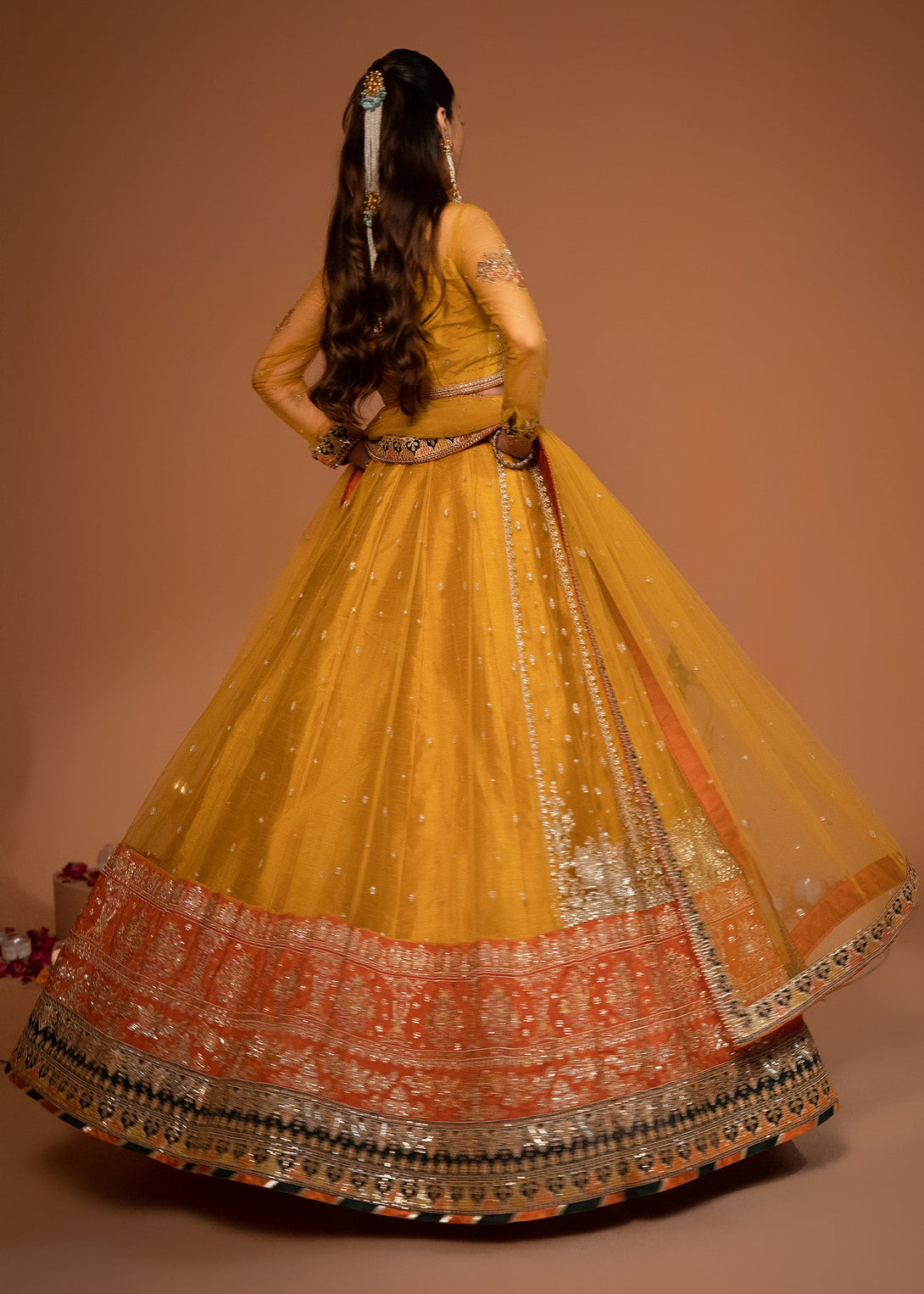 Intricate multihead embroidery enhances the blouse and lehenga, combining tradition with modern elegance. The ensemble is completed with a net dupatta featuring embroidered spray allover the dupatta and embroided borders, exuding effortless charm for any special occasion.