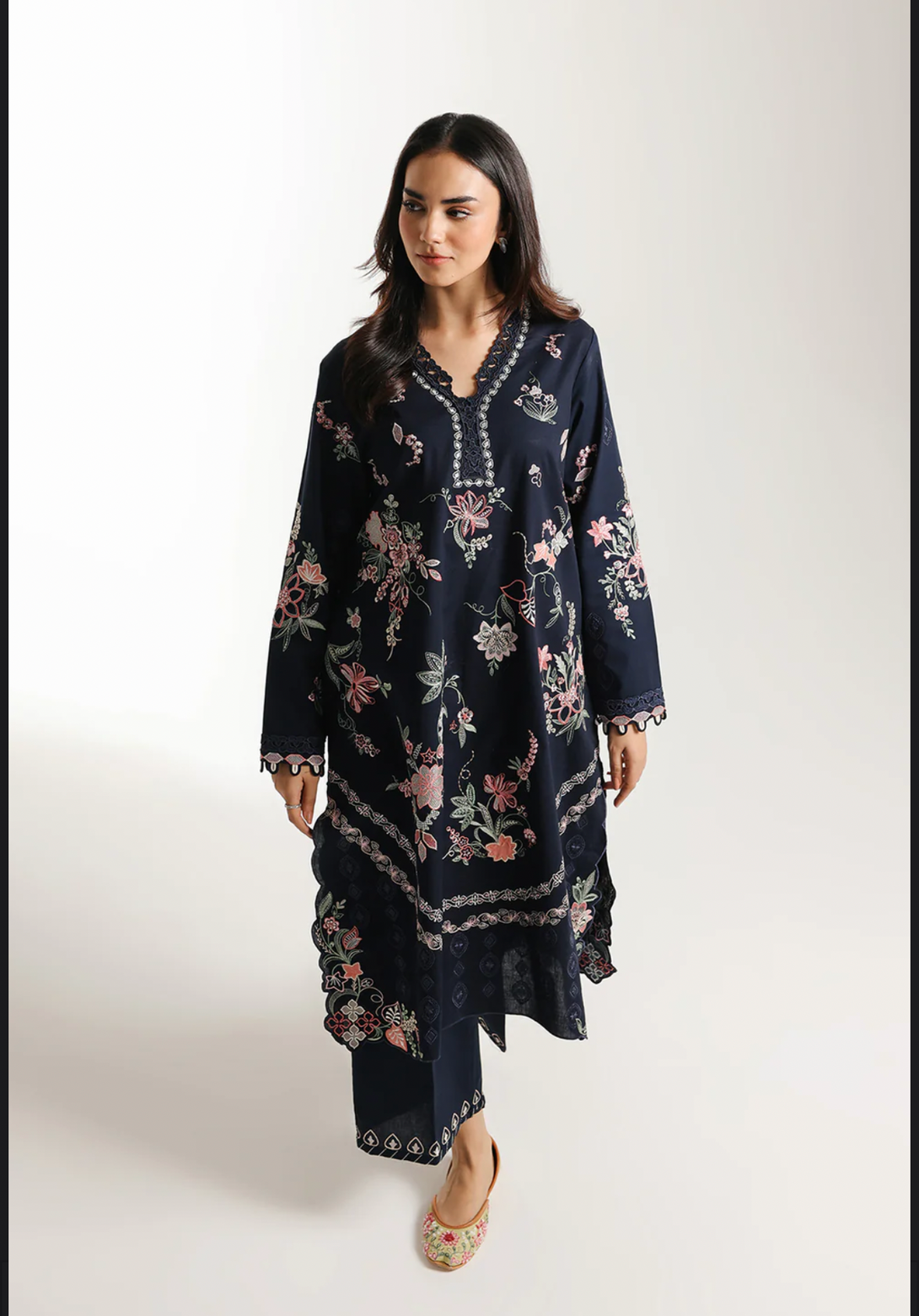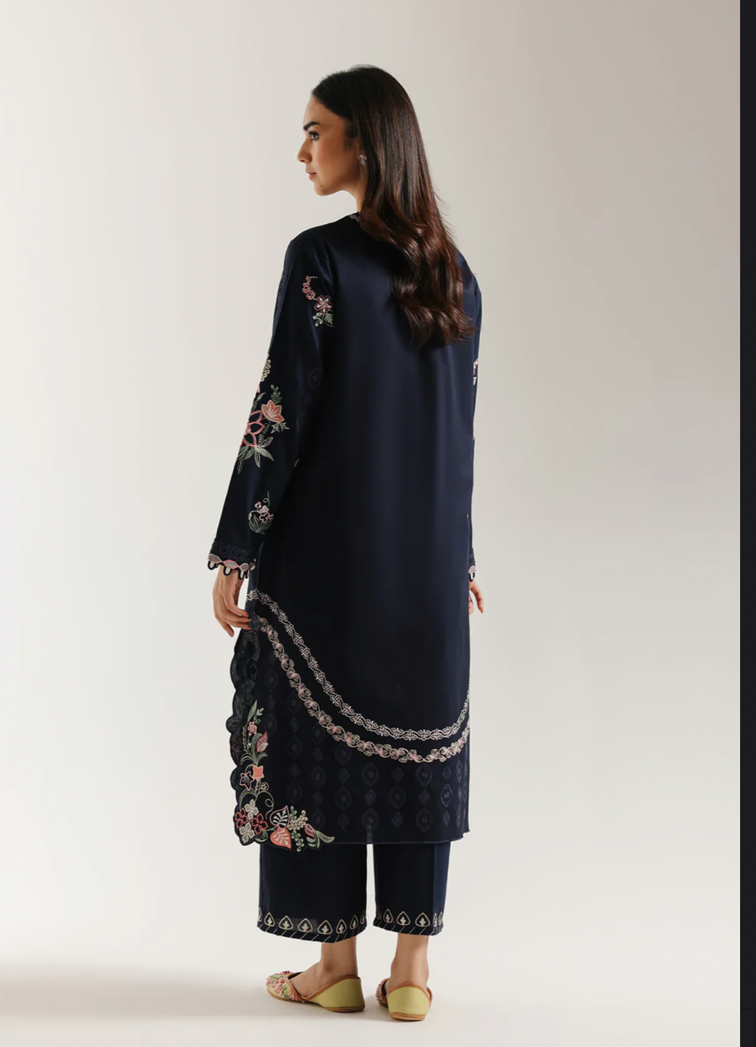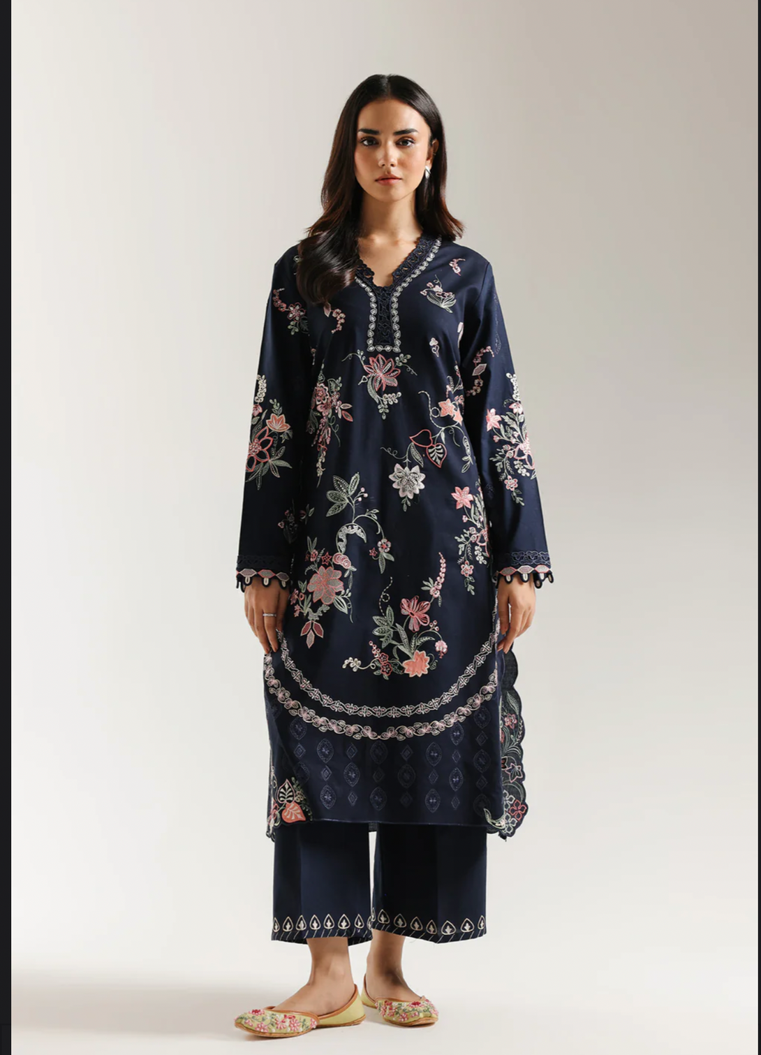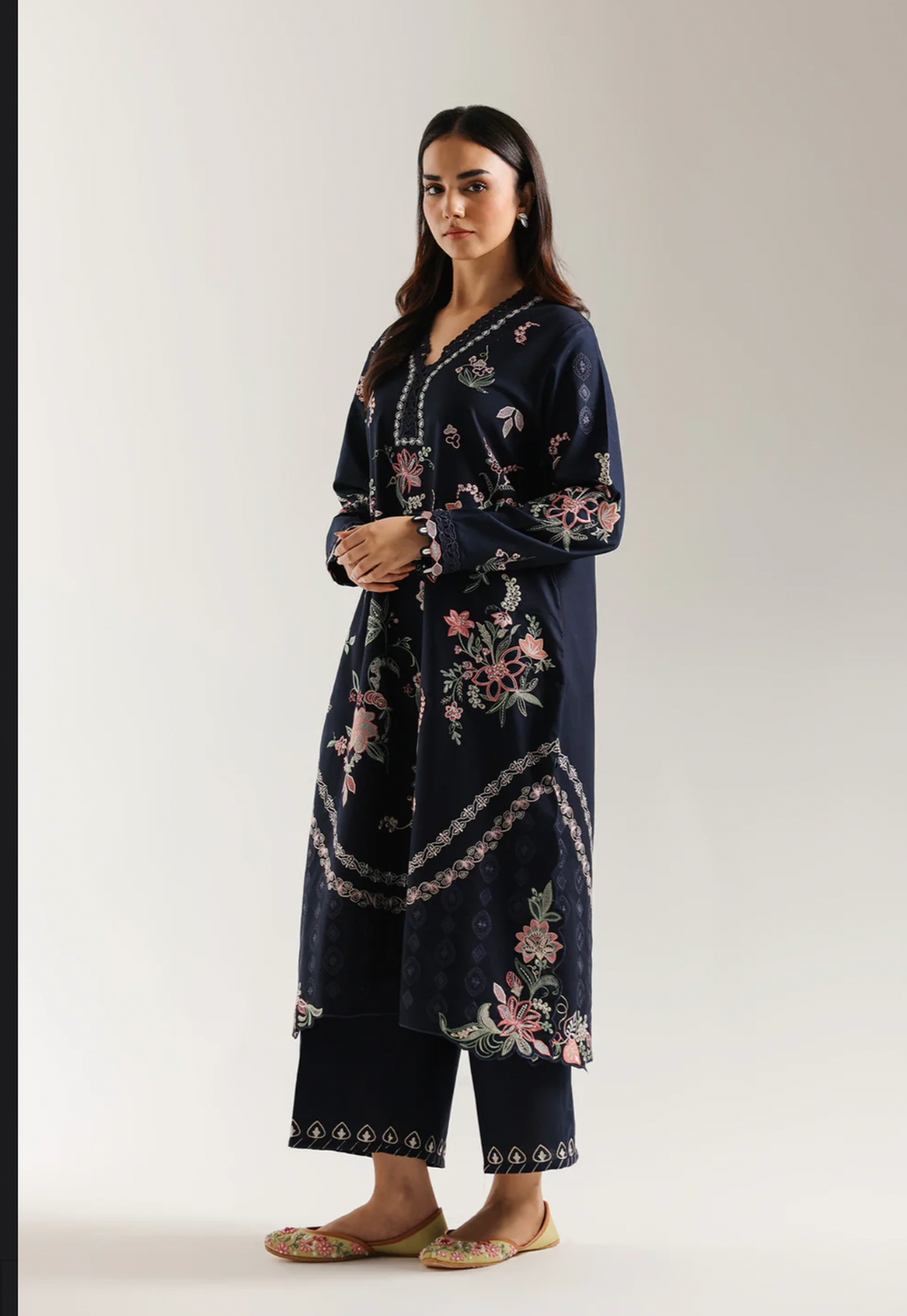 Capture deep, feminine elegance with this stunning navy blue embroidered suit. The straight-cut kurta is lavishly detailed with traditional floral and vine embroidery in soft shades of pink, dusty rose, and green that cascade down the front and sleeves. The elaborate neckline is highlighted with fine stitching, and the hem is beautifully finished with delicate embroidered pattern that features circular motifs. The ensemble is perfectly completed by tailored trousers that feature subtle embroidered accents at the cuff, creating a graceful, luxurious, and cohesive look.