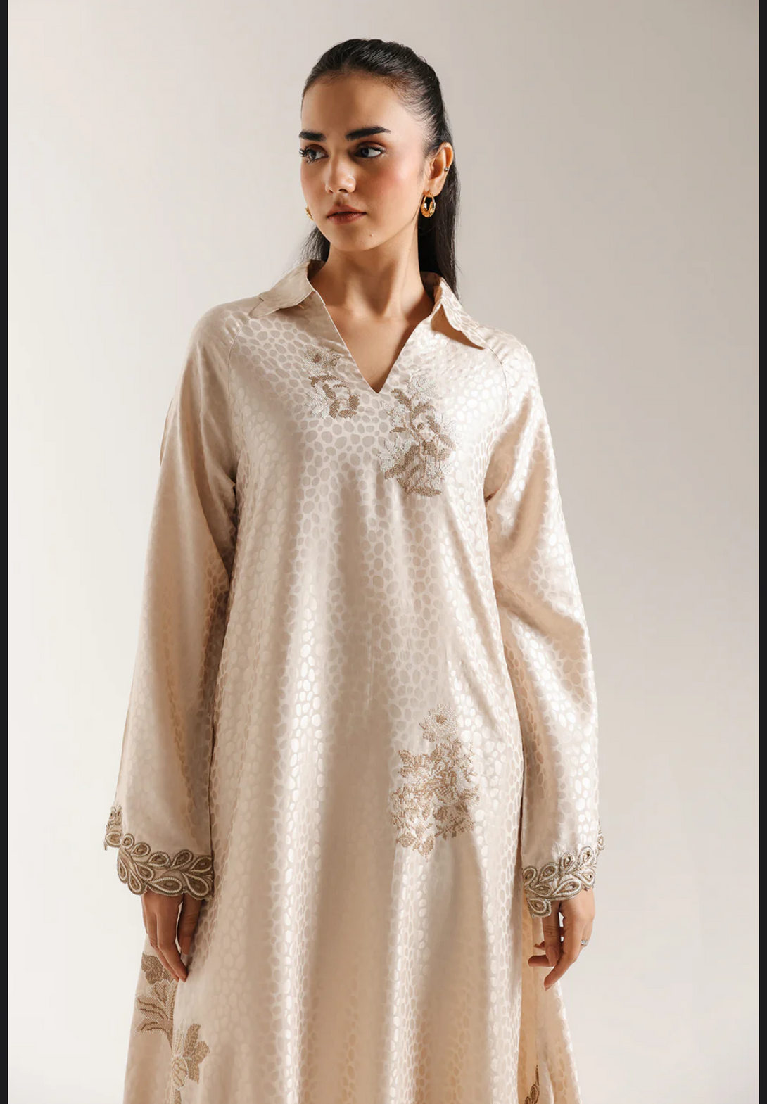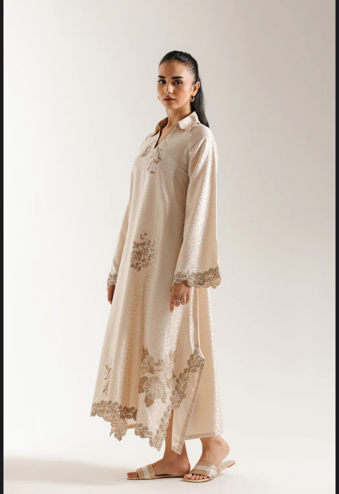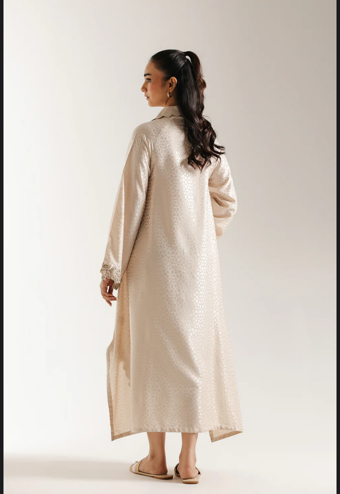 DRESS - LOOSE FIT - COLLAR NECK WITH V SLIT - FLARED SLEEVES - LOW SIDE SLIT - SCALLOPED HEM - LONG LENGTH