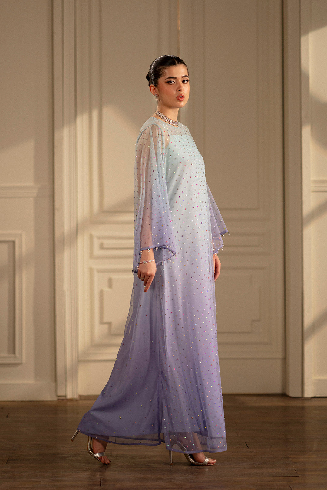 - This whimsical lilac net dress in a ombre of pastels glimmers with multicolored crystal. embellishemnts all over.Paired with an ombre inner dres to highlight the color gradient. Pair it up with "Kipar Dupatta" to complete the look.