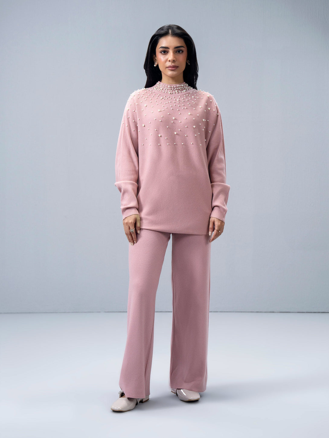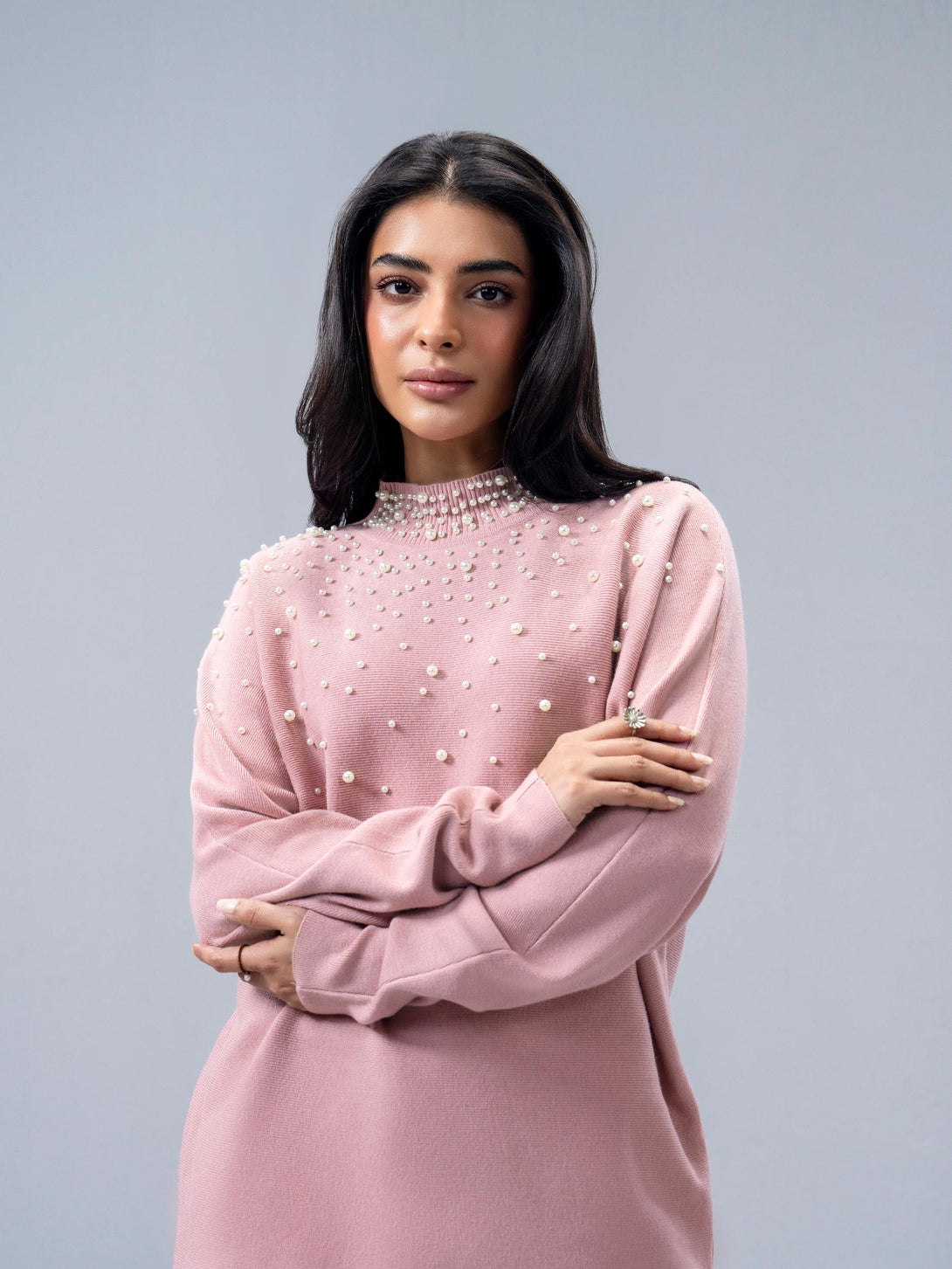 - Pearl embellished round neck knitted top