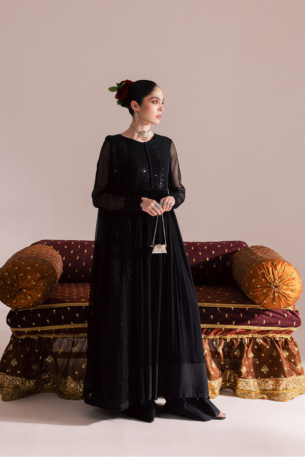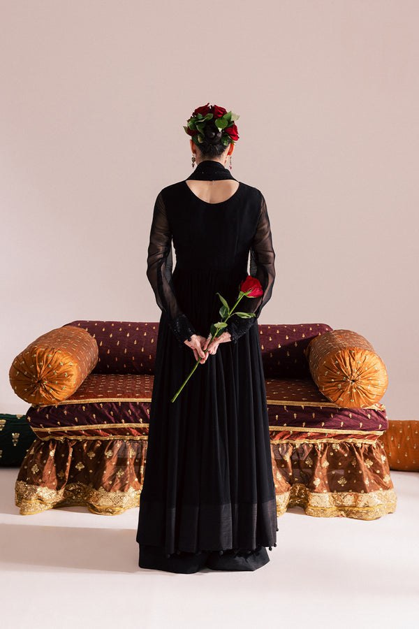 Black embroidered chiffon pishwas paired with an embroidered chiffon dupatta and plain raw silk flared trousers.