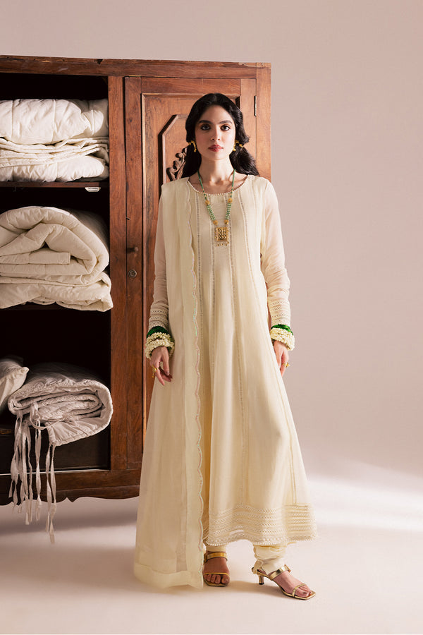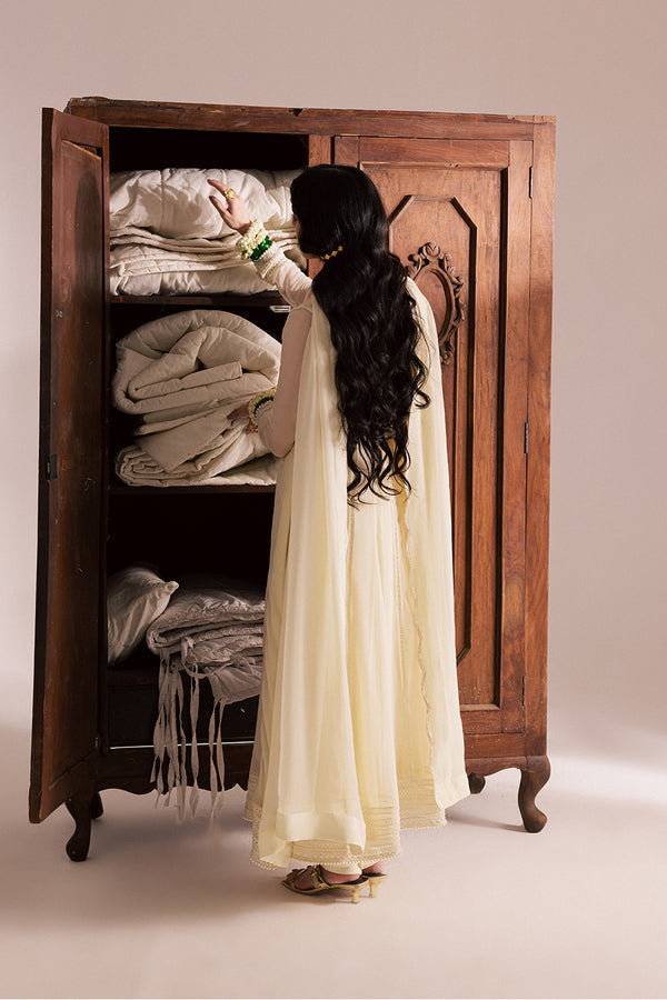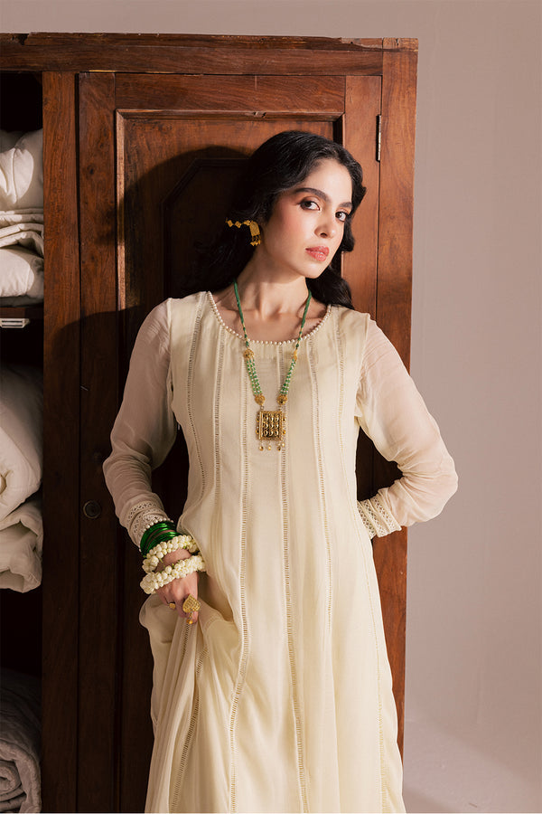Plain white chiffon Anarkali adorned with lace and pearl detailing, paired with embroidered chiffon dupatta and raw silk churidar