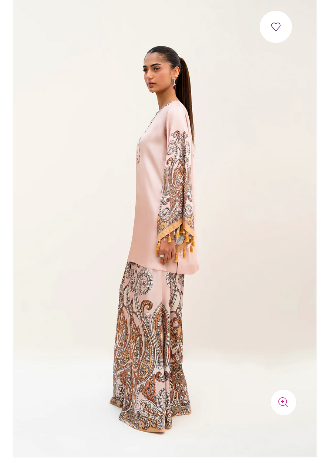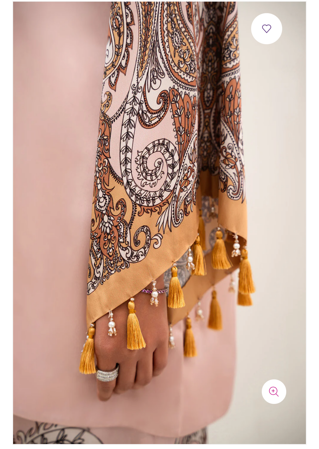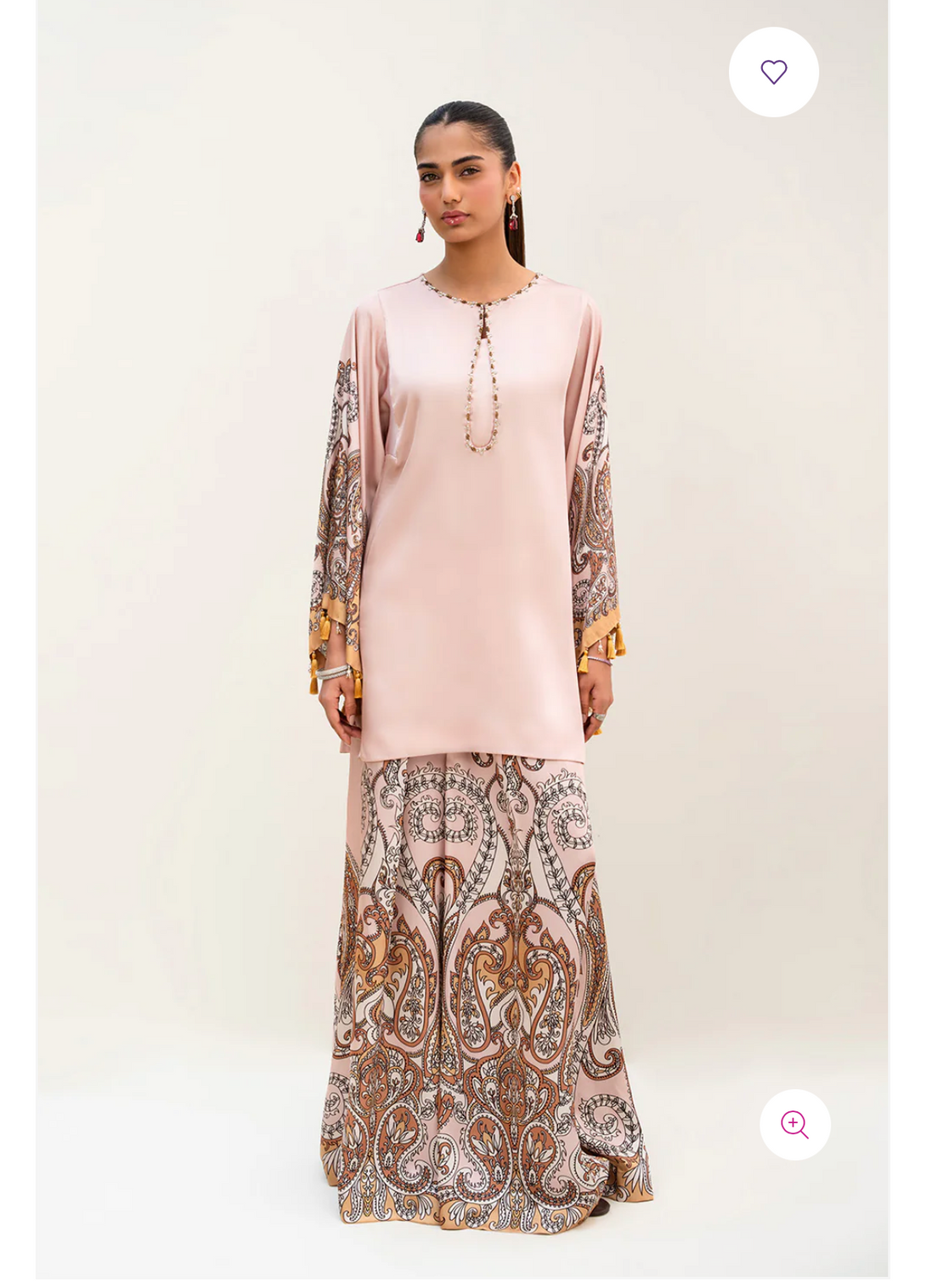 - This top made in soft charmeuse silk fabric in print features crew neck, front keyhole, square armholes, full length flared sleeves, tassel & crystal hangings along the sleeve hem and side slits. The top has an intricately embellished neckline.