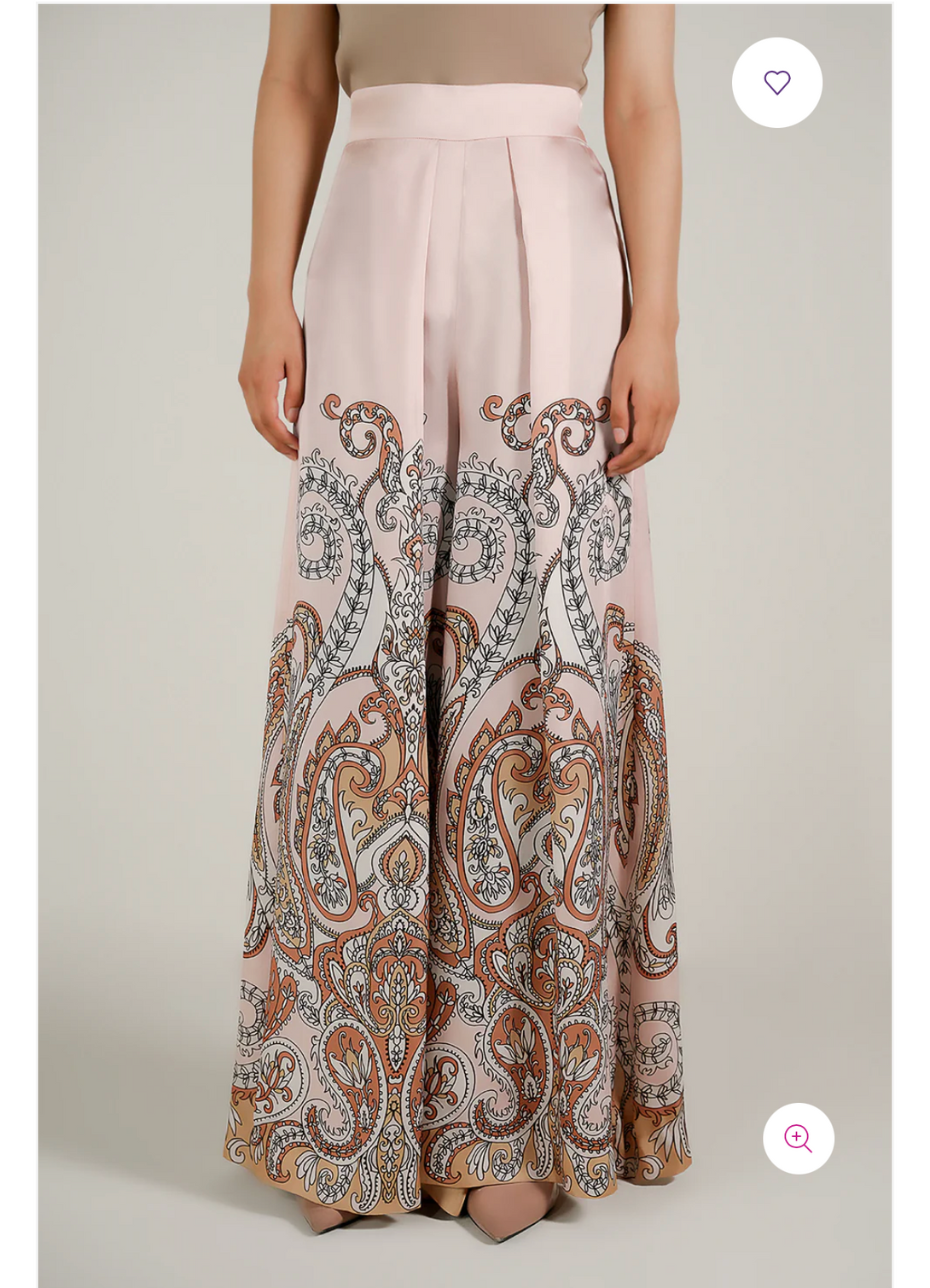 - These flared pants made in soft charmeuse silk fabric in print fabric features semi-elasticated waist band, side zipper opening, hook & eye closure, front pleats, side pockets and flared hem.