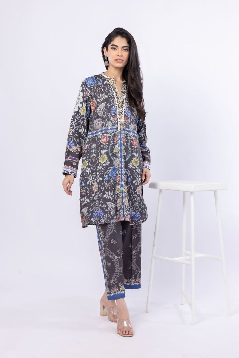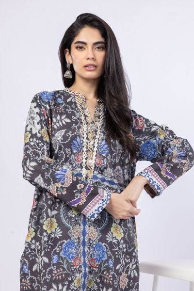 - Description: A short floral printed embroidered kurta featuring full sleeves and a round neckline with a V-cut.