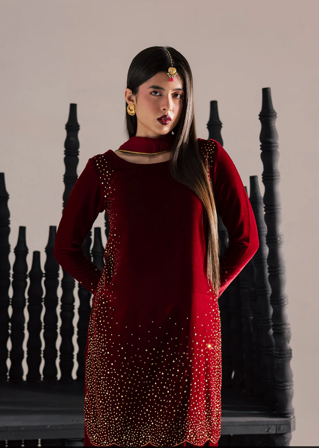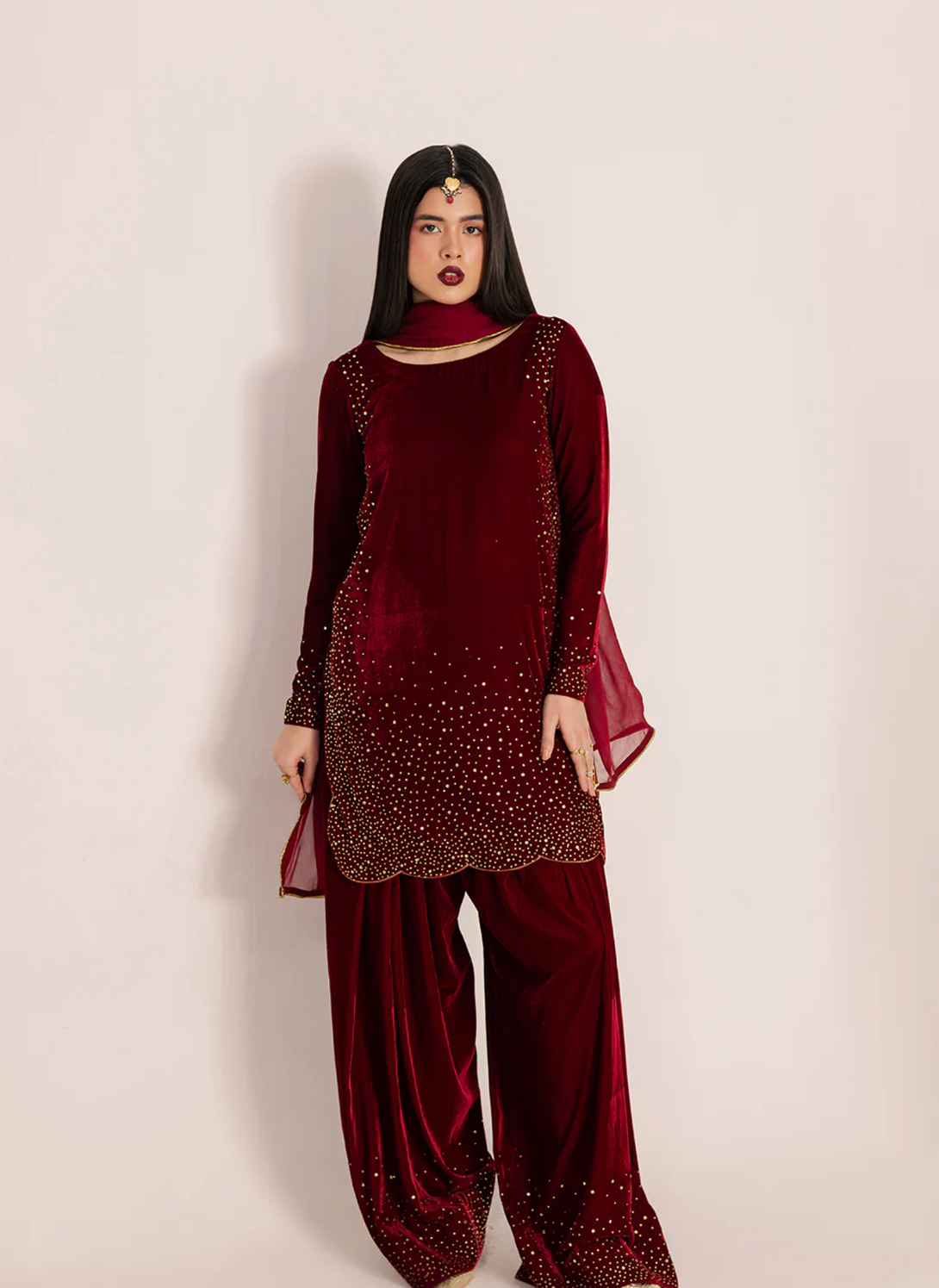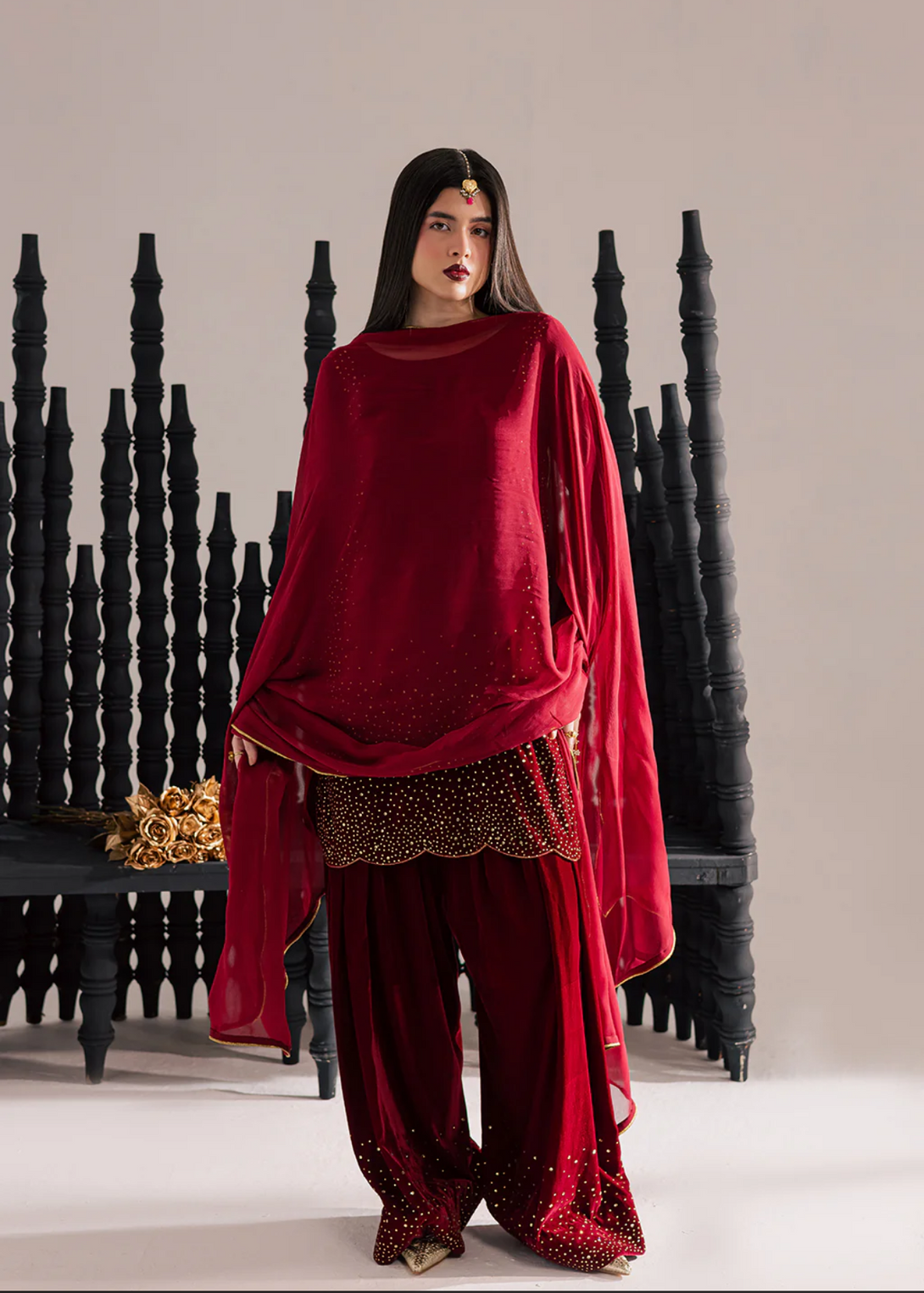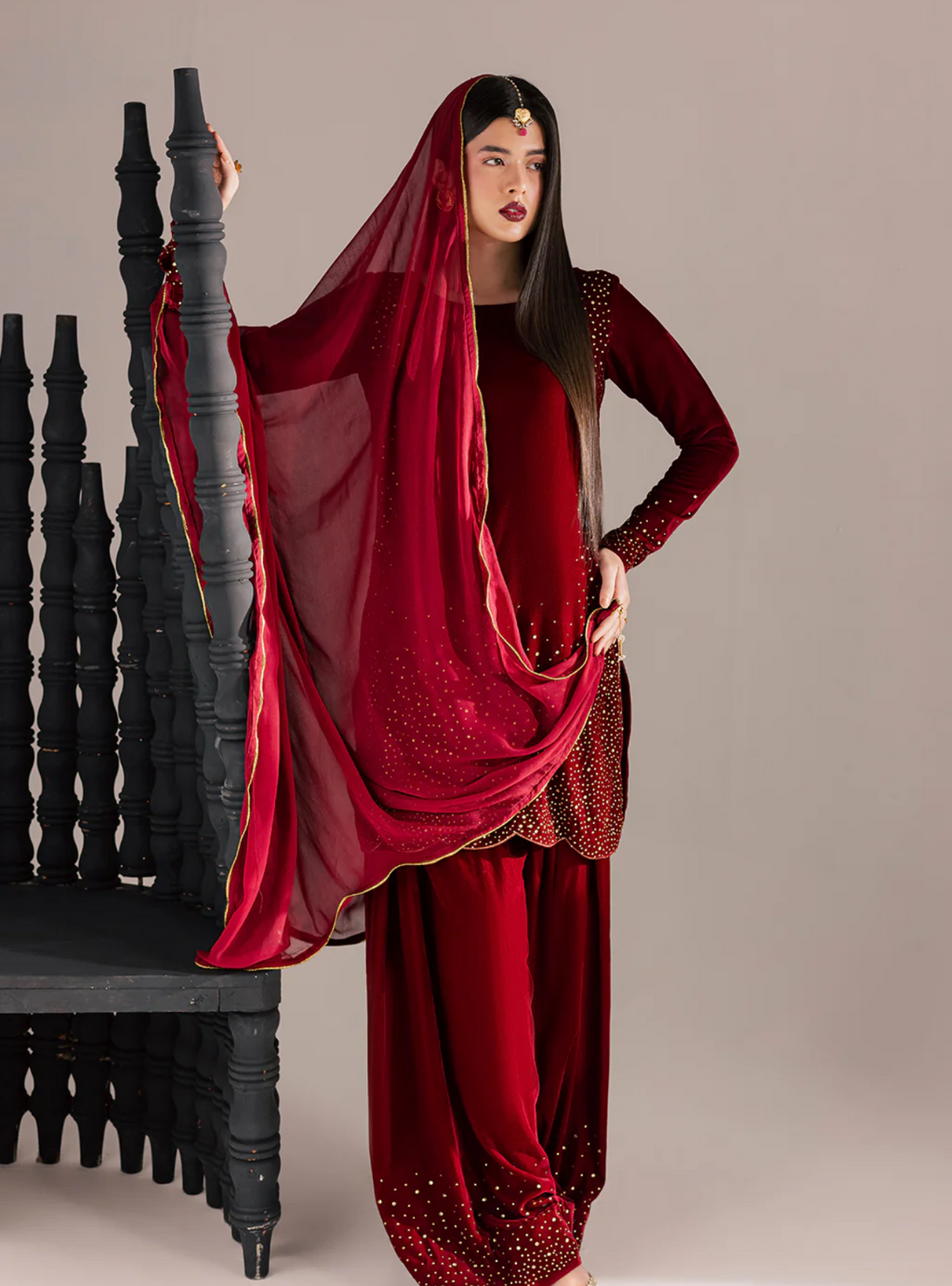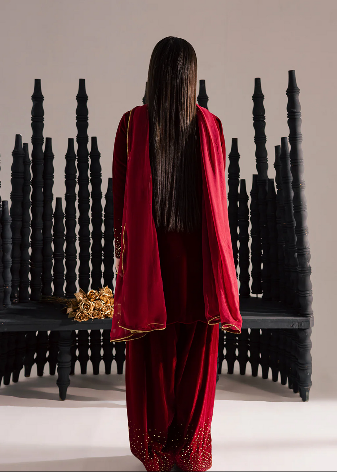 A premium red hand embellished stonework velvet shirt paired with hand embellished stone work farshi shalwar and chiffon dupatta
