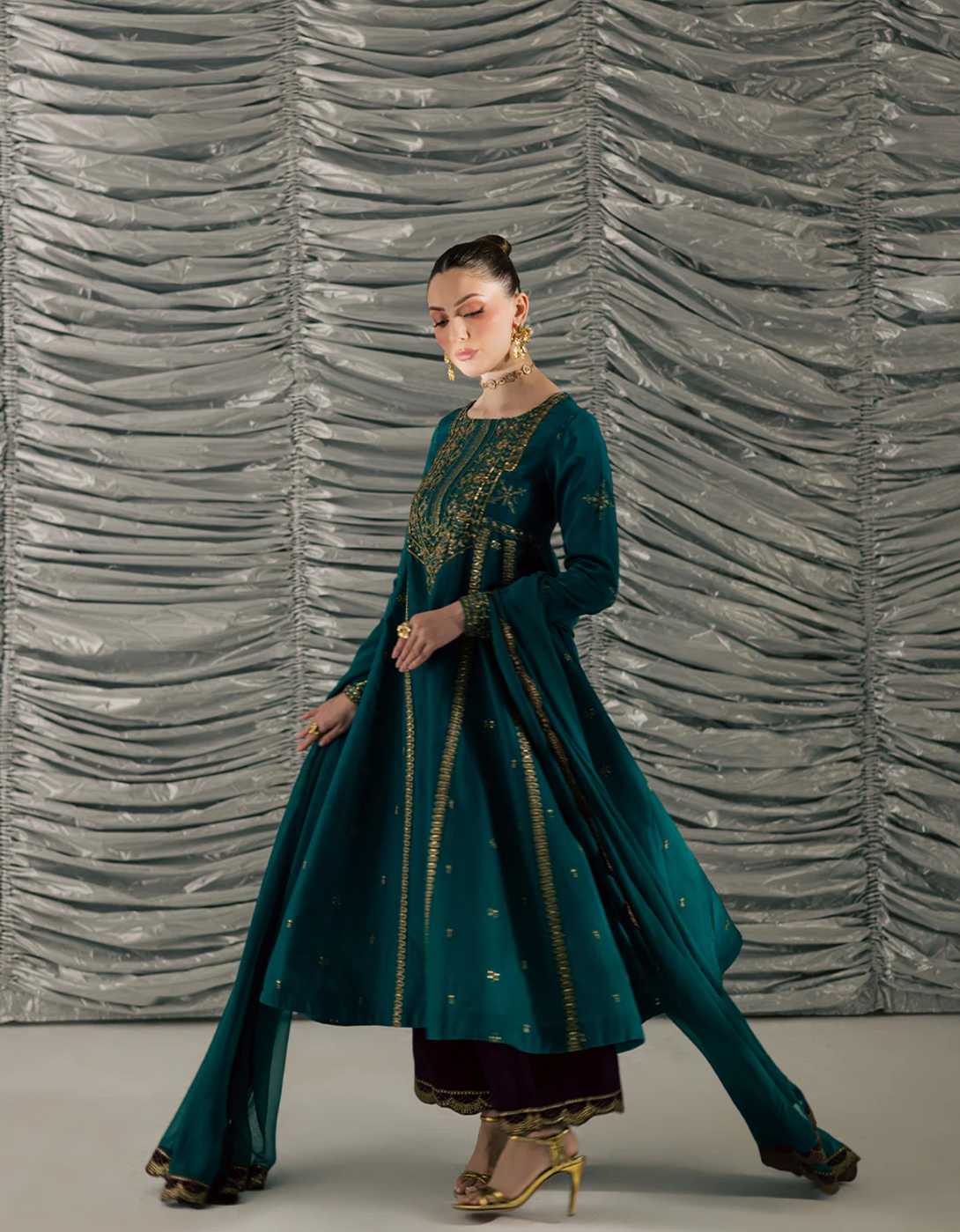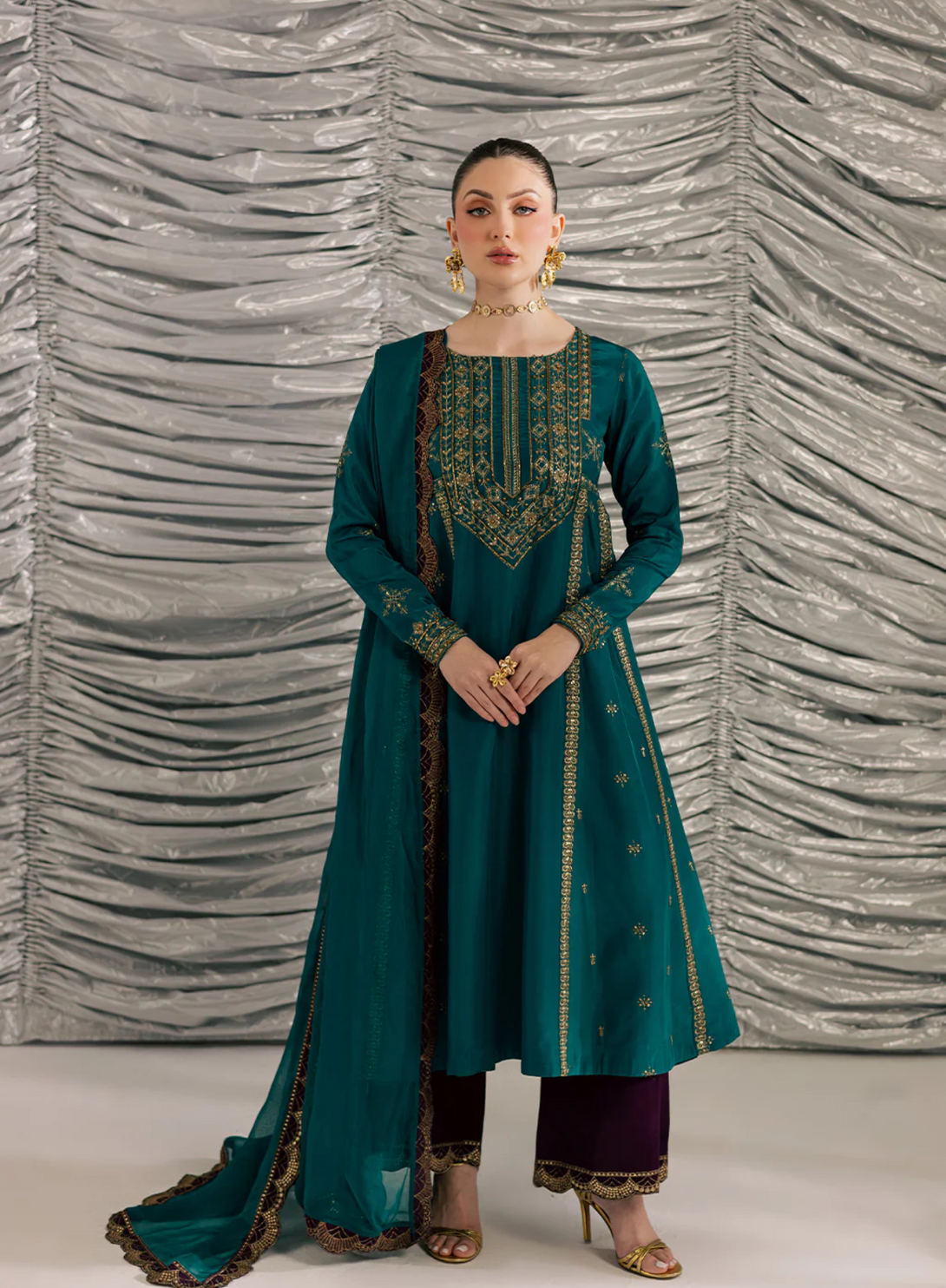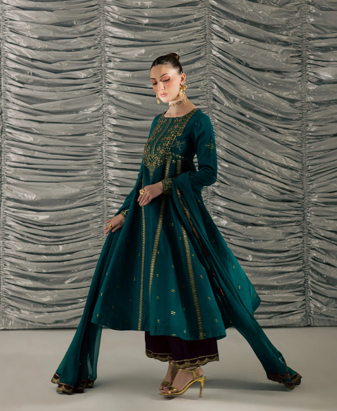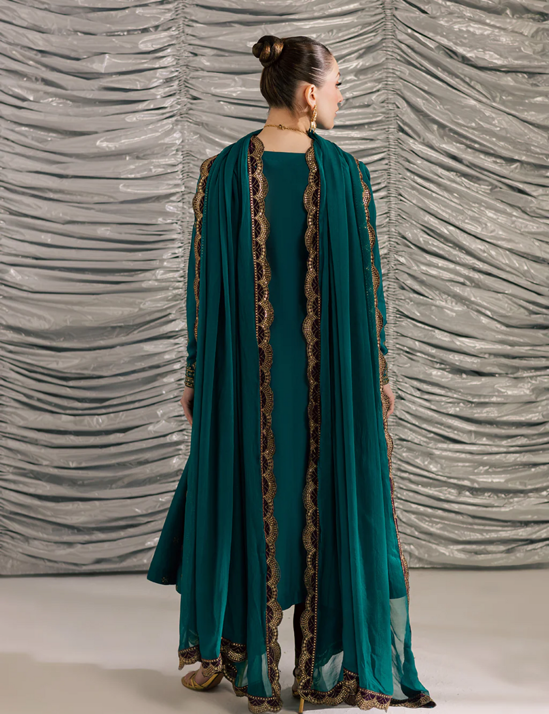 Embroidered and embellished silk shirt paired with embroidered silk trouser and embroidered chiffon dupatta.