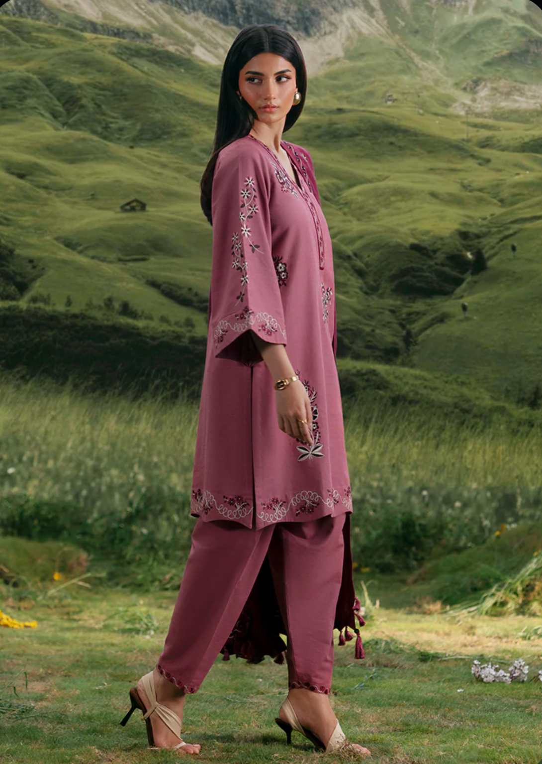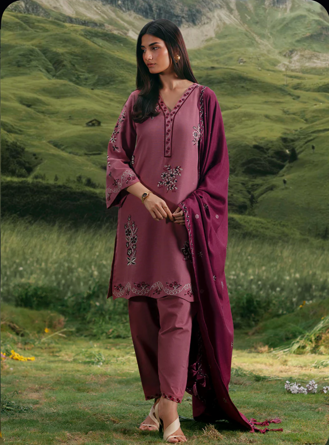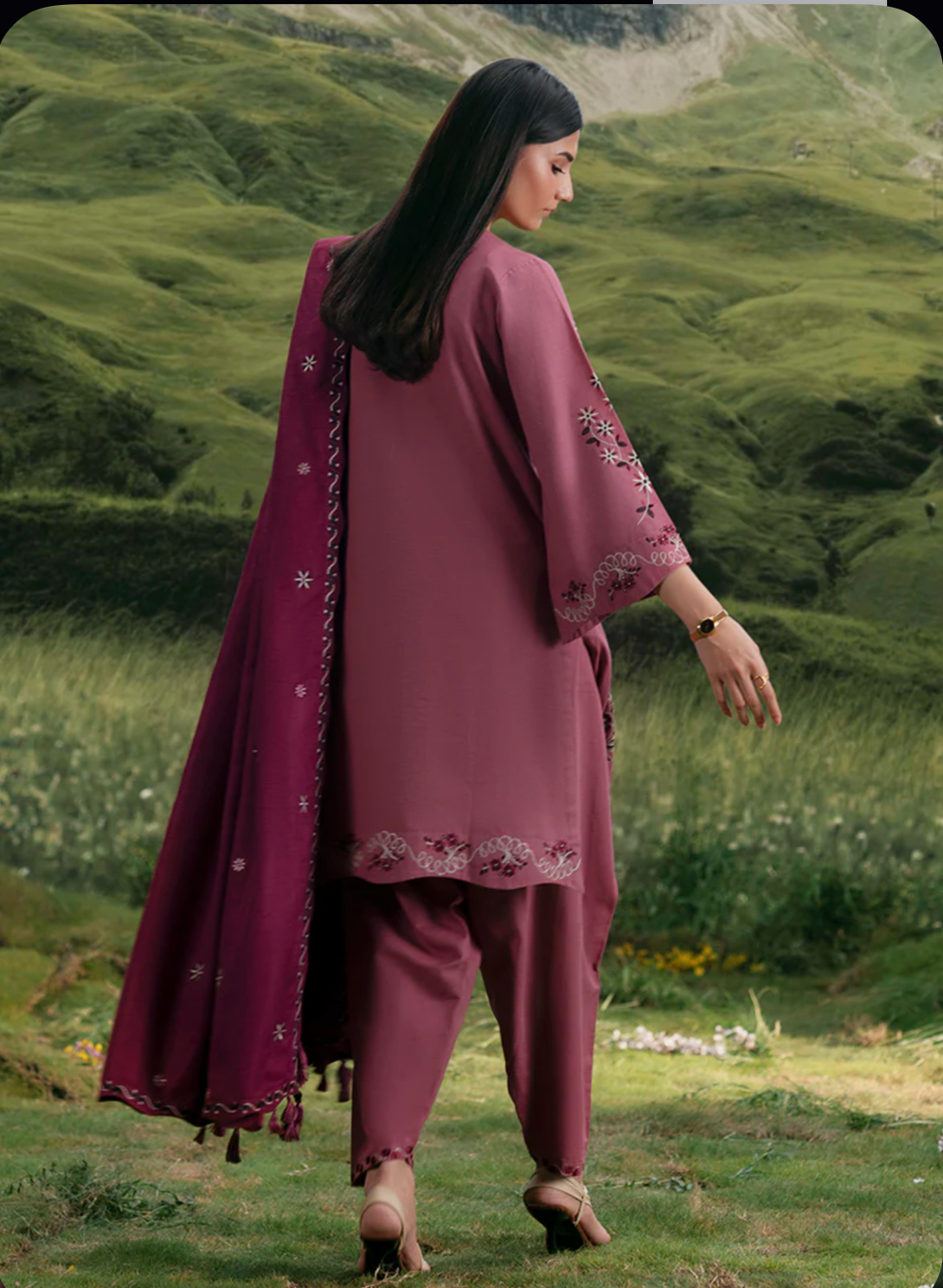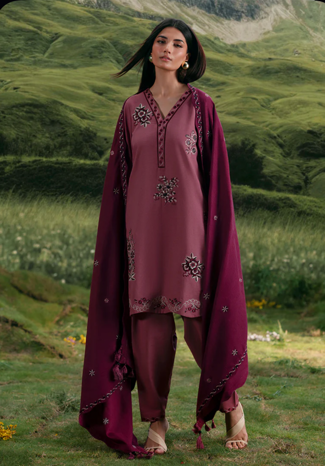 Leyan in Garnet Pink/Crimson from our Winterkari '25 Collection. An embroidered khaddar 3pc unstitched outfit paired with khaddar trousers & an acrylic shawl.