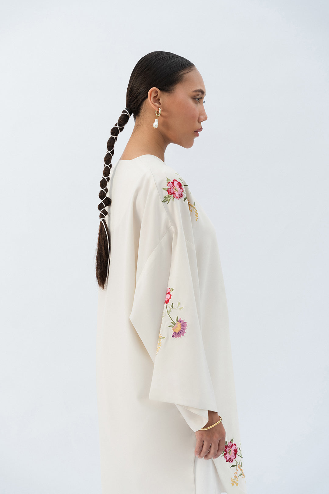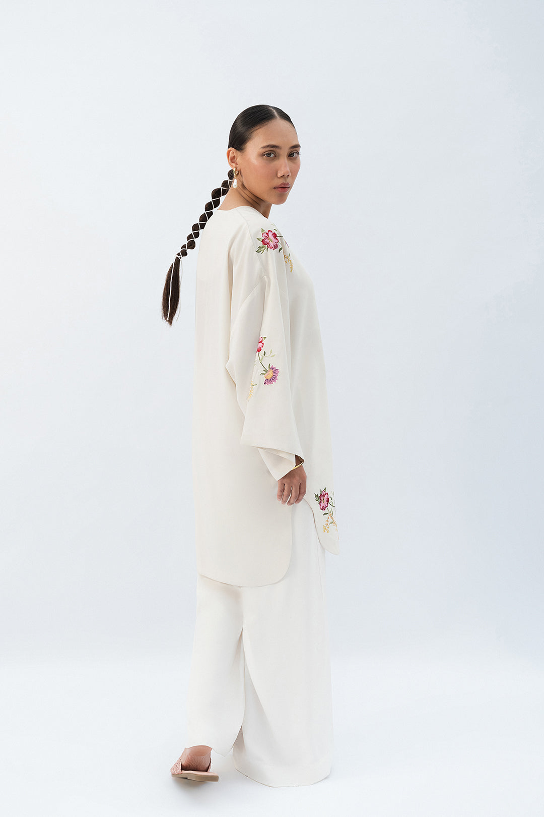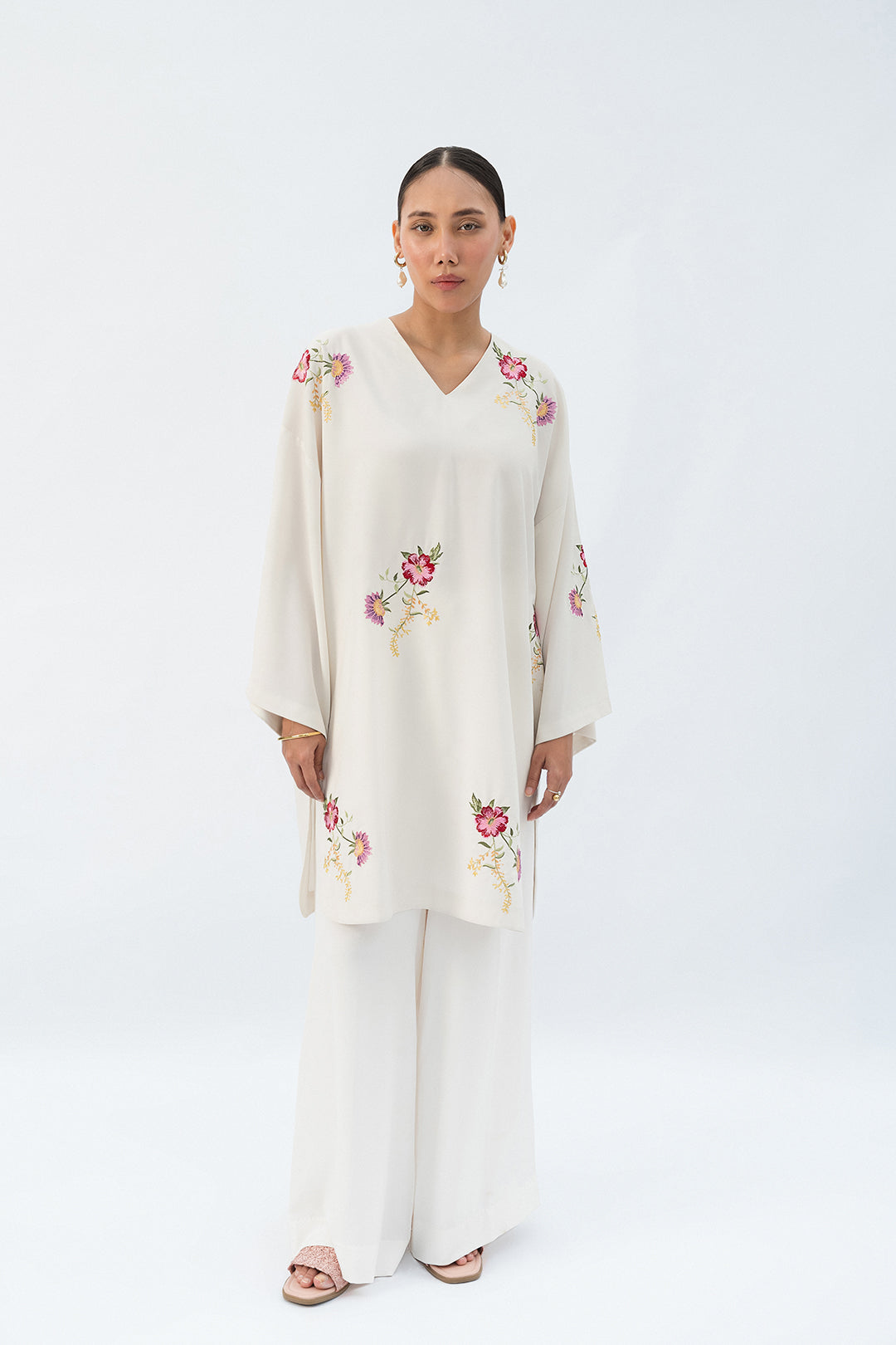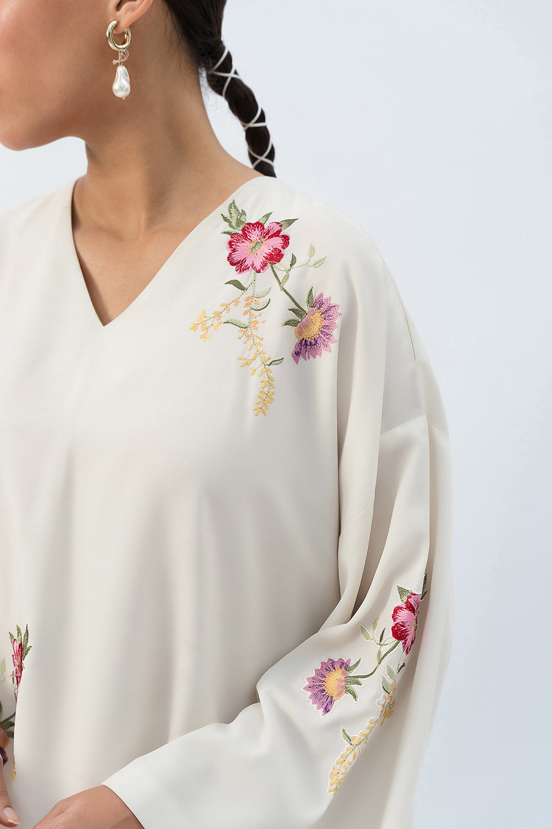 This embroidered beige top made in soft crepe fabric features V-neck, batwing sleeves, side slits and round hem.