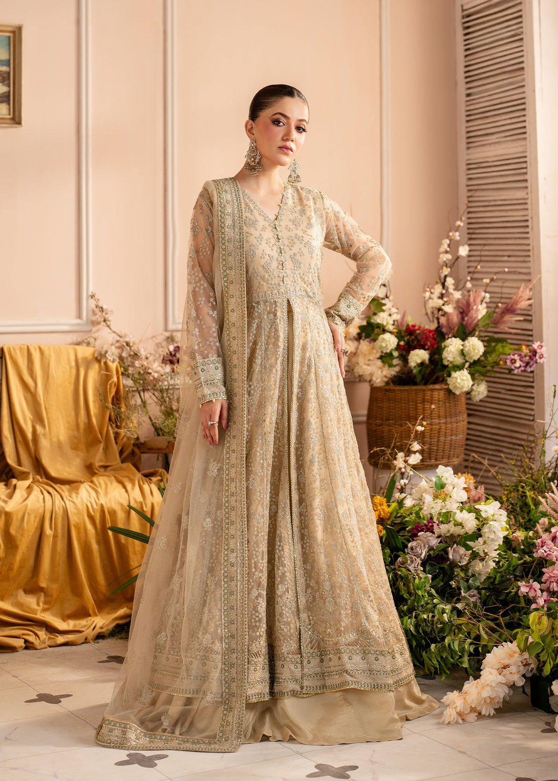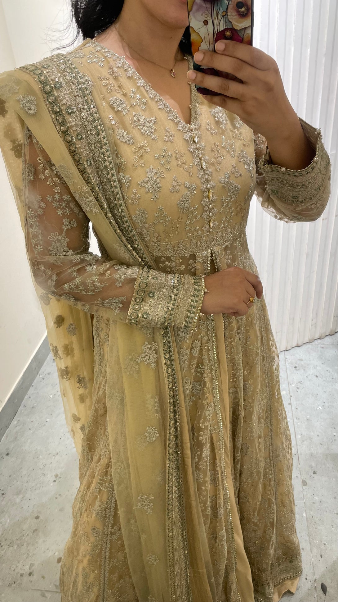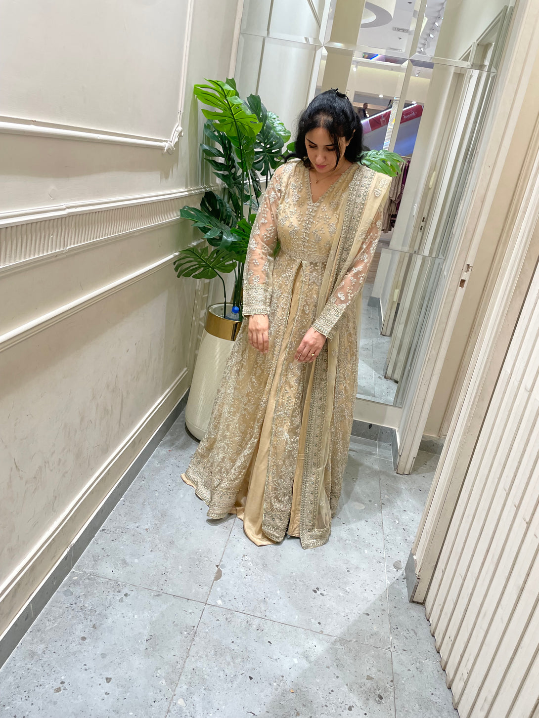 The stunning net pishwas features a luxurious silk lehnga, creating an exquisite blend of elegance and sophistication. The pishwas is adorned with intricate, detailed embroidery, elevating its charm, while the all-over spray adds a touch of grace. The embroidered borders of the net dupattaand embroidered spray allover the dupatta further enhance the ensemble, making it a perfect choice for any special occasion.