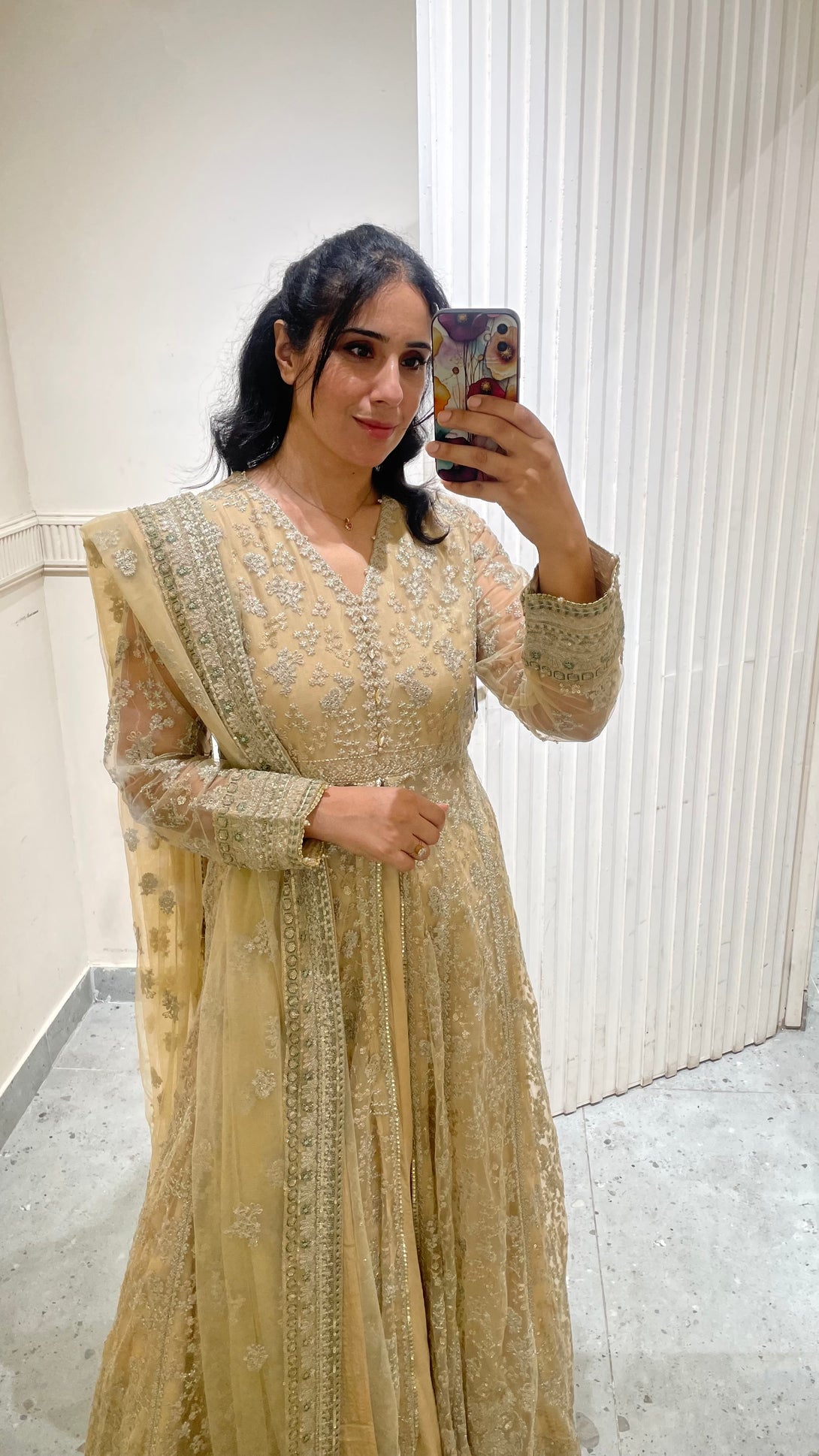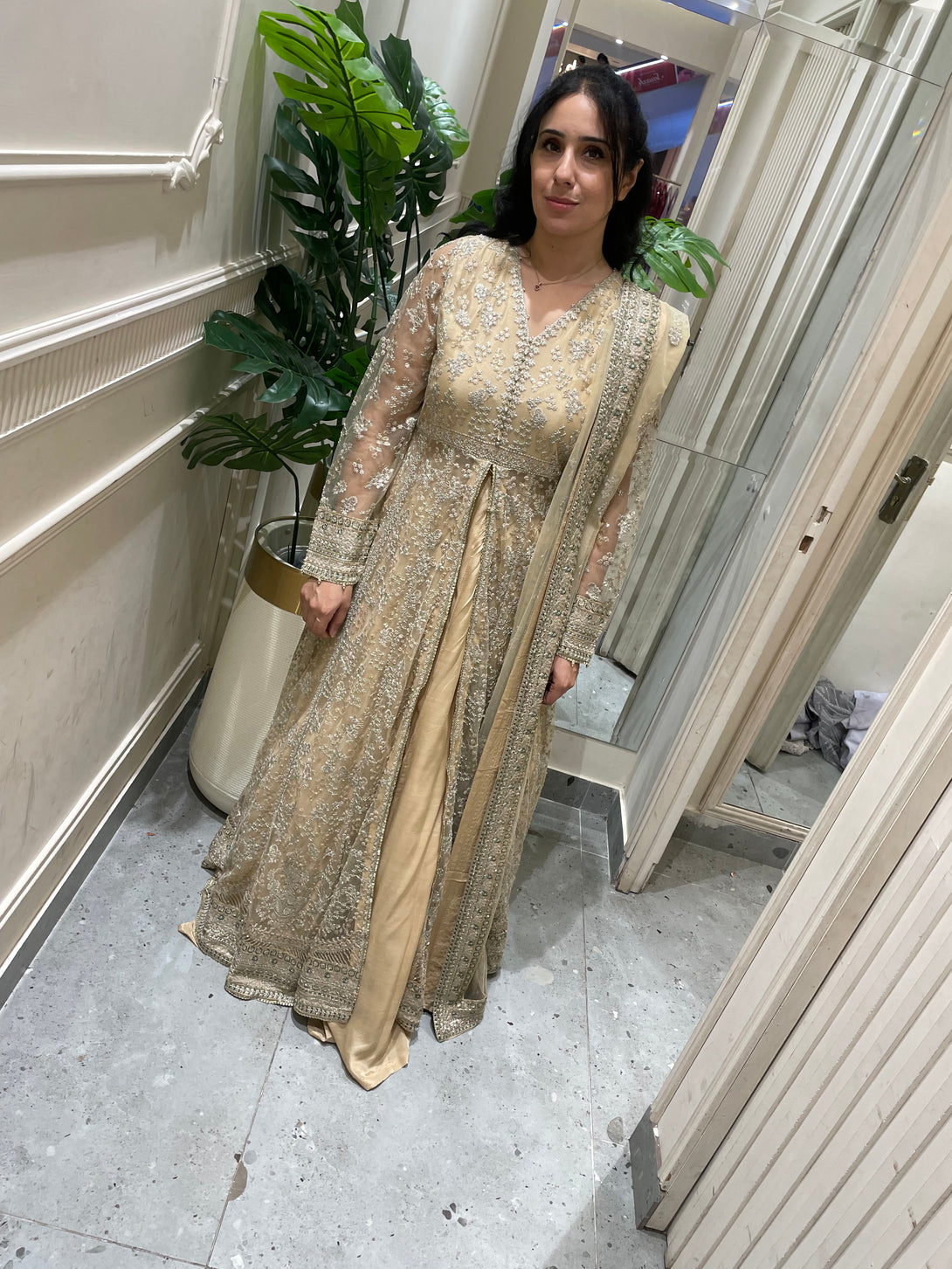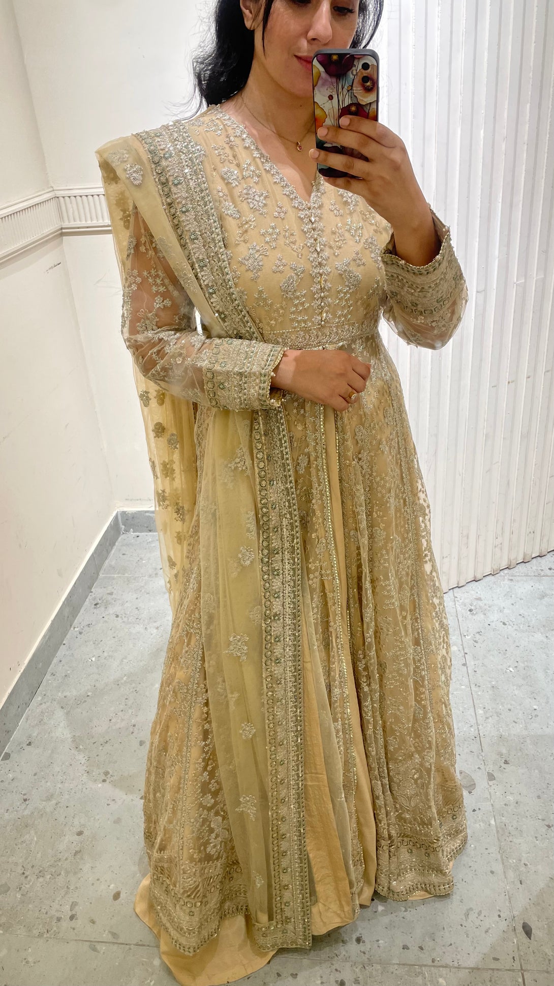 The stunning net pishwas features a luxurious silk lehnga, creating an exquisite blend of elegance and sophistication. The pishwas is adorned with intricate, detailed embroidery, elevating its charm, while the all-over spray adds a touch of grace. The embroidered borders of the net dupattaand embroidered spray allover the dupatta further enhance the ensemble, making it a perfect choice for any special occasion.