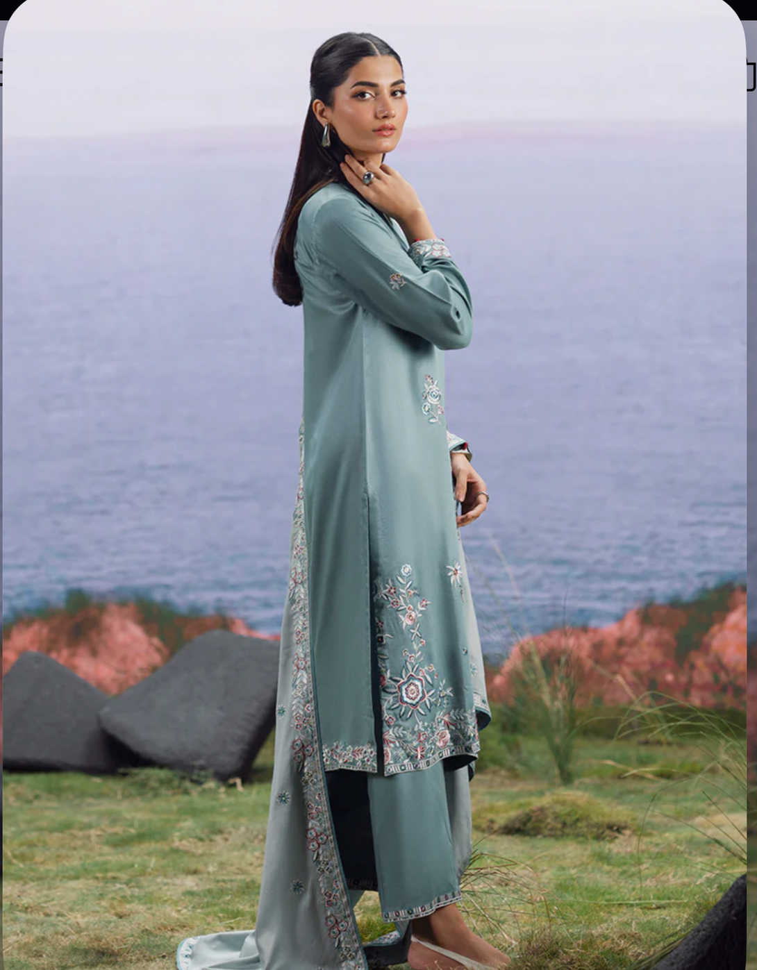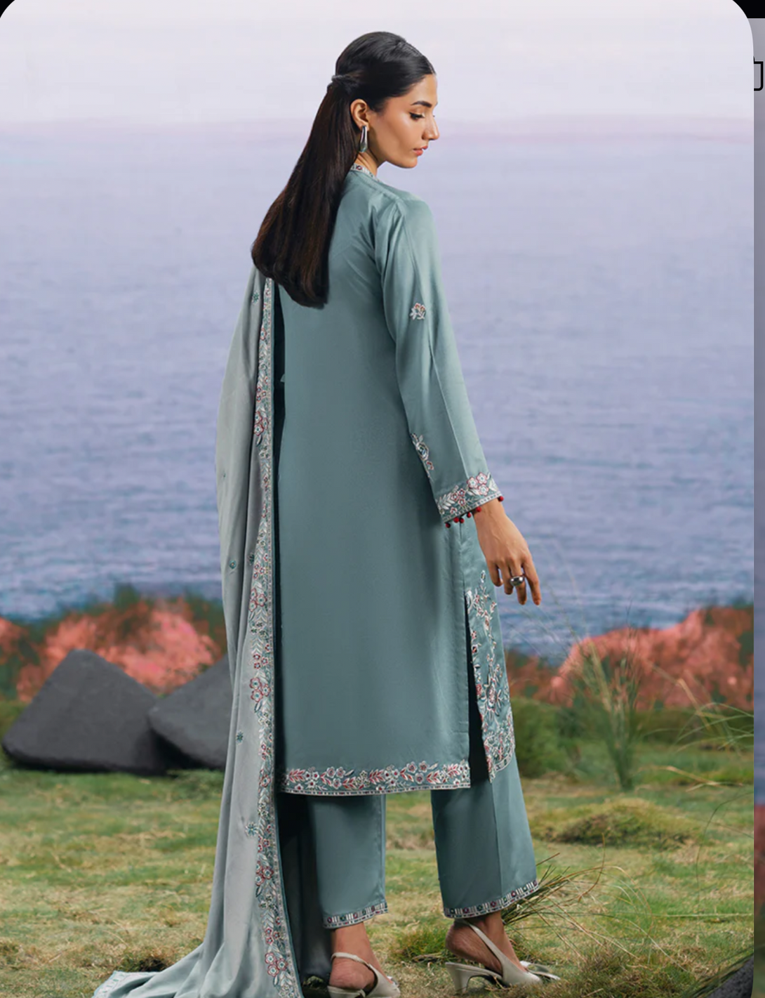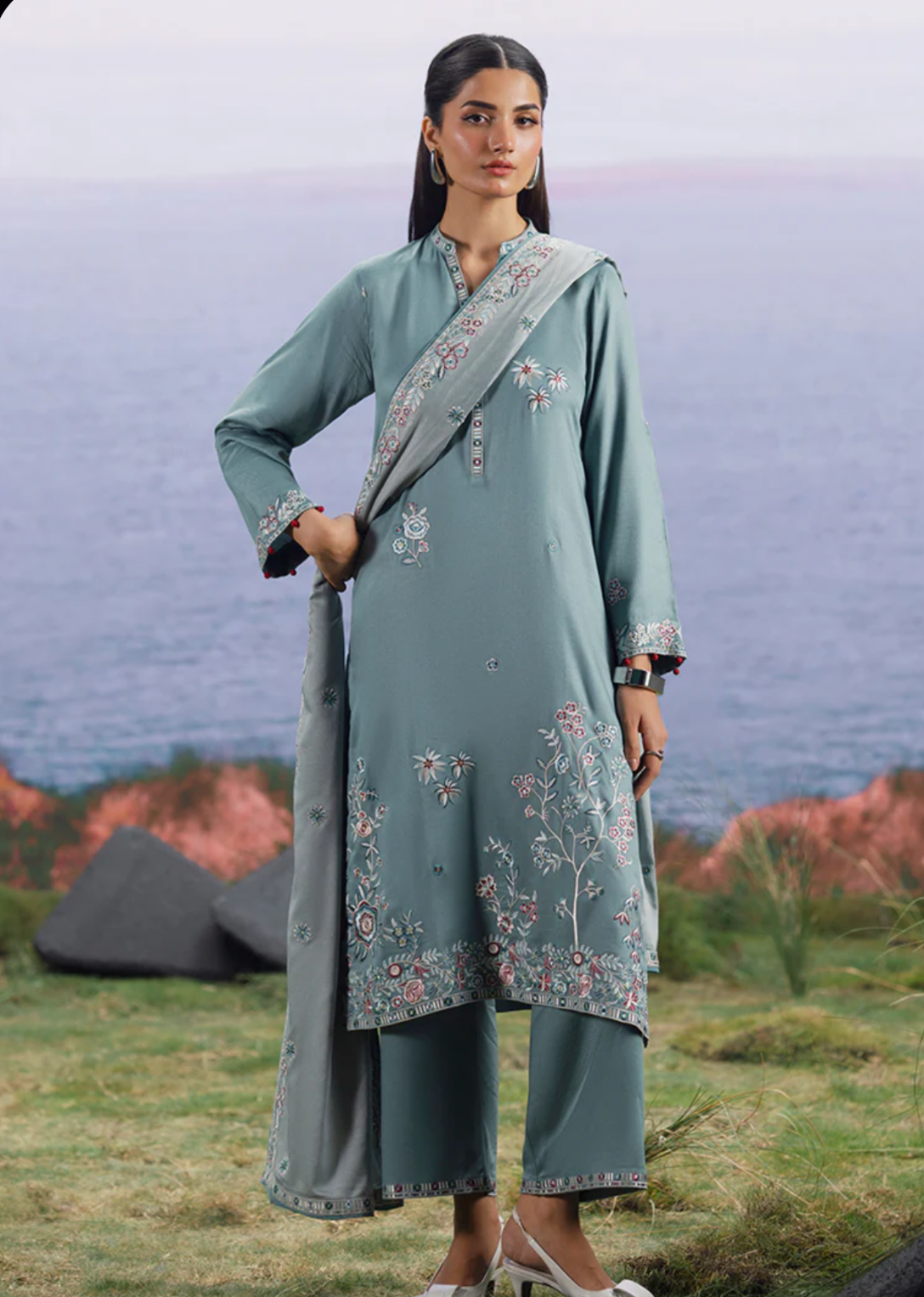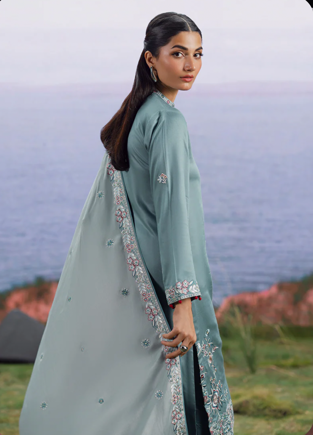 Melis in Dark Seafoam Green/ Light Seafoam Green from our Winterkari '25 Collection. An embroidered twill viscose 3pc unstitched outfit.