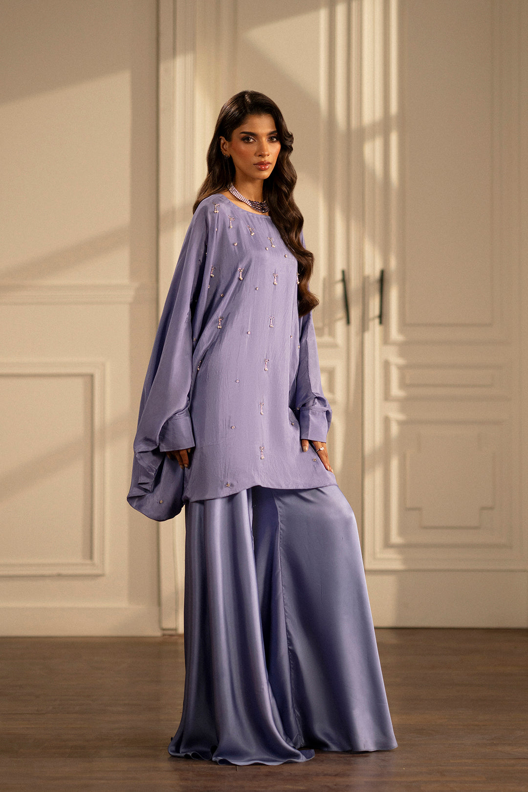 - This whimsy periwinkle top in a batwing cutline is embellished with small crystal bows .The cut is accentuated with cuffs on the sleeves. Pair with flared "Melorai Pants" to complete the look.