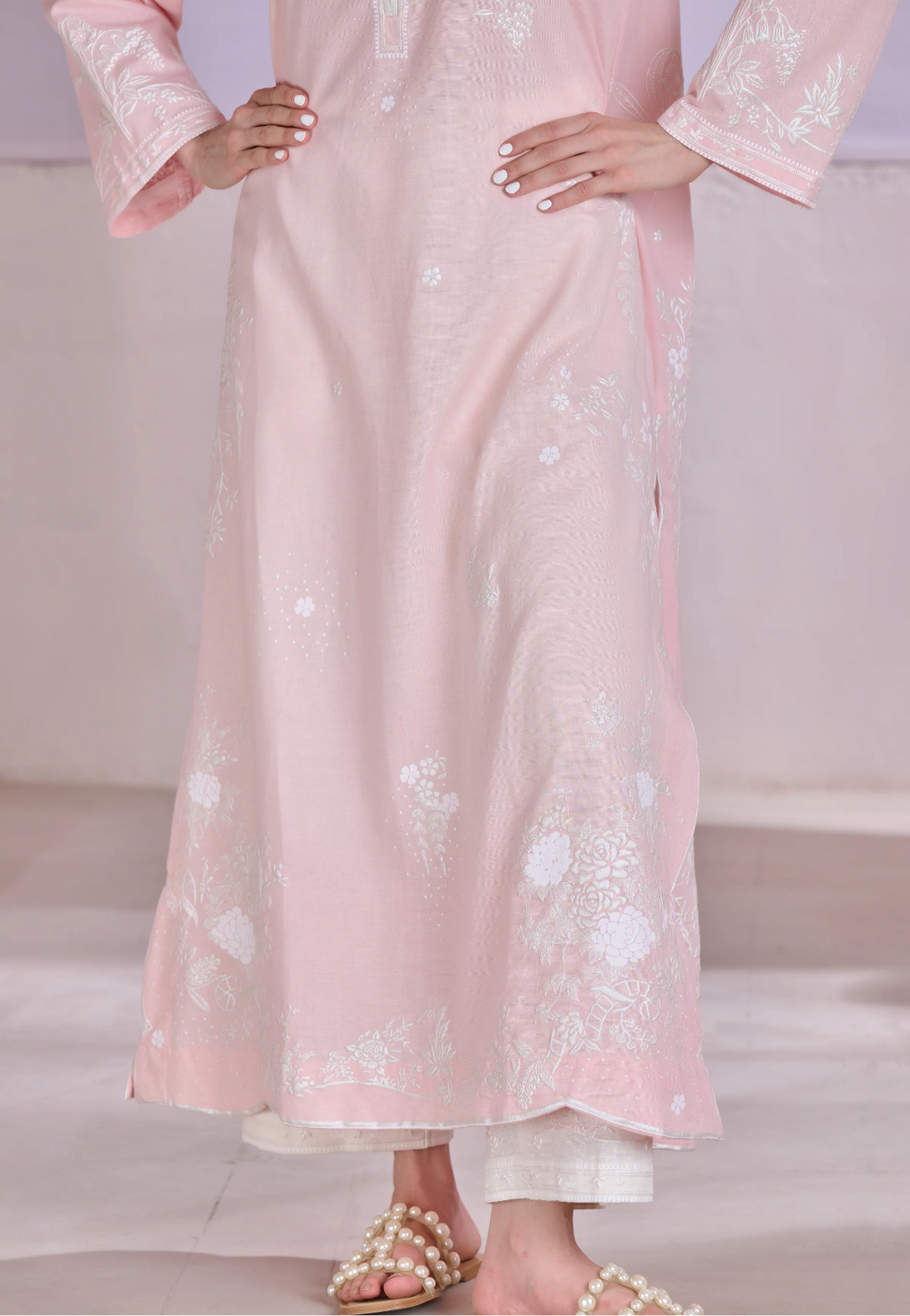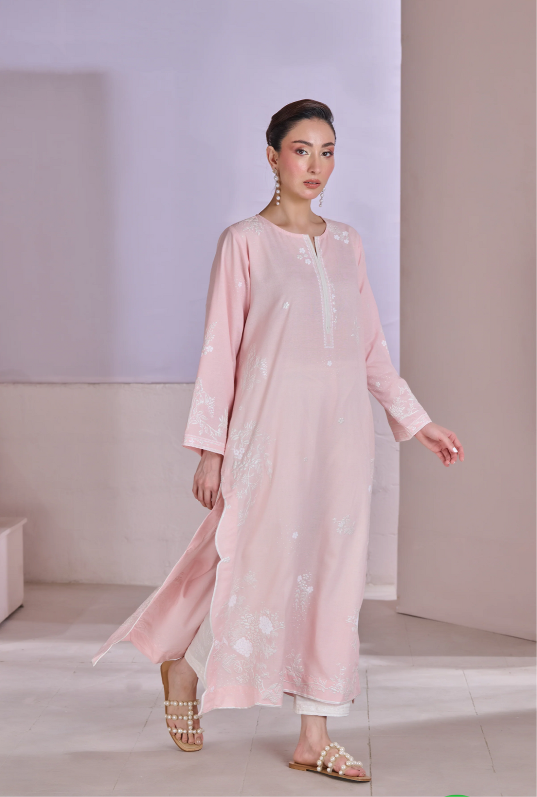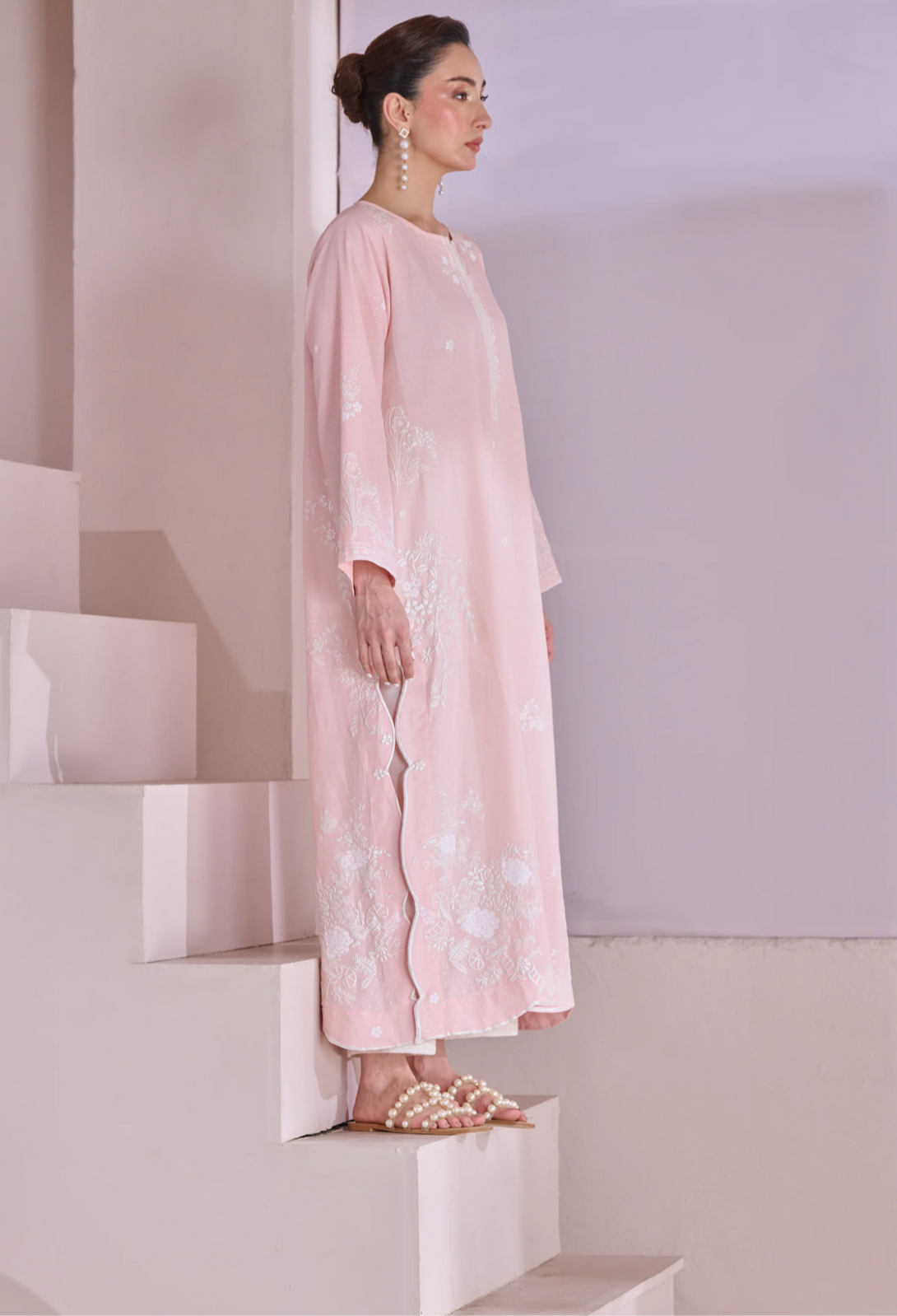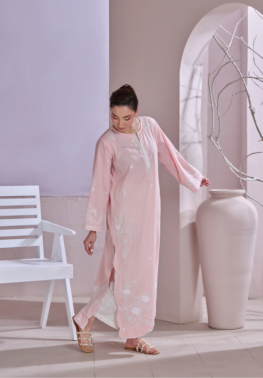 Description: This kaftan shirt features a soft blush pink base with relaxed, comfortable fit. It’s decorated with light Off White and pearl floral prints that add a delicate touch. The pearl detailing is embossed, giving the fabric a nice mix of smooth and raised textures for subtle contrast. Overall, it’s a stylish and easy-to-wear piece with gentle, elegant details on shirt and trousers.