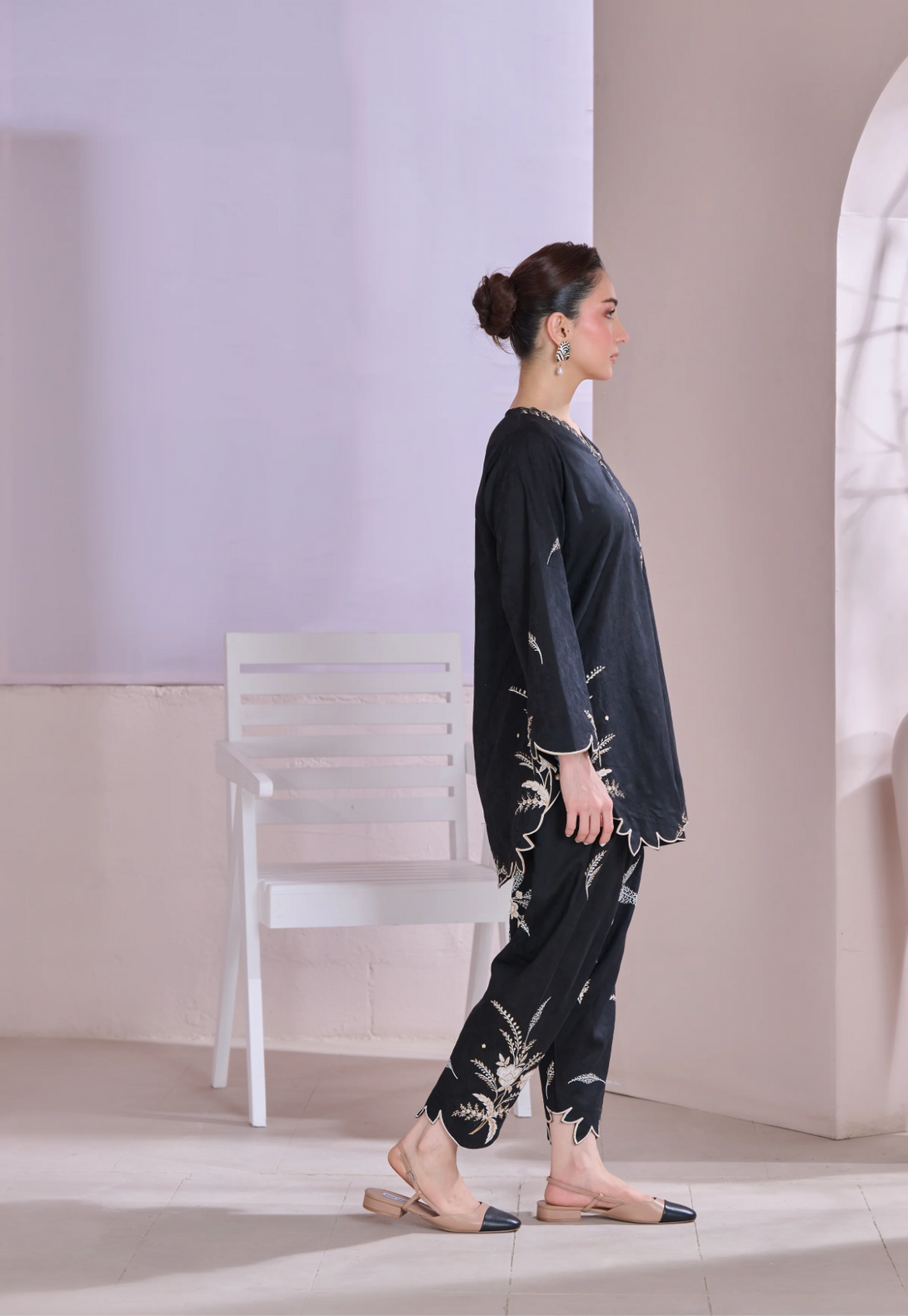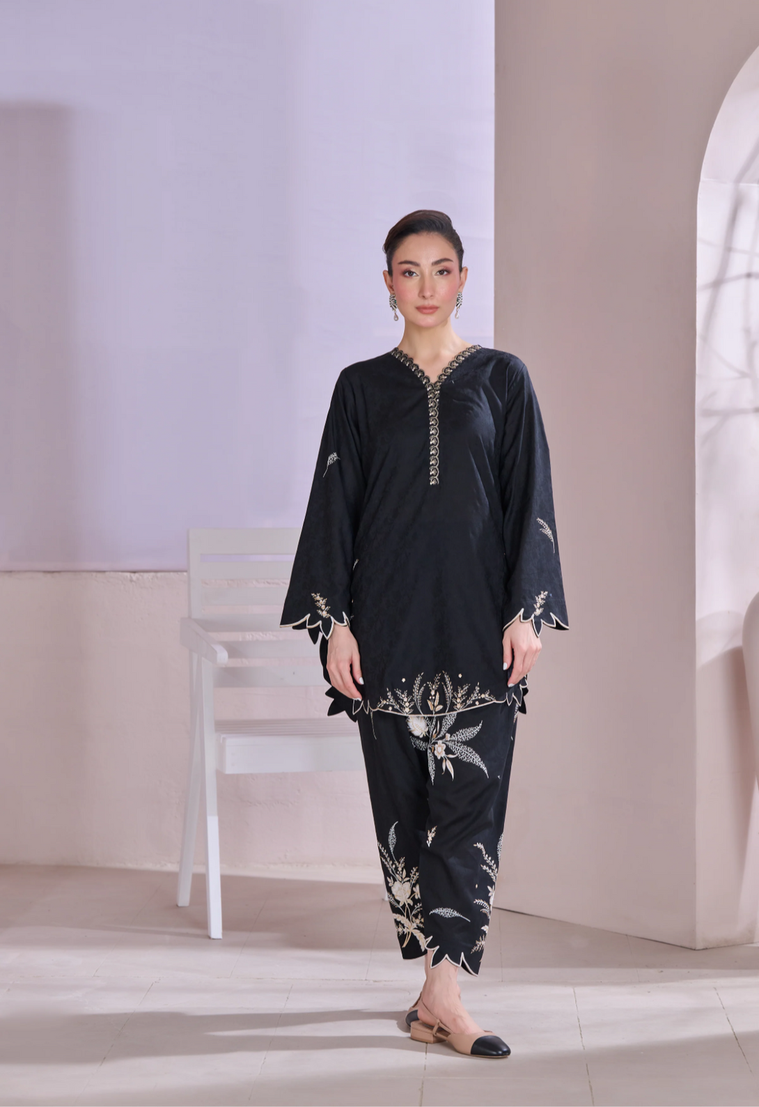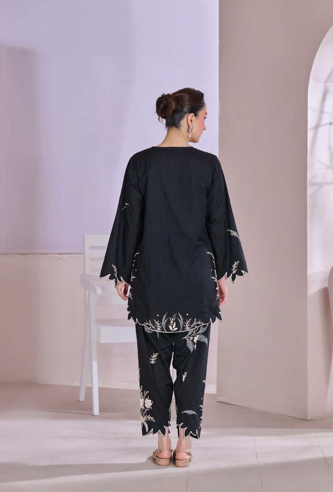 Description: This outfit features a rich black jacquard fabric with contemporary floral patterns screen printed in shades of off-white and gold, adding a refined contrast to the dark base. The scalloped edges on the sleeves, hem, and pant cuffs add a stylish touch. Off White is embossed while the gold detailing around the neckline brings in a bit of shine without being too bold. It's a balanced look—modern, elegant, and perfect for both day or evening wear.